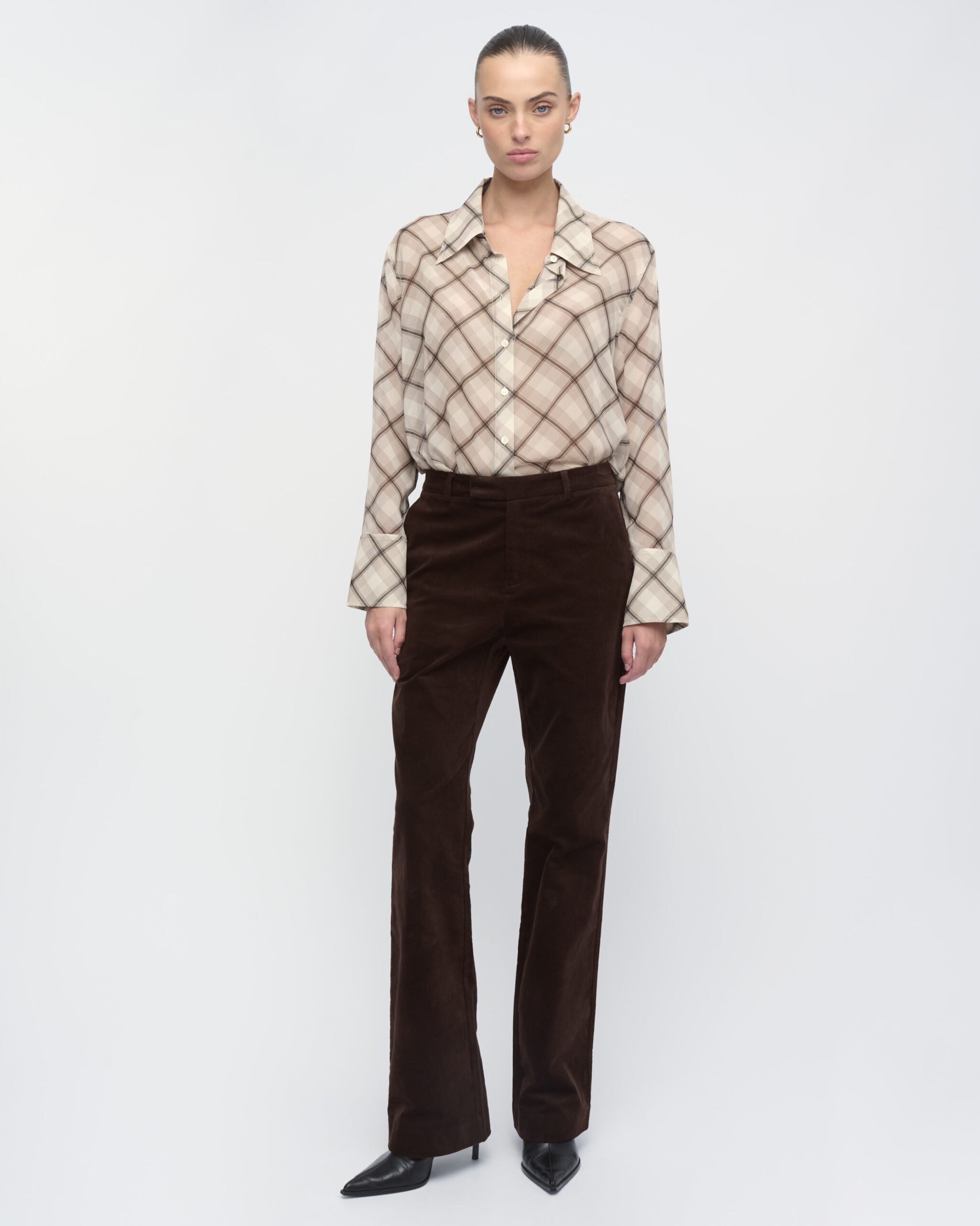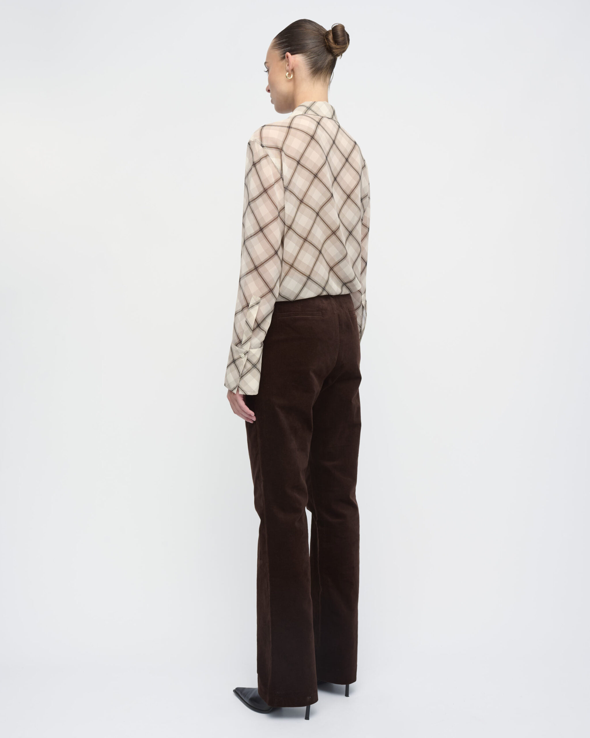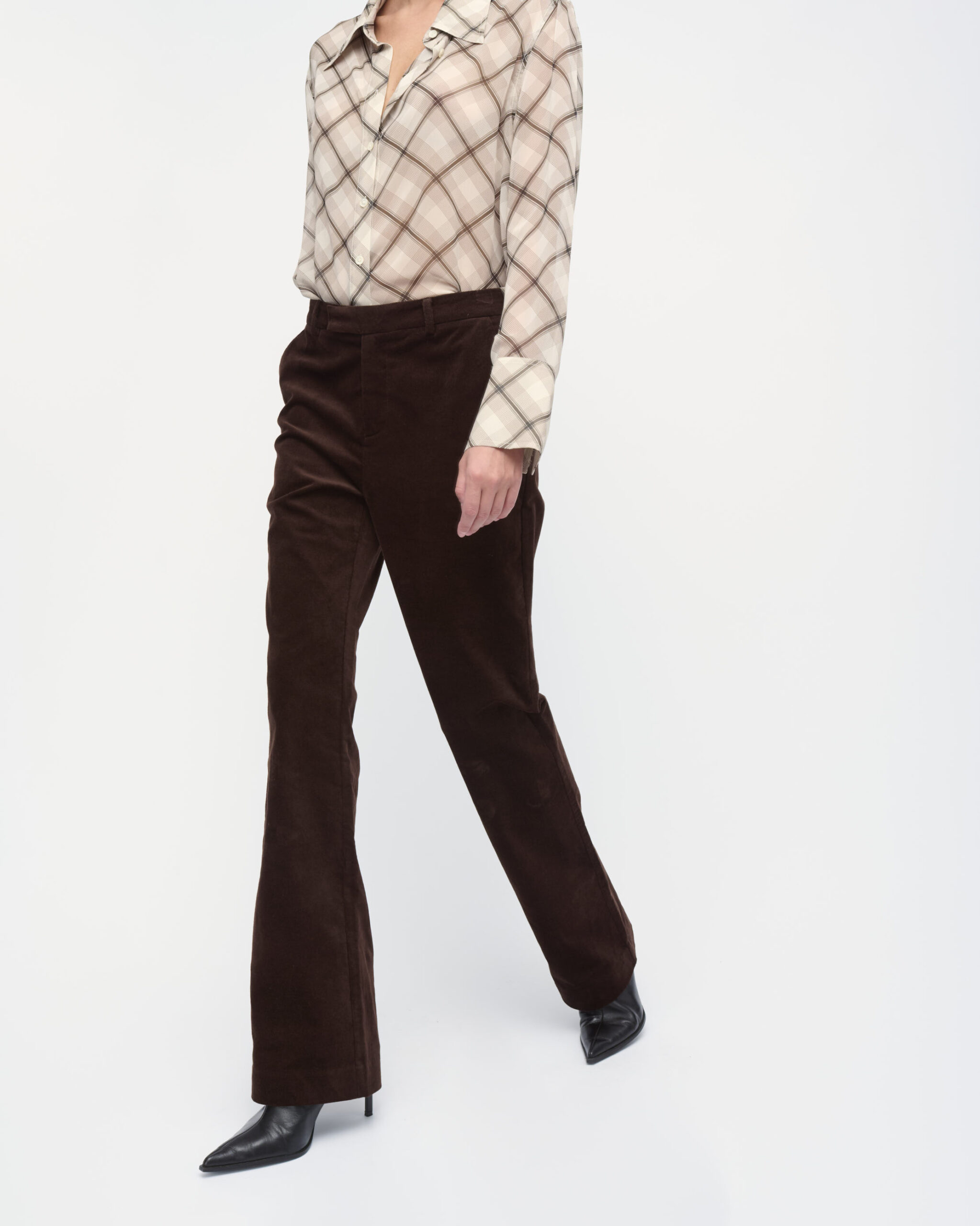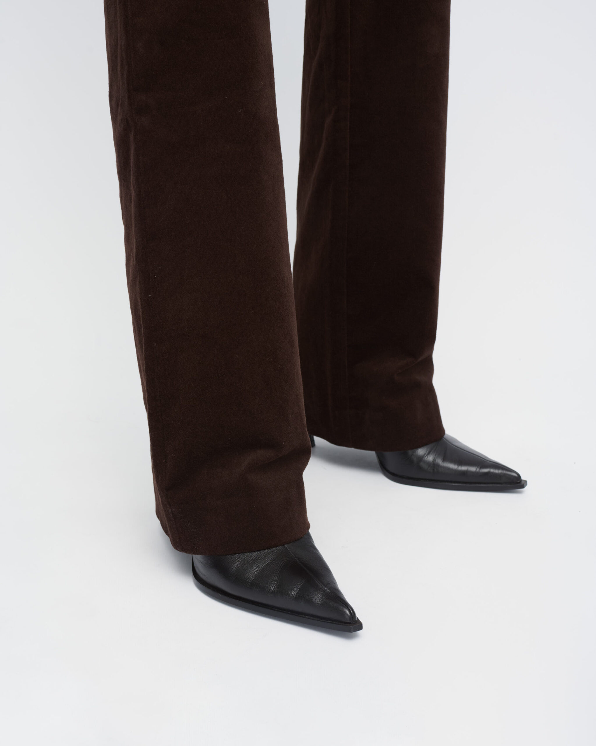 מכנסיים מקטיפה ליקרה, צללית צמודה, מכפלת מתרחבת. עם כיסי צד.