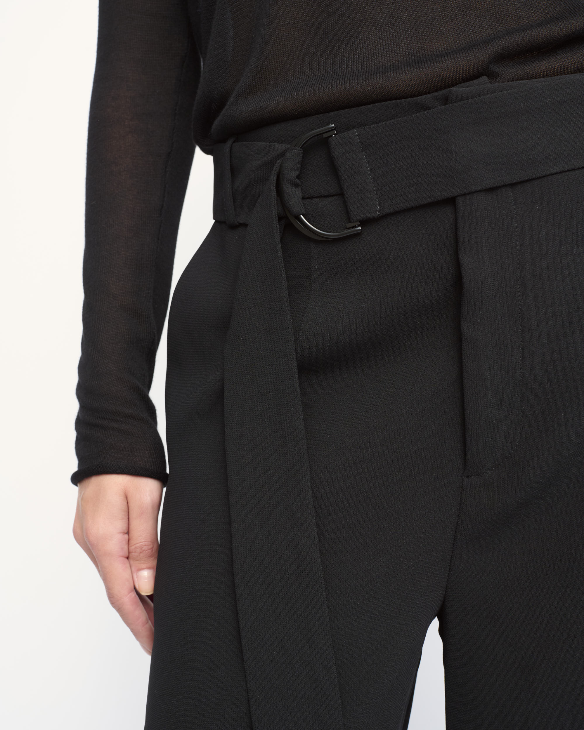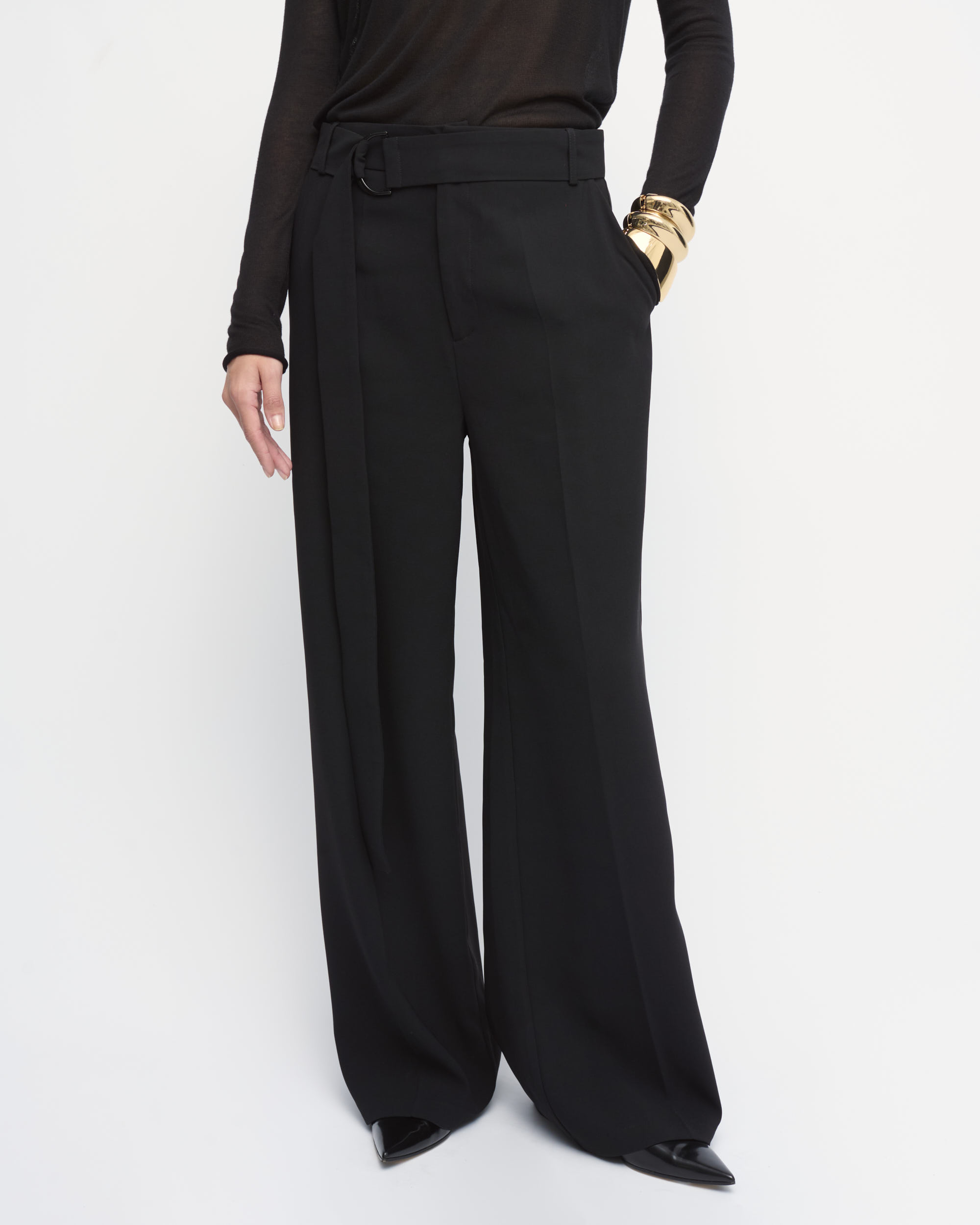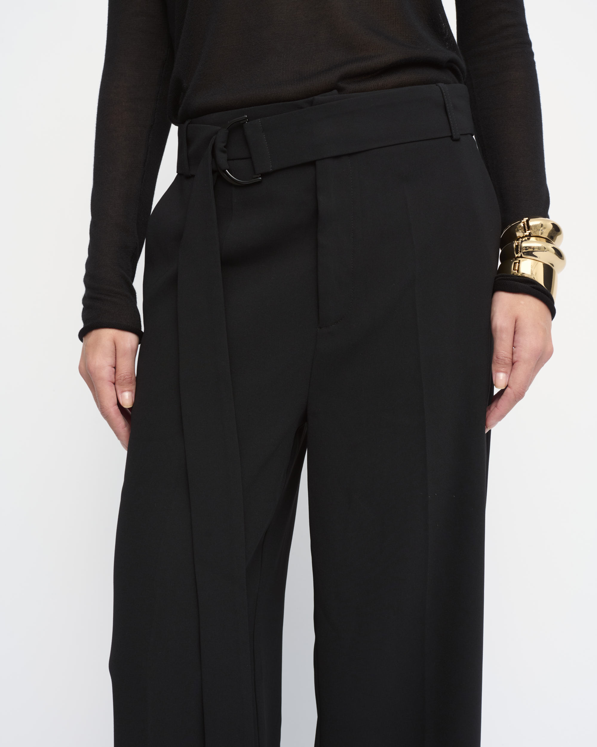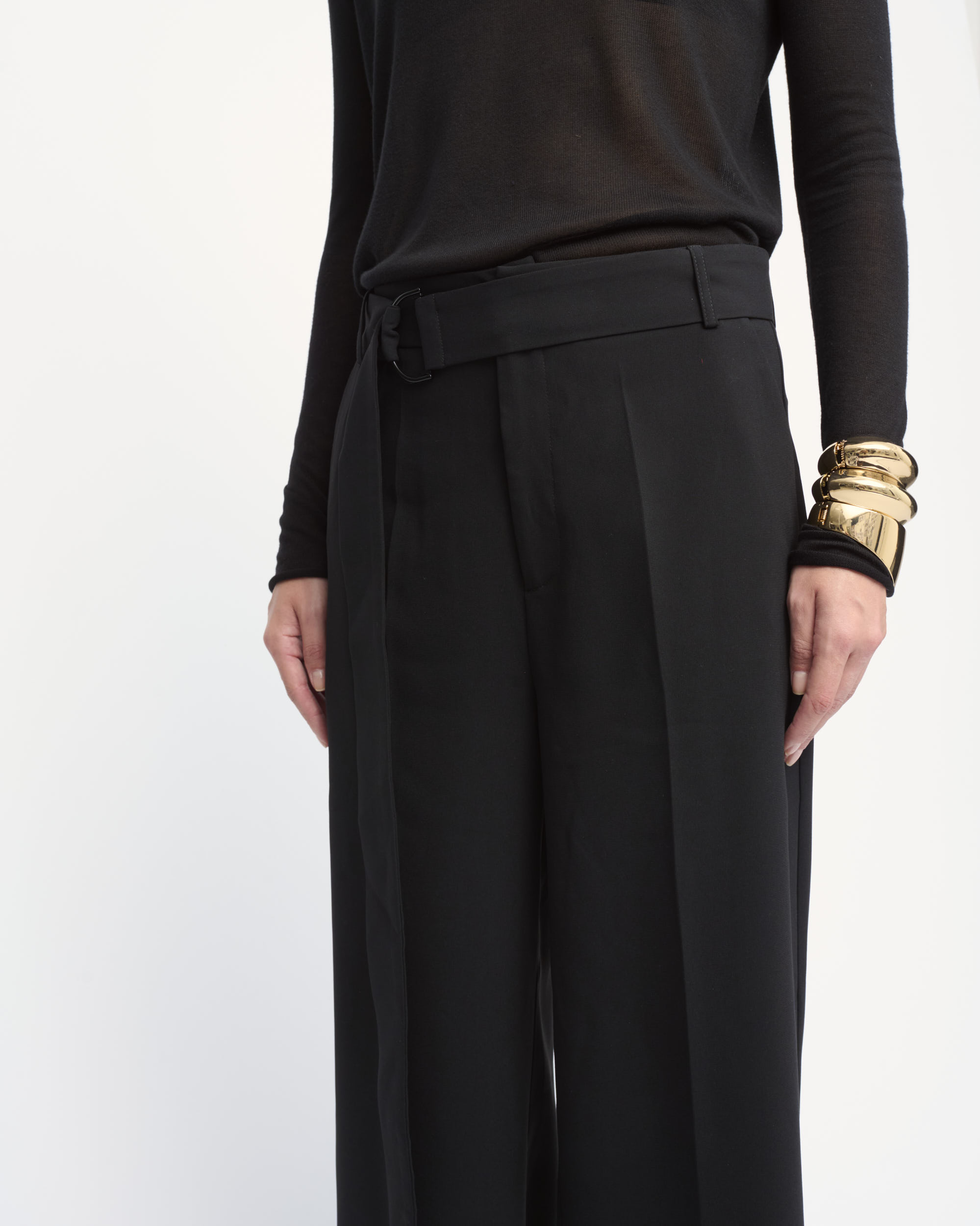 מכנסיים מחוייטים בצללית רגל רחבה, במותן חגורת בד ארוכה עם אבזם מתכת עדין.