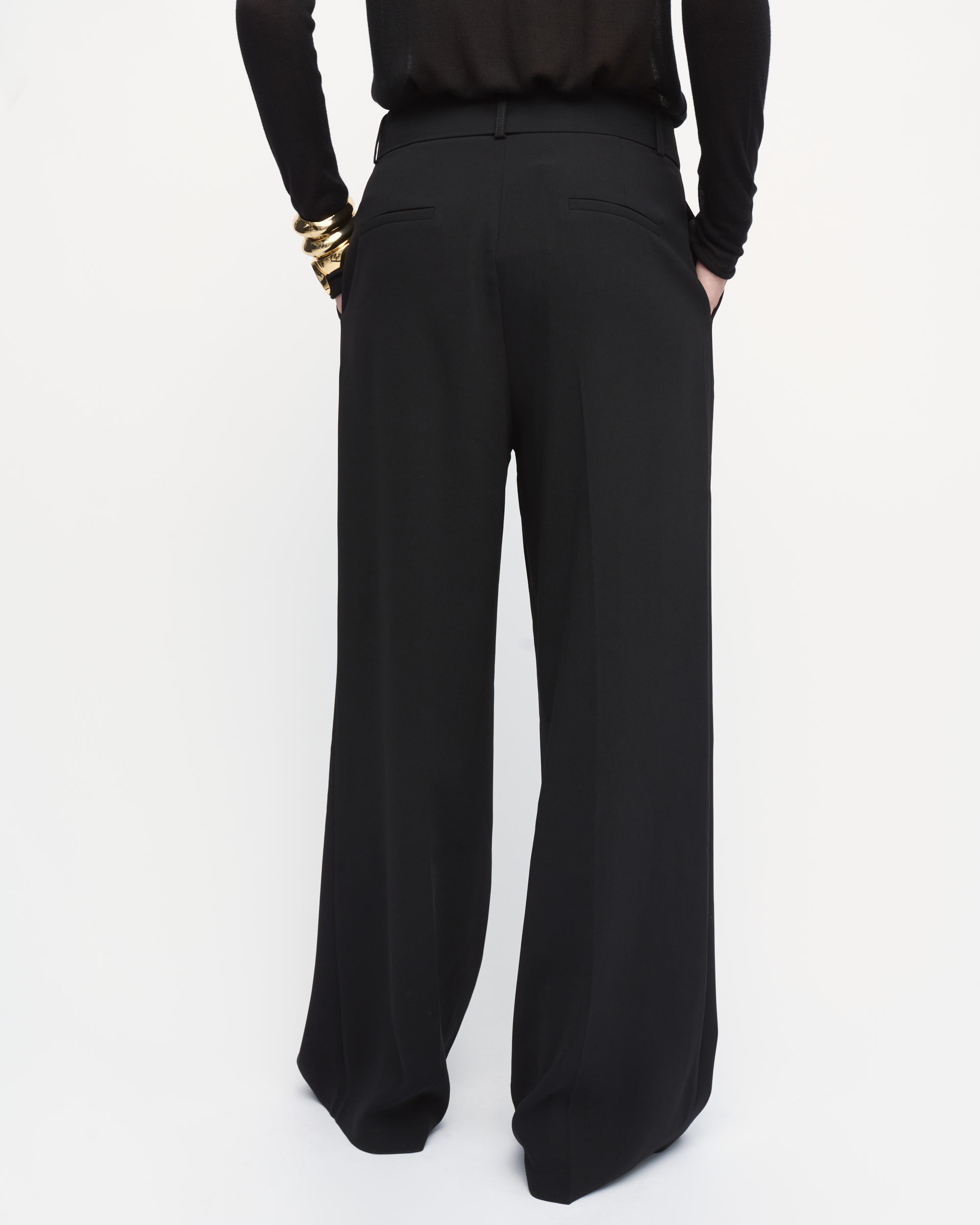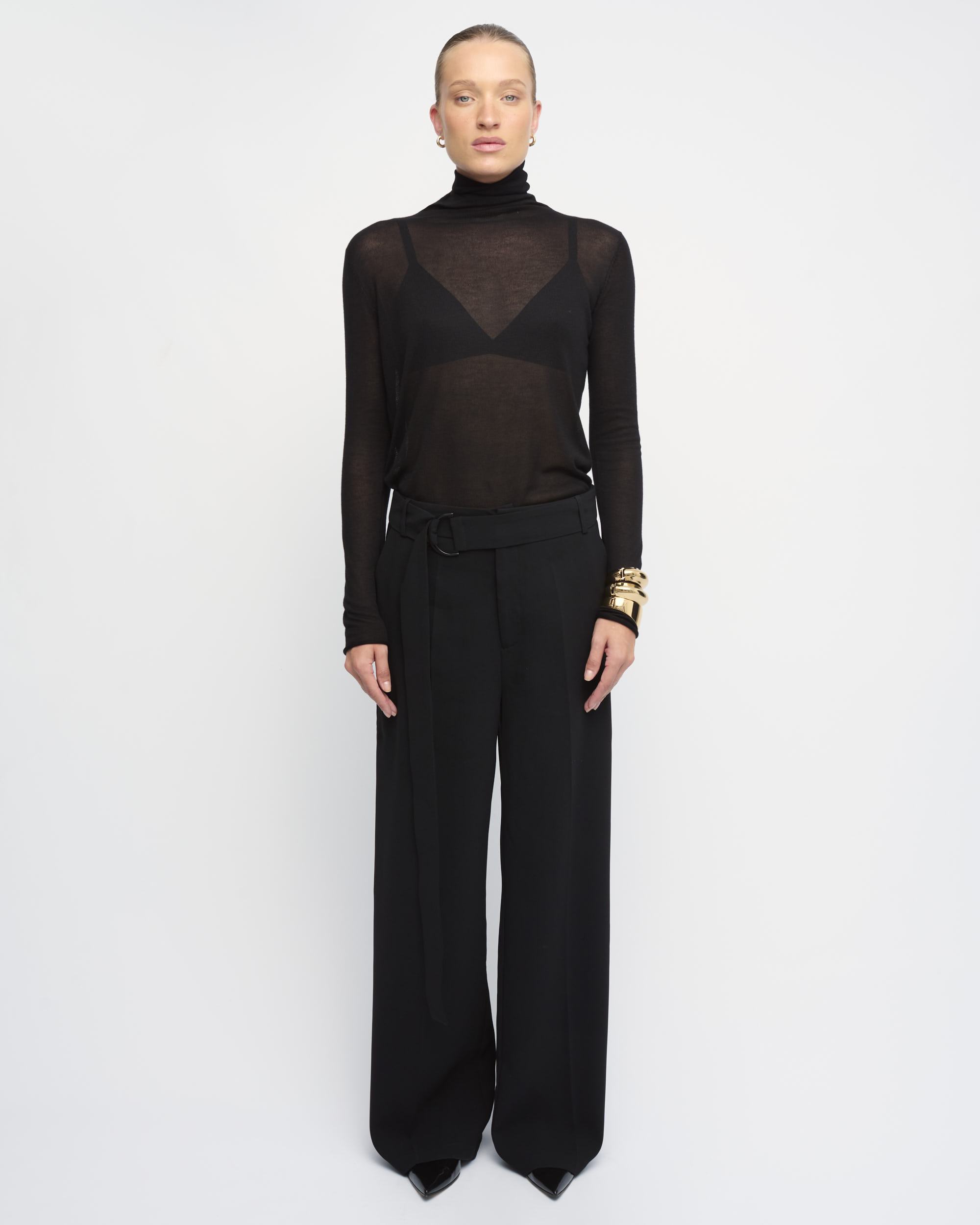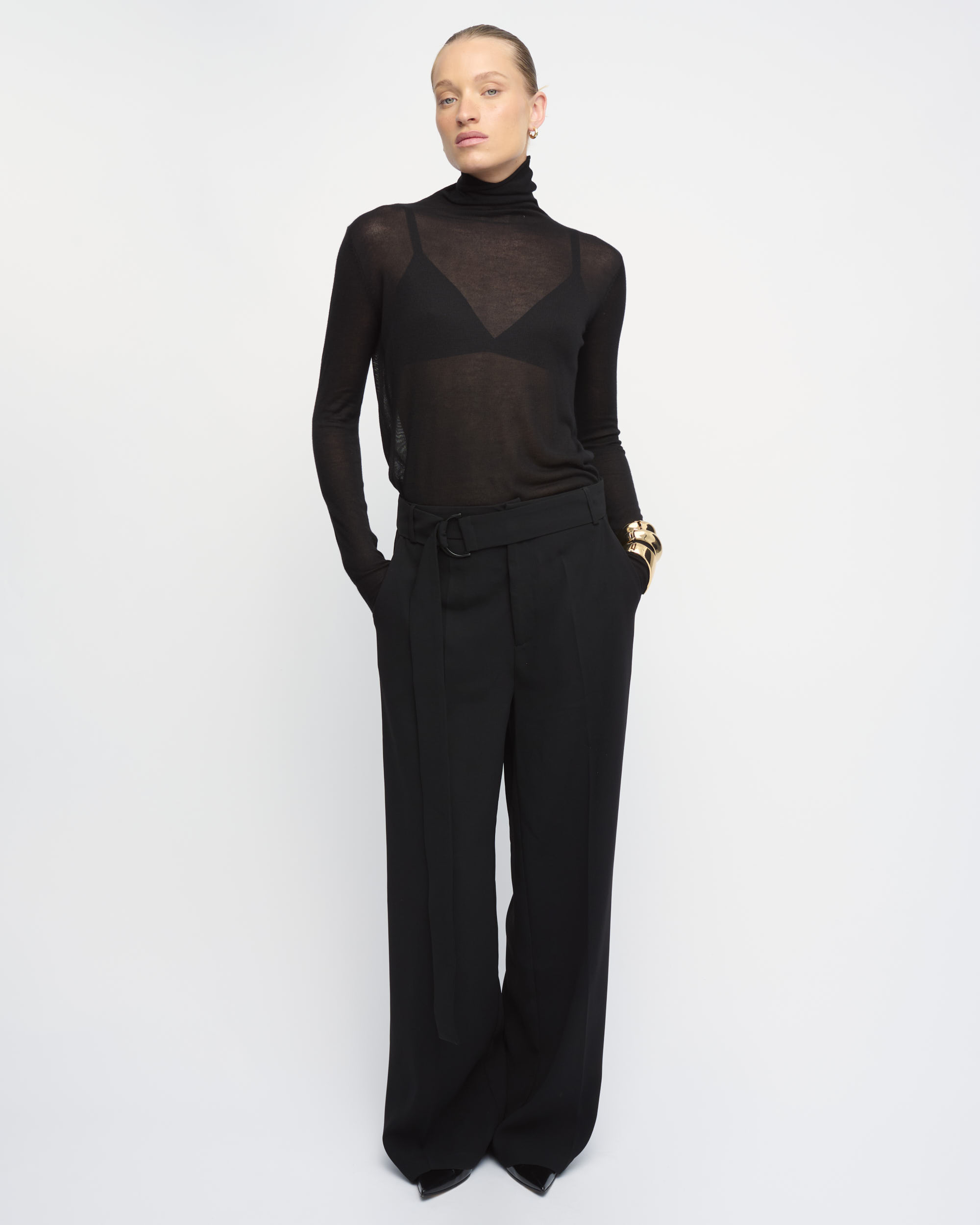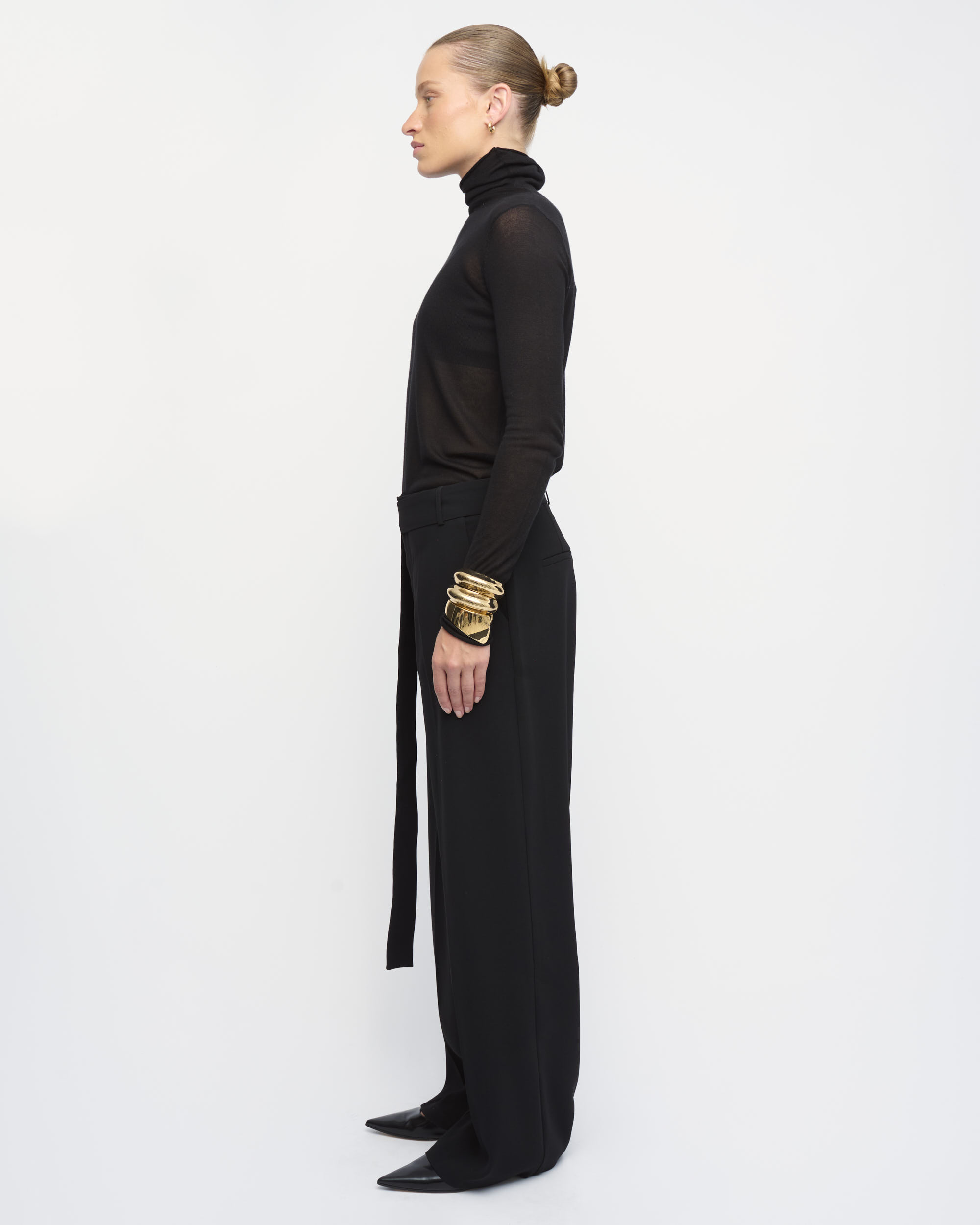 מכנסיים מחוייטים בצללית רגל רחבה, במותן חגורת בד ארוכה עם אבזם מתכת עדין.