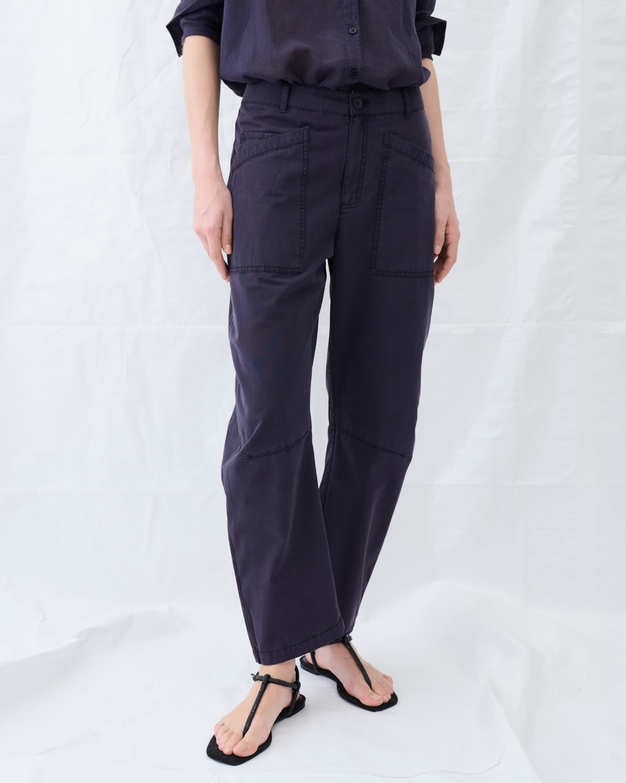 מכנסי כותנה בצללית רגל מעוגלת, כיסי פץ’ בחזית ובגב. סגירת רוכסן בחזית.