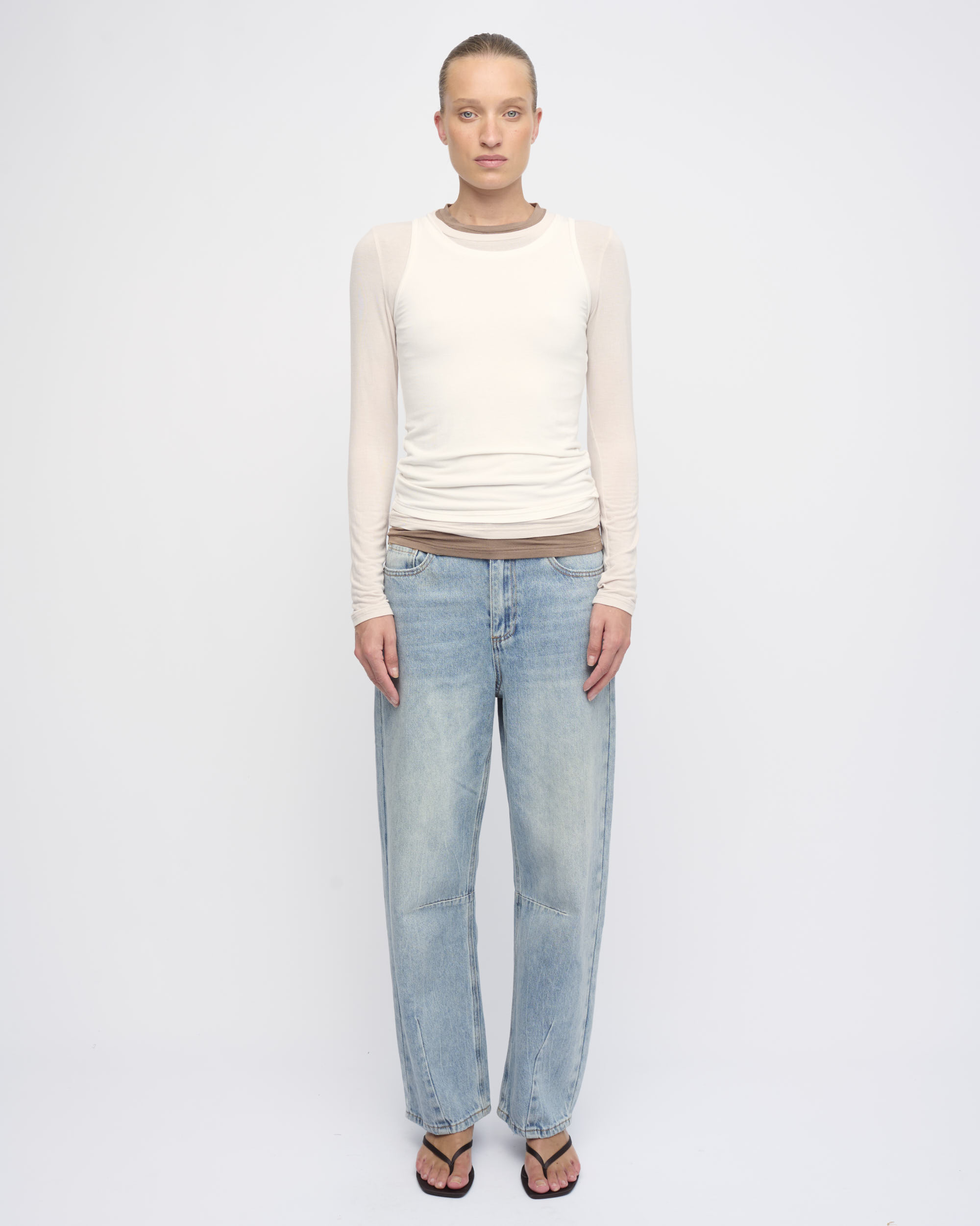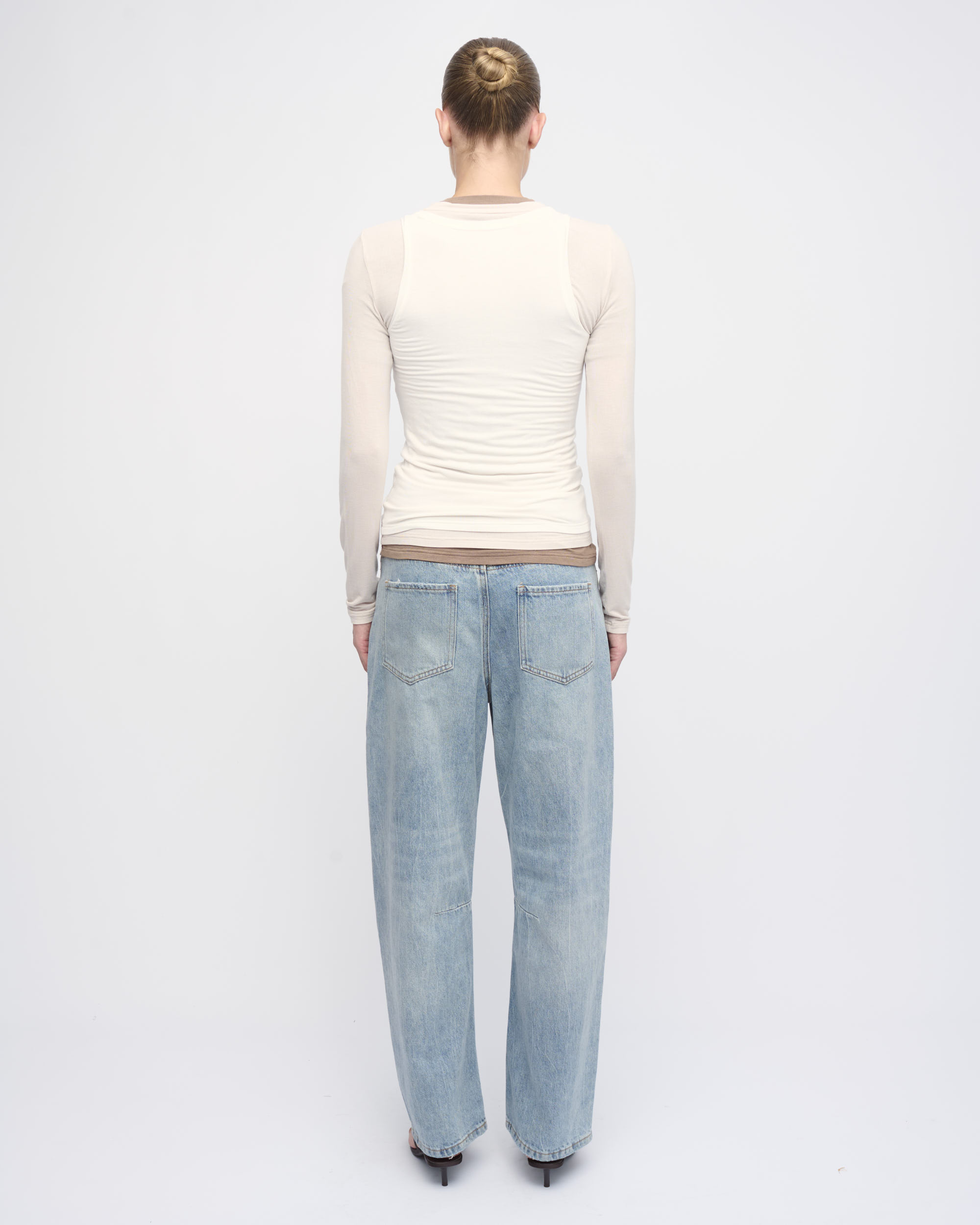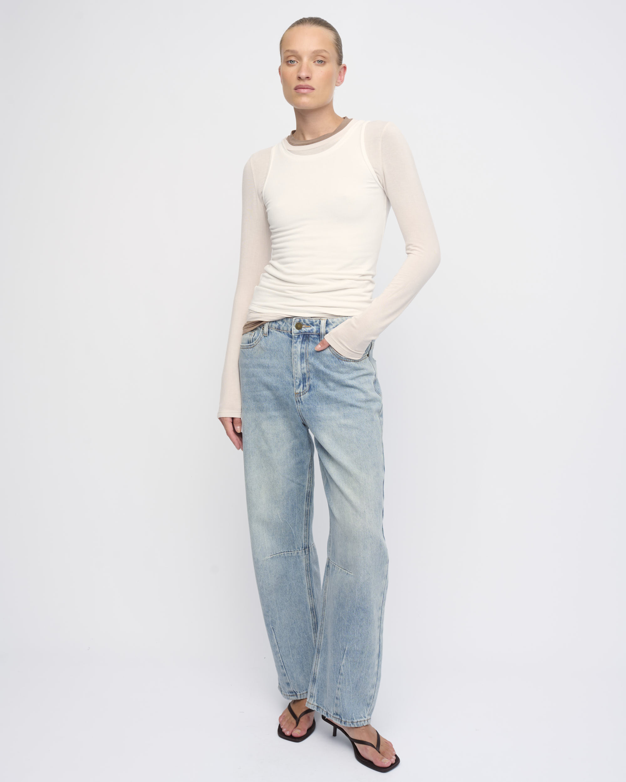 ג’ינס BARREL LEG HIGH WAIST, עיצוב 5 כיסים, גוון כחול שטוף.