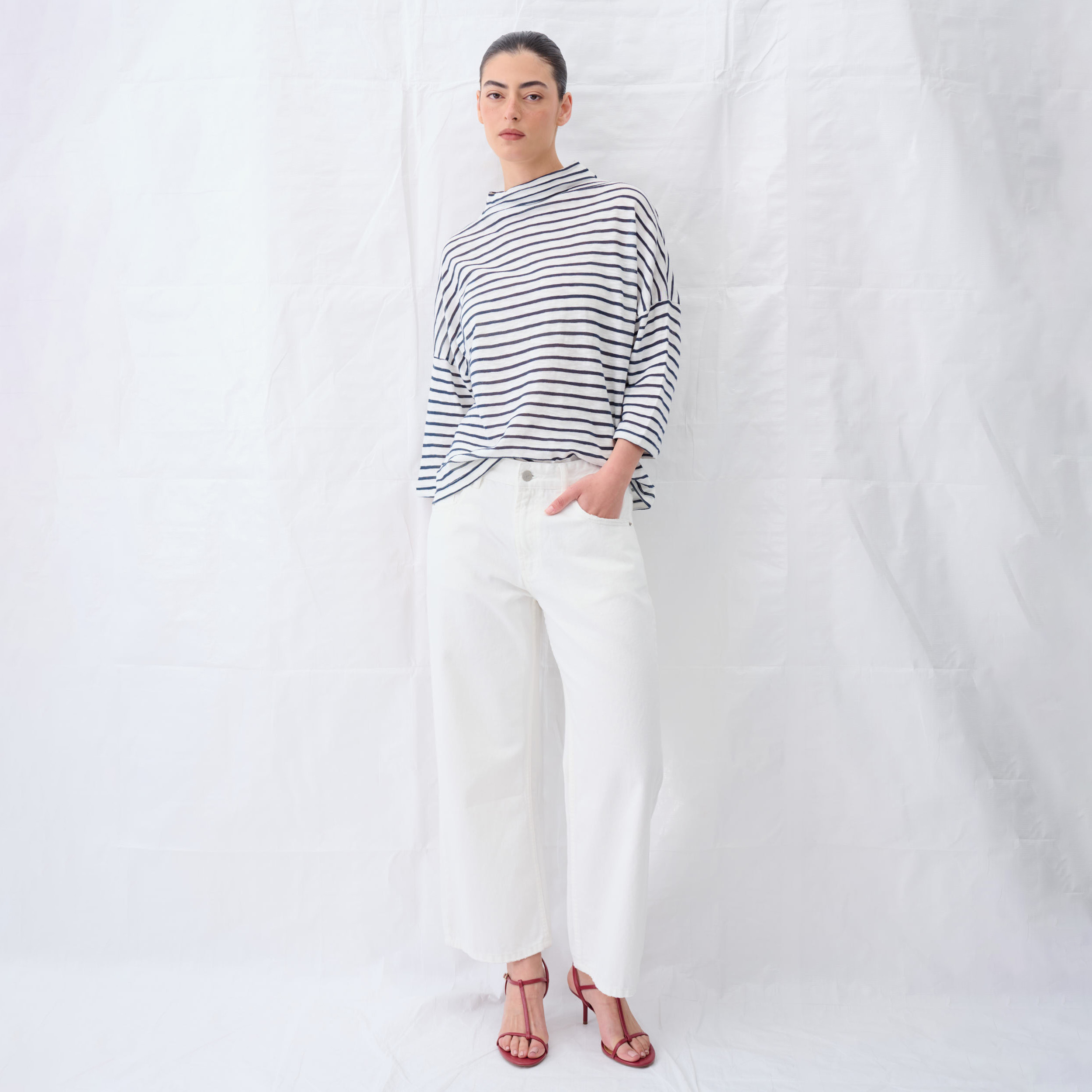 חולצת טי מסריג כותנה בדוגמת פסים. צללית נינוחה, שרוול אורך 3/4, צוארון רך גבוה.