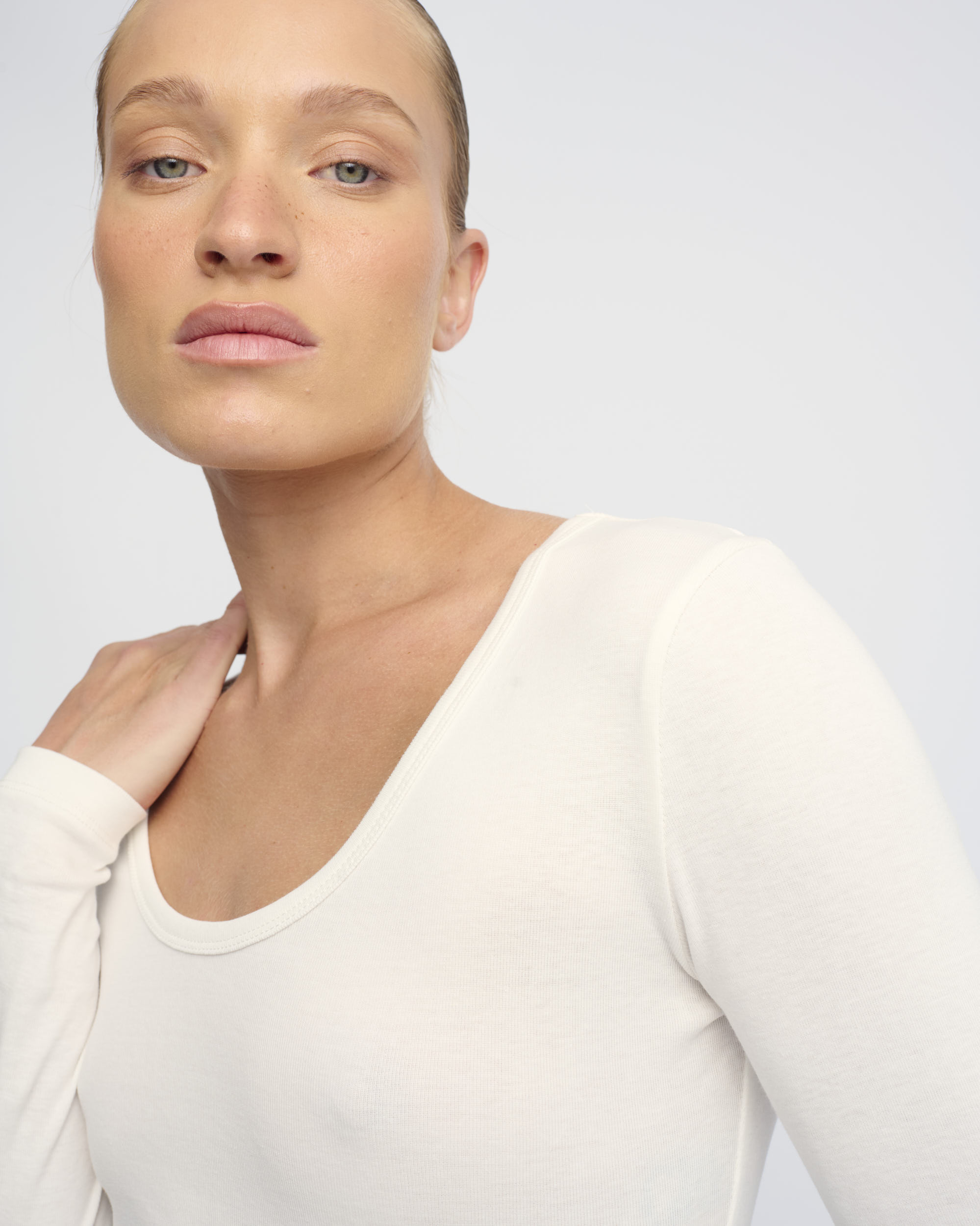 טופ סריג כותנה, צללית צמודה, מחשוף עגול עמוק.