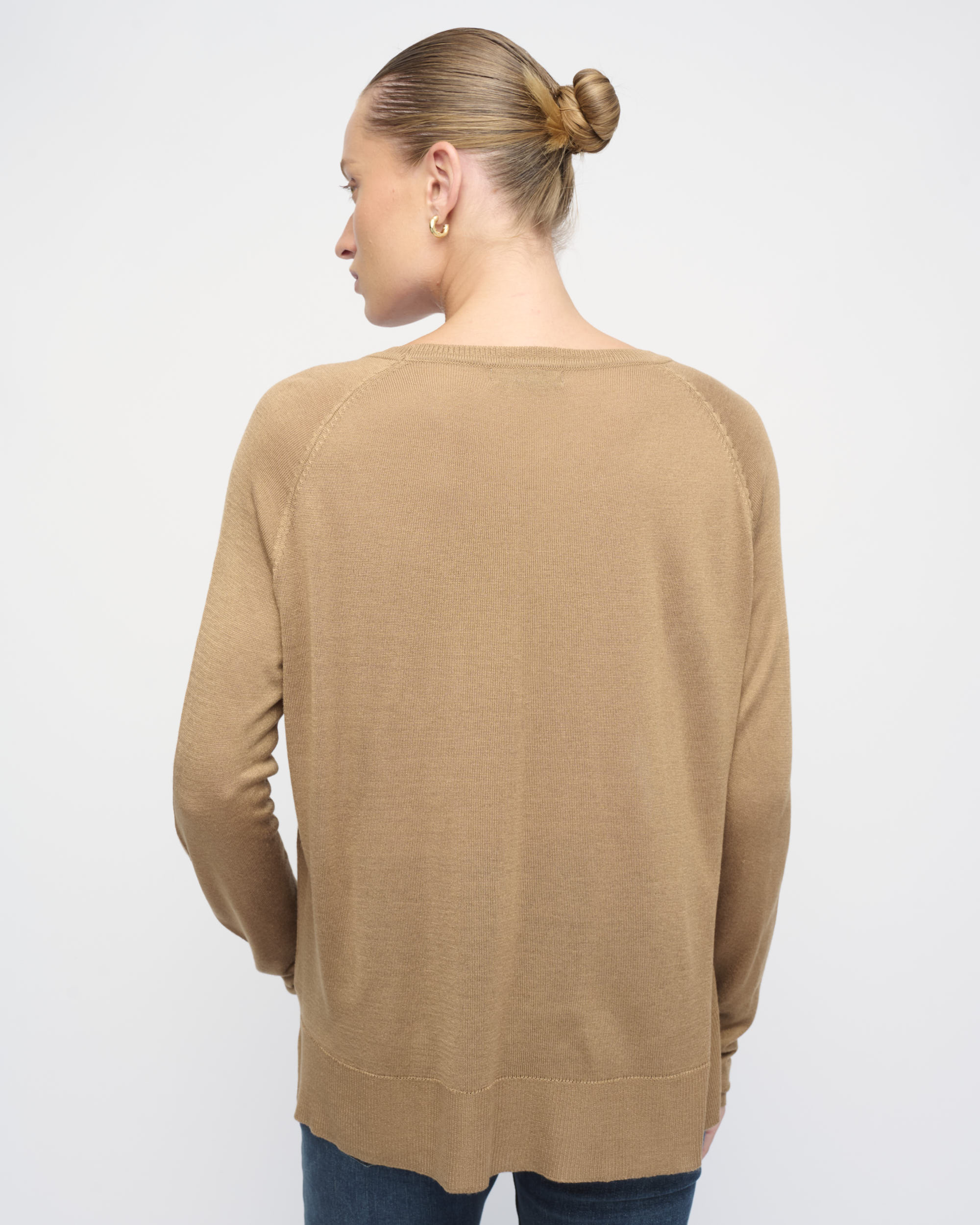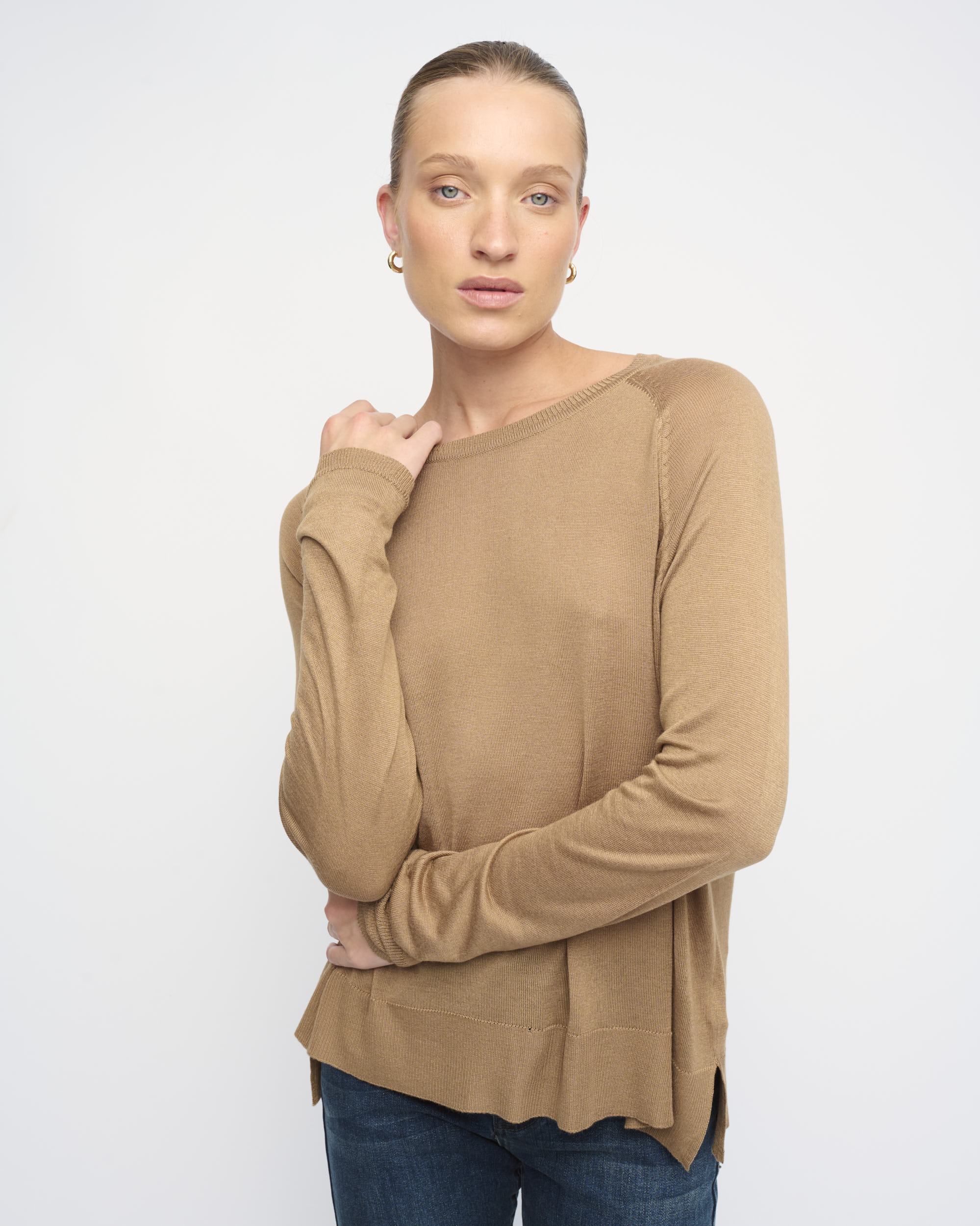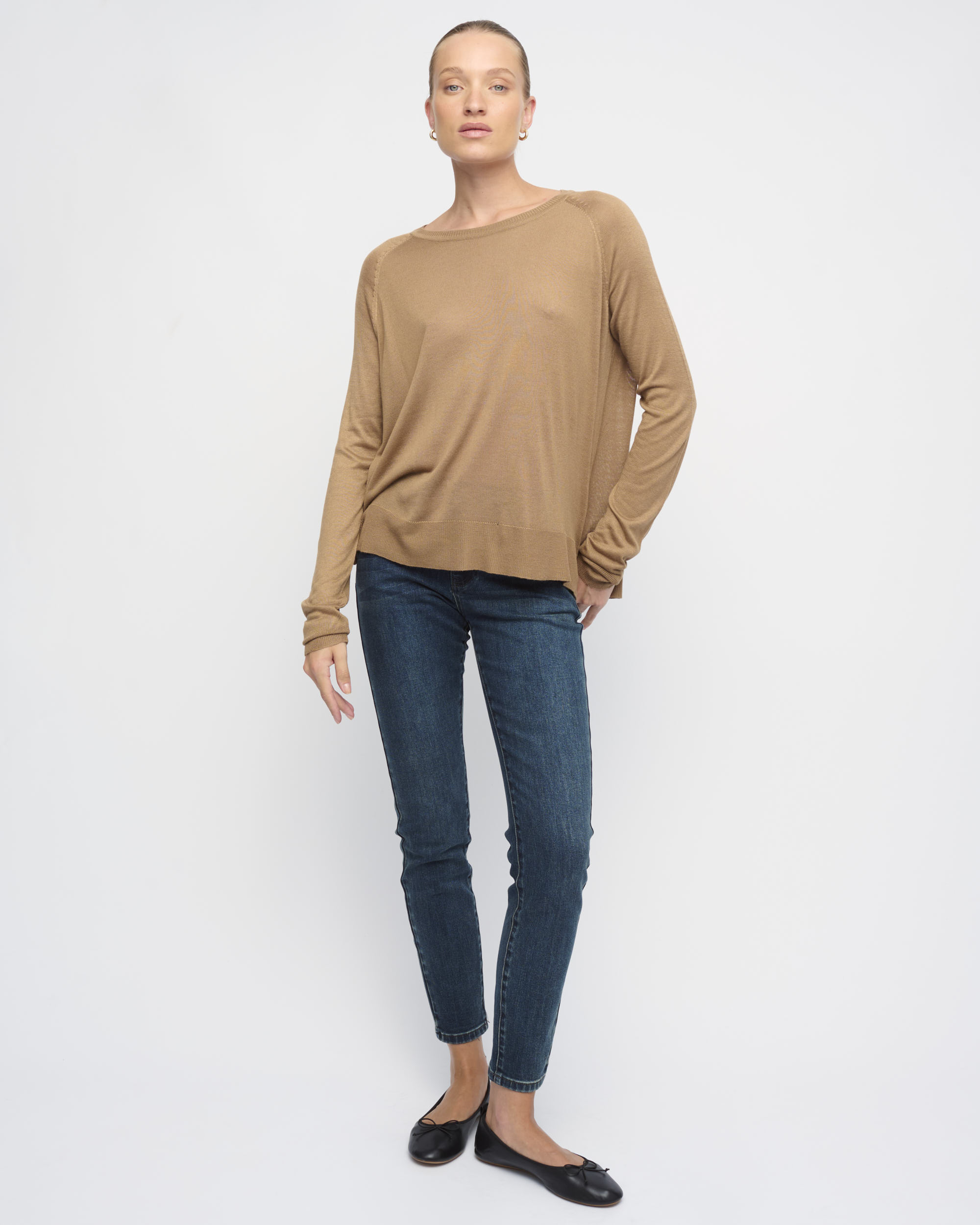 סריג ויסקוזה דק, צללית רחוקה מהגוף. שרוול רגלן, מחשוף סירה.