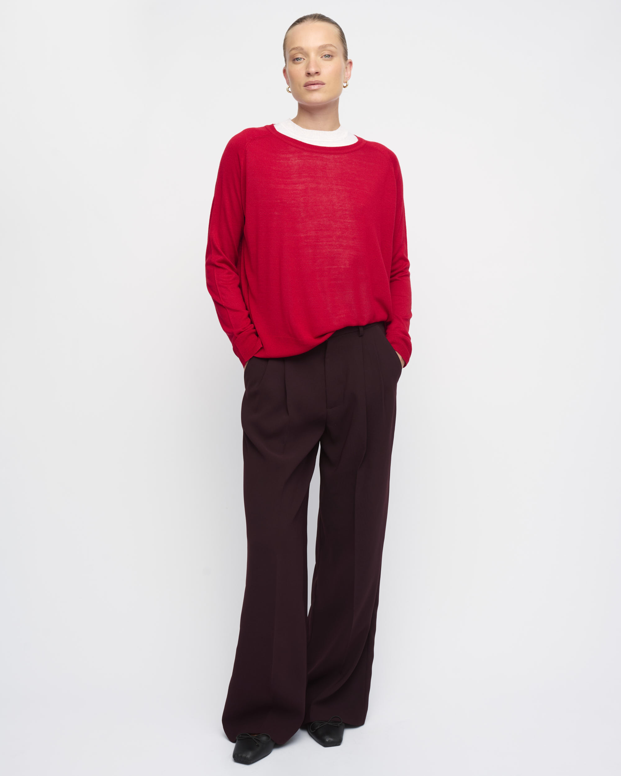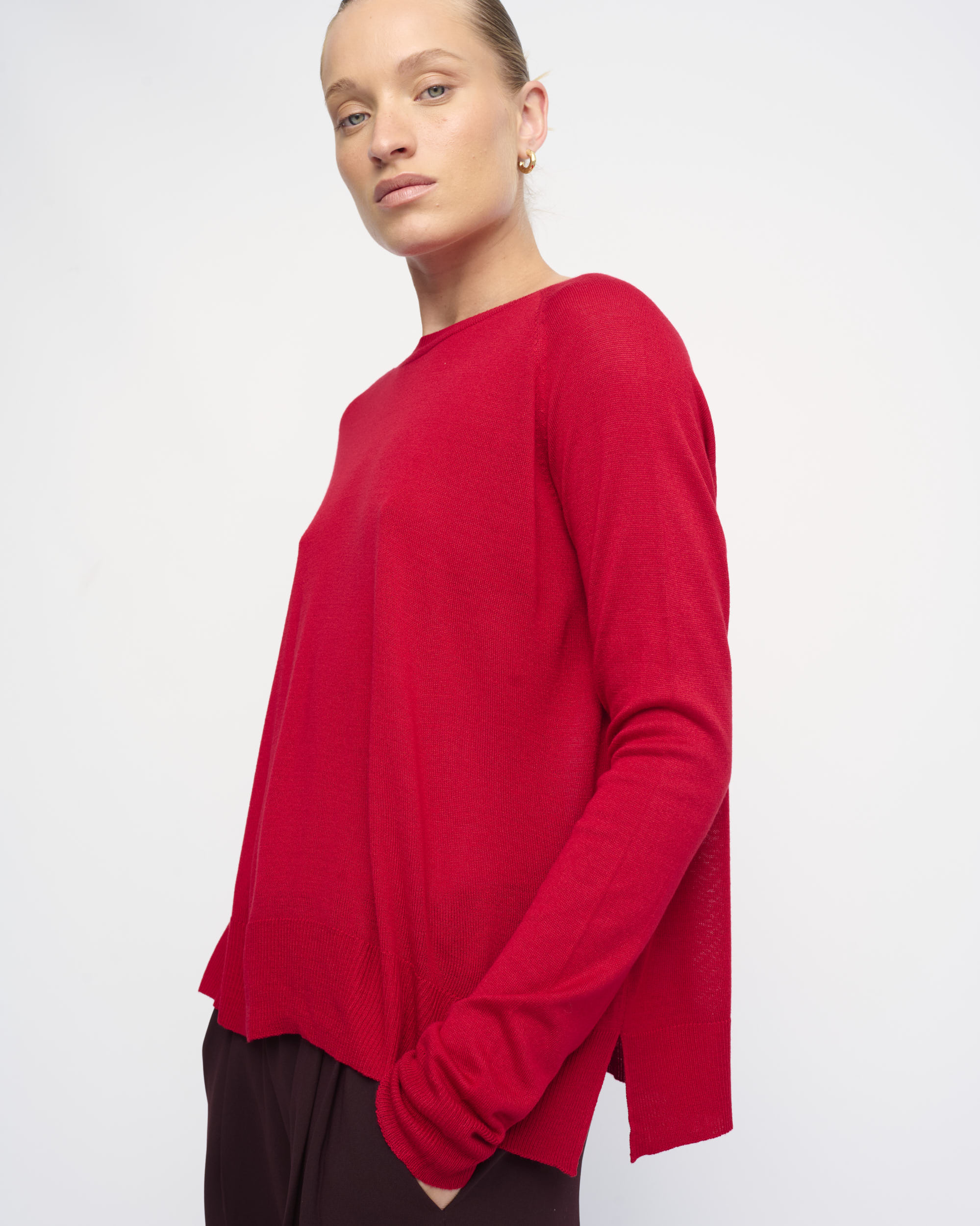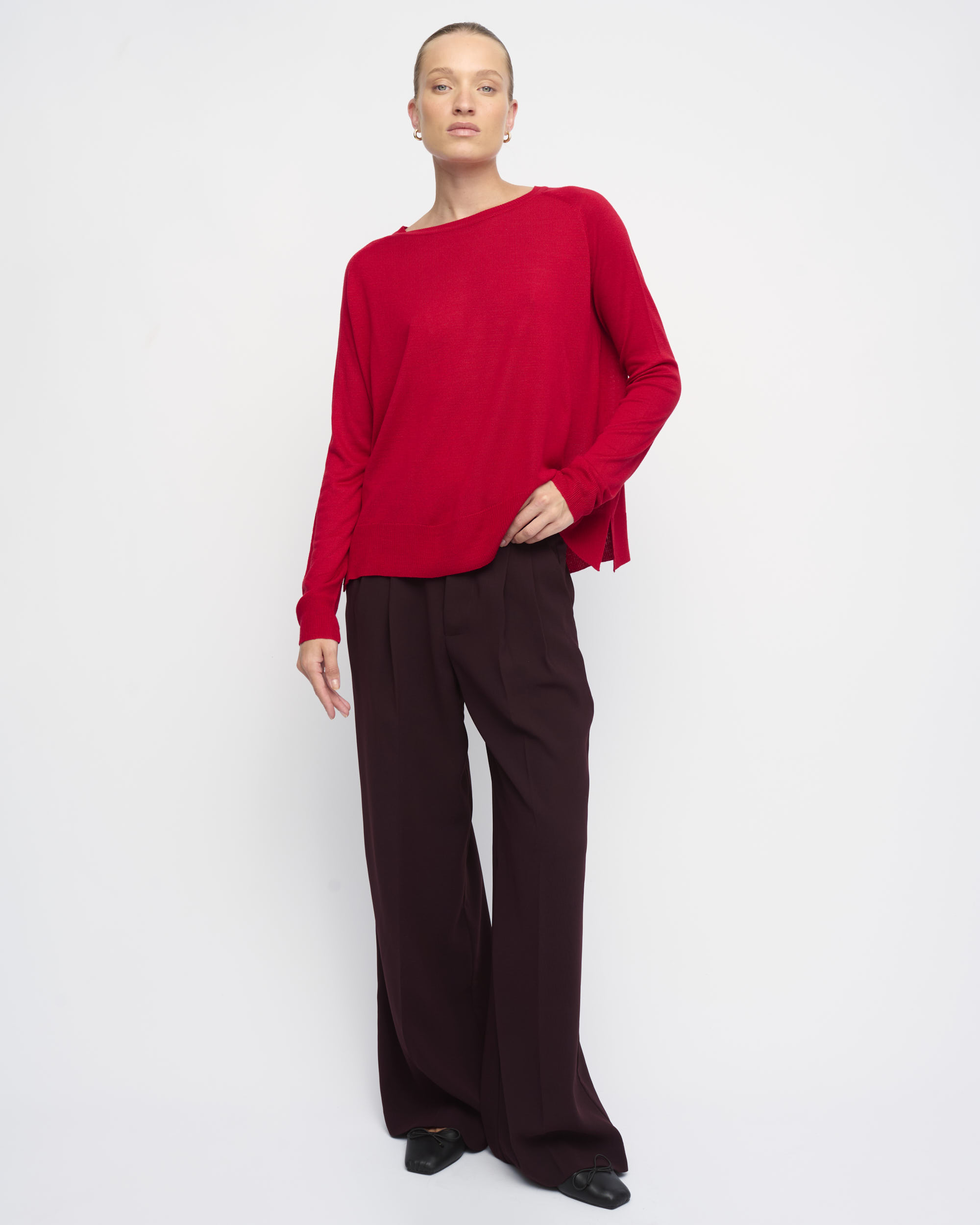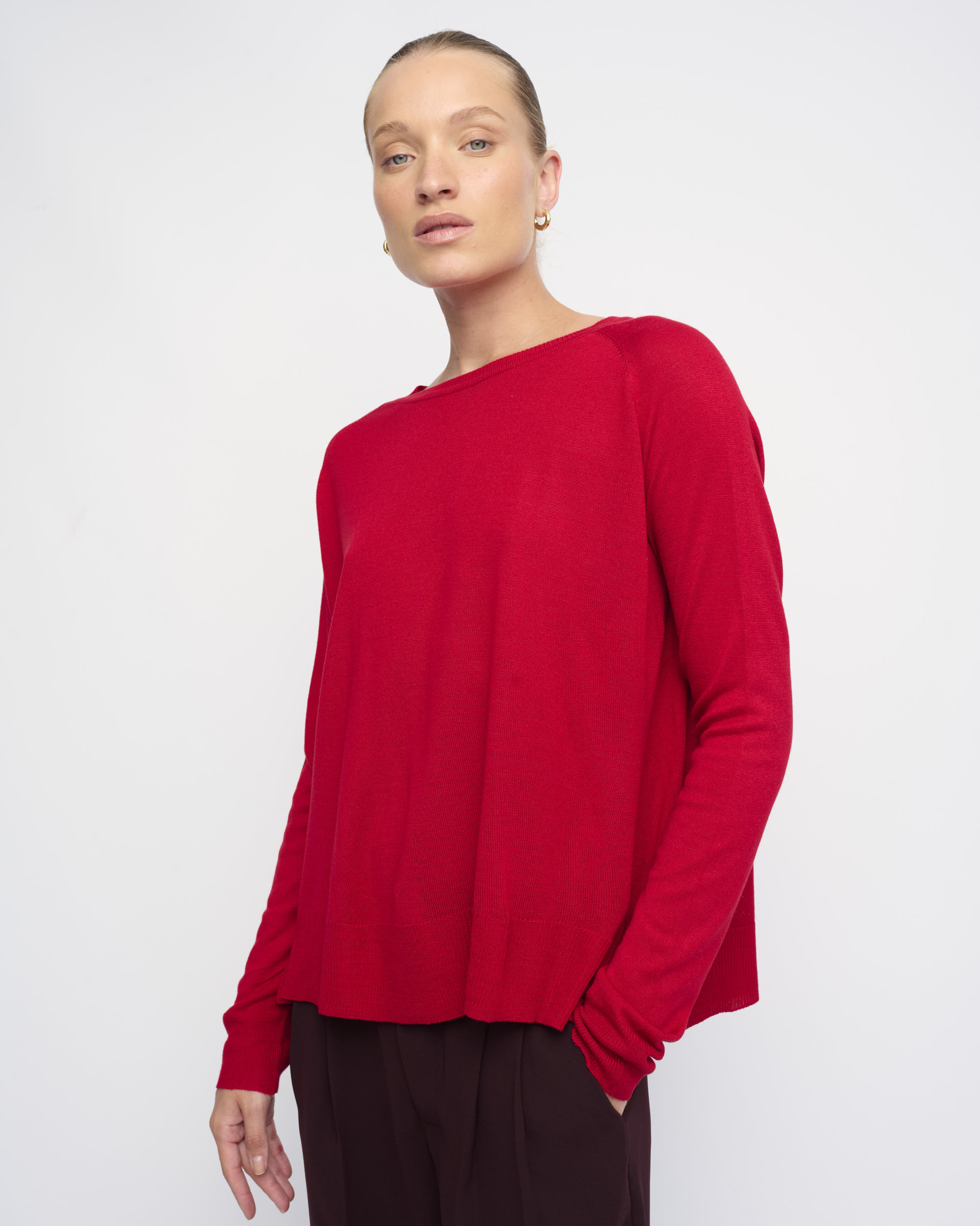 סריג ויסקוזה דק, צללית רחוקה מהגוף. שרוול רגלן, מחשוף סירה.