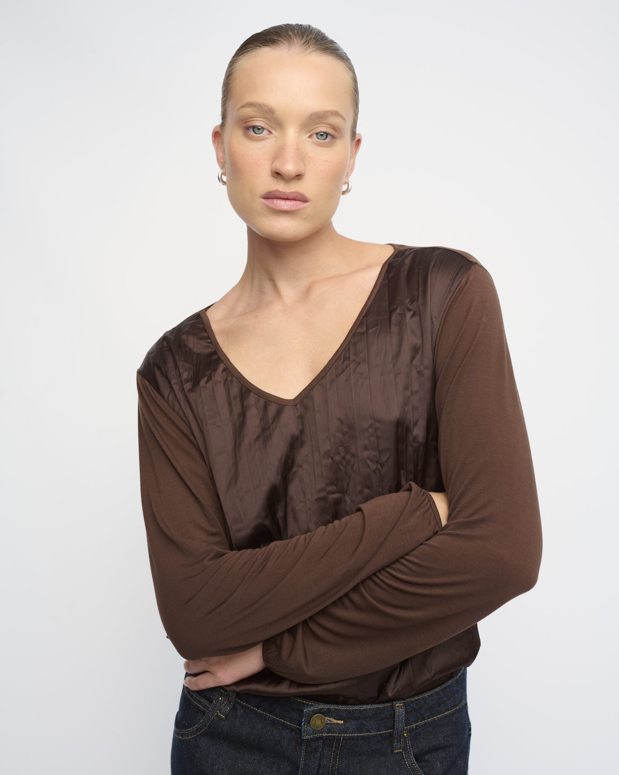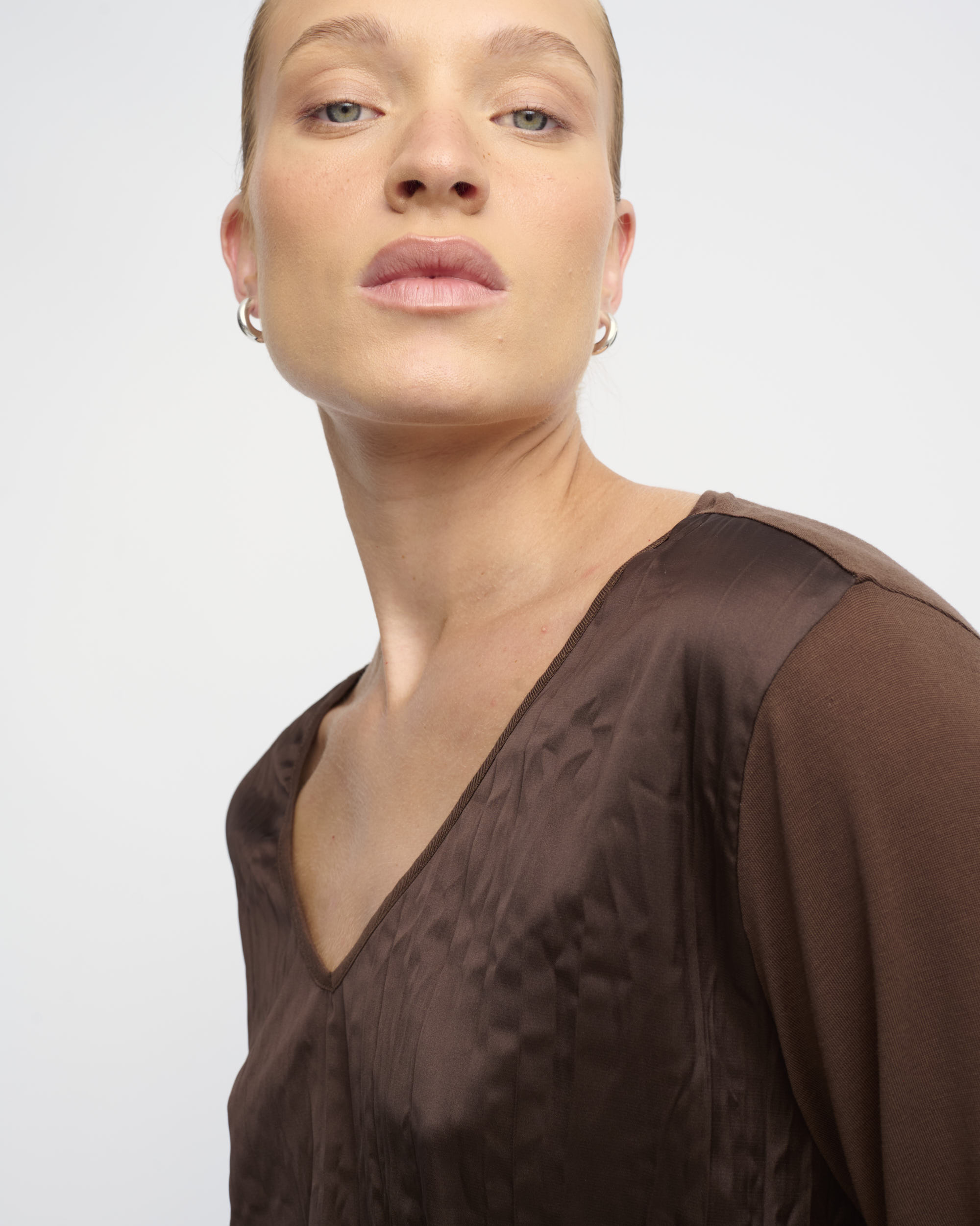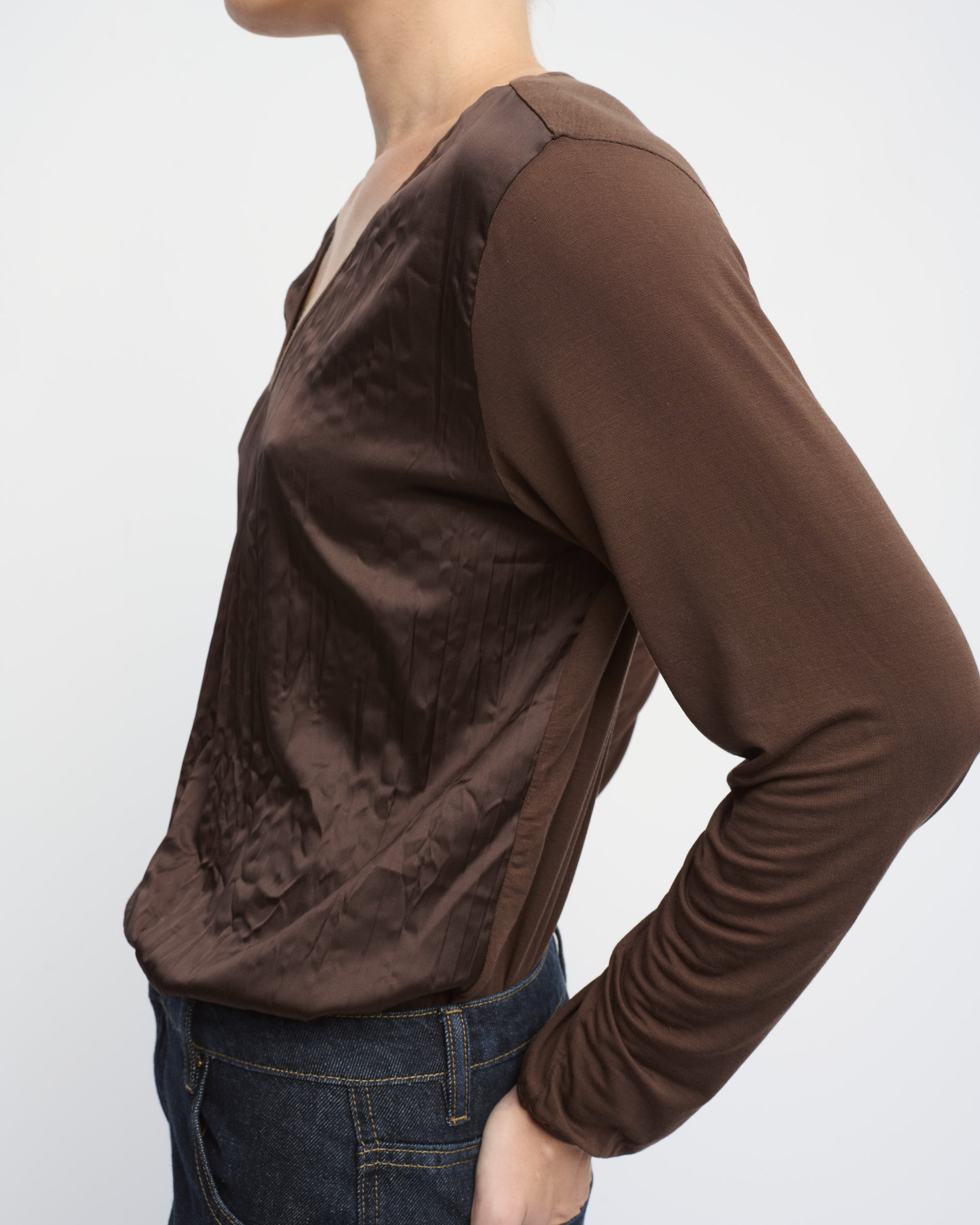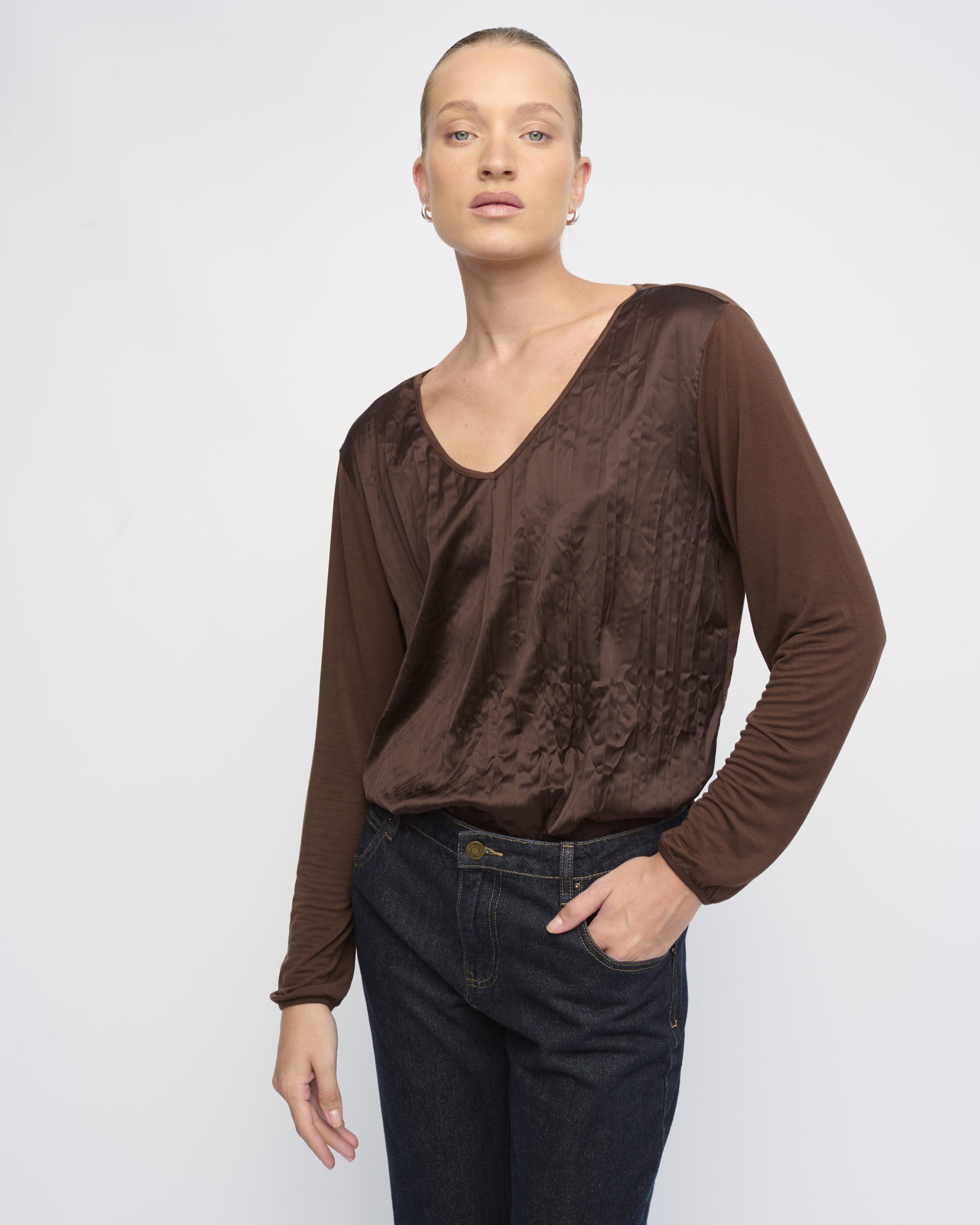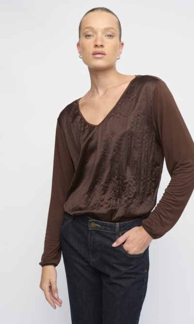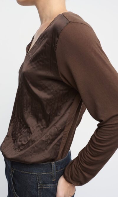 חולצת טי בצללית נינוחה, גב ושרוולים מסריג דק, חזית מסאטן באפקט מקומט. עם מחשוף וי.