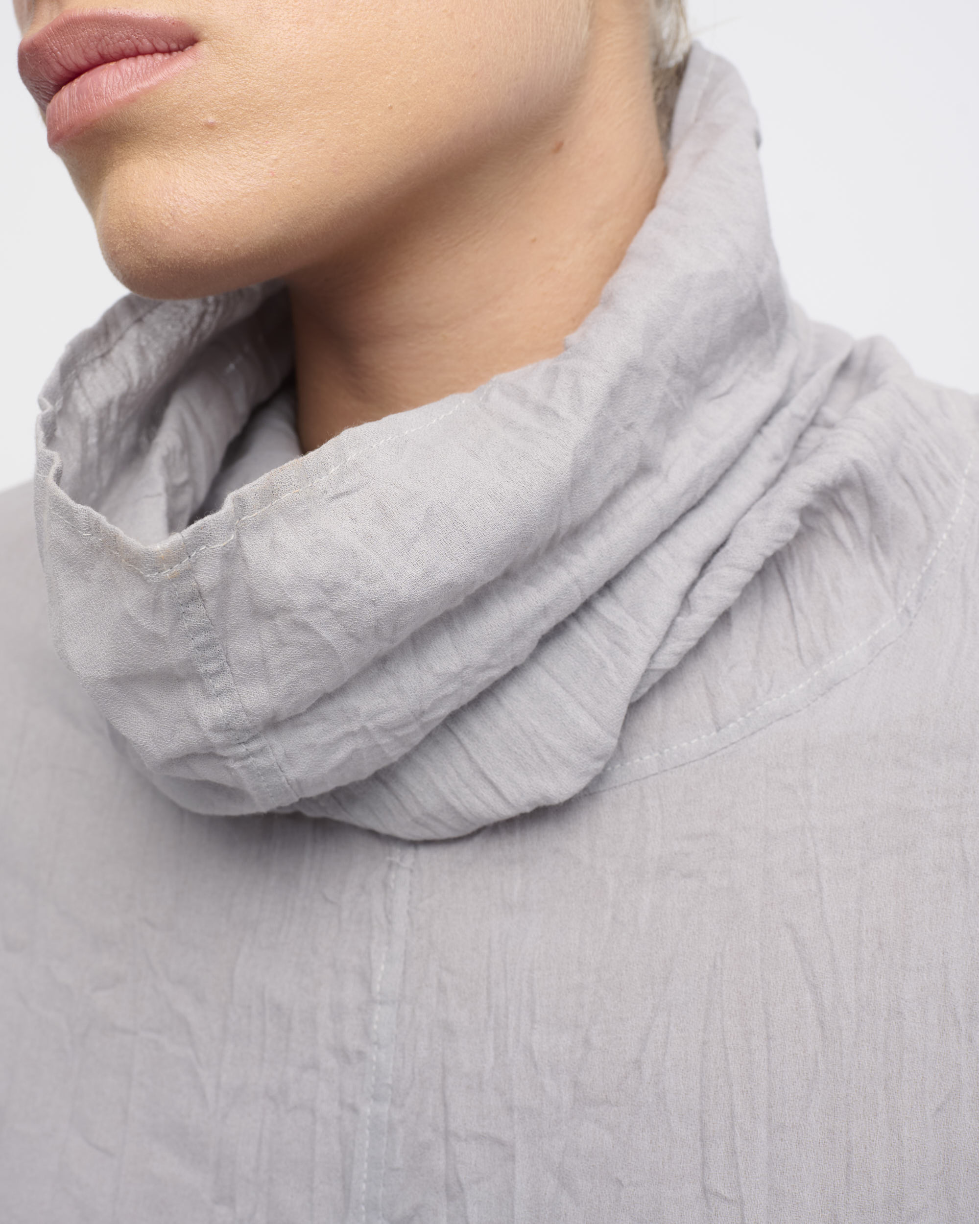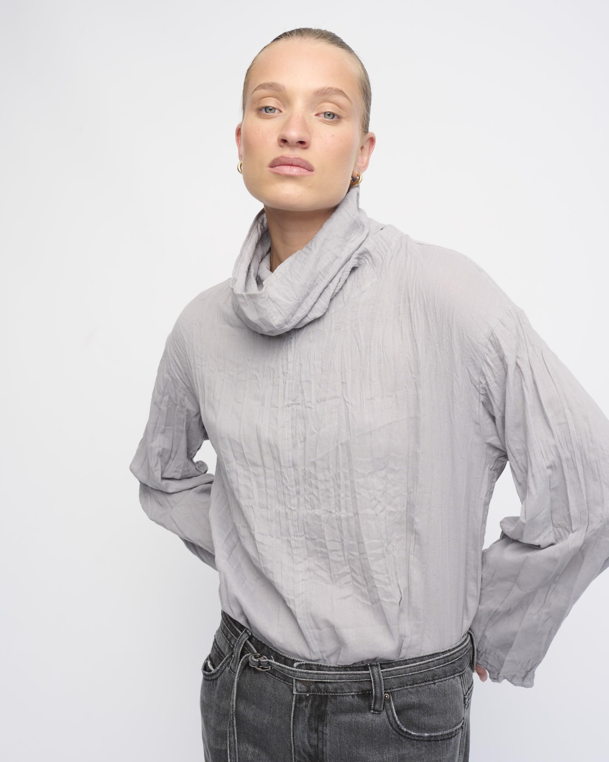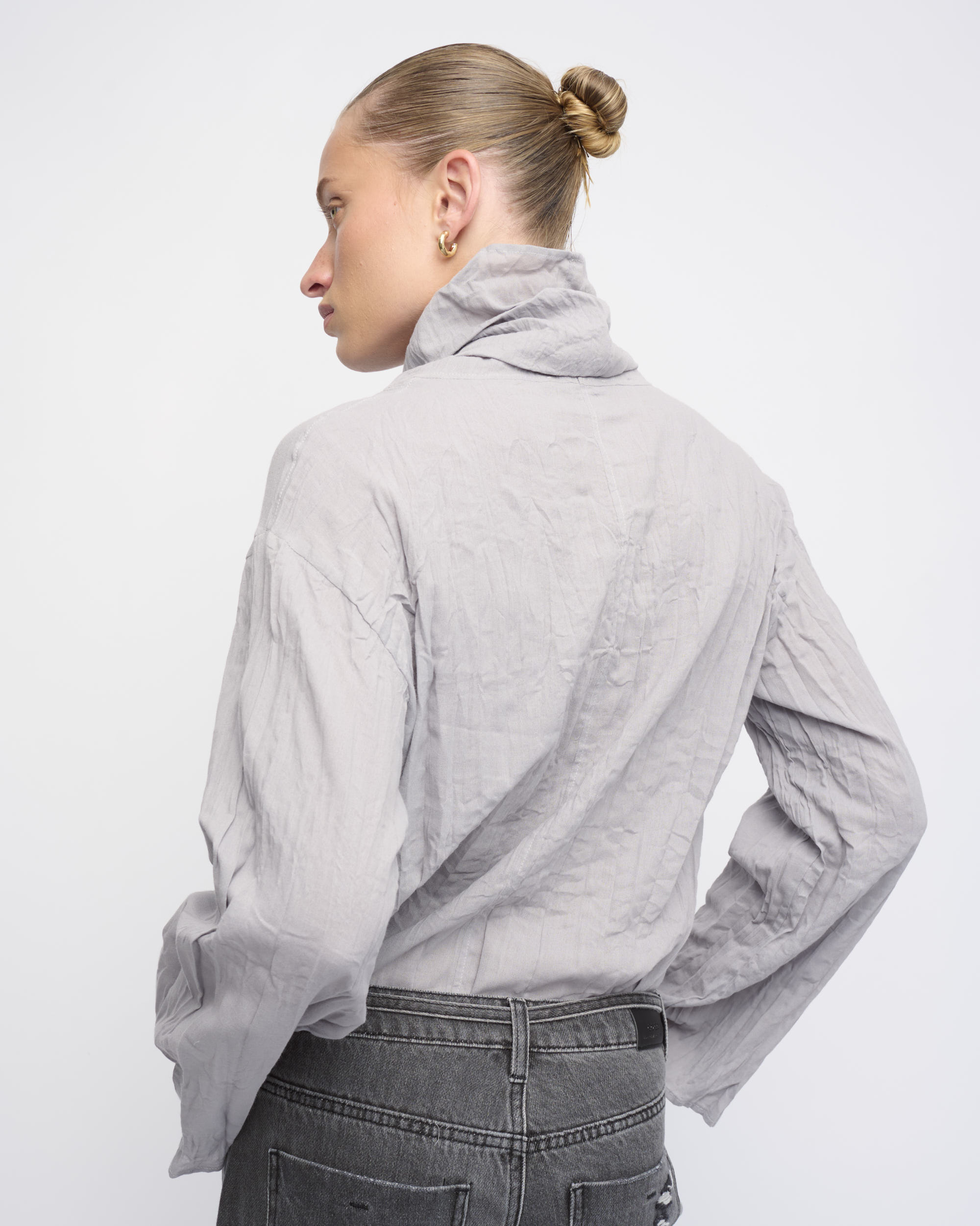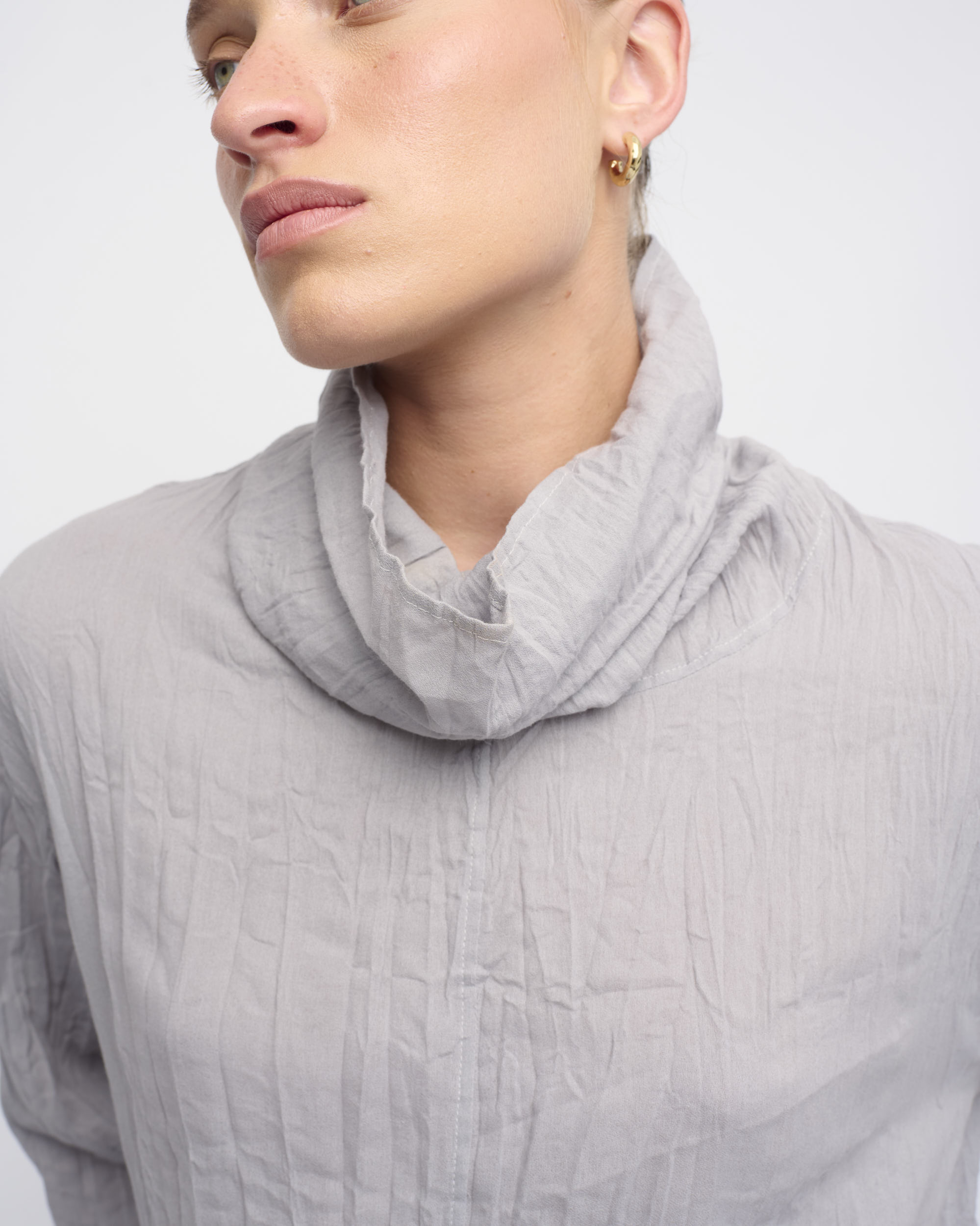 חולצה מכותנה קרפ, צללית קרובה לגוף, צוארון גבוה, עם אפקט קימוט.