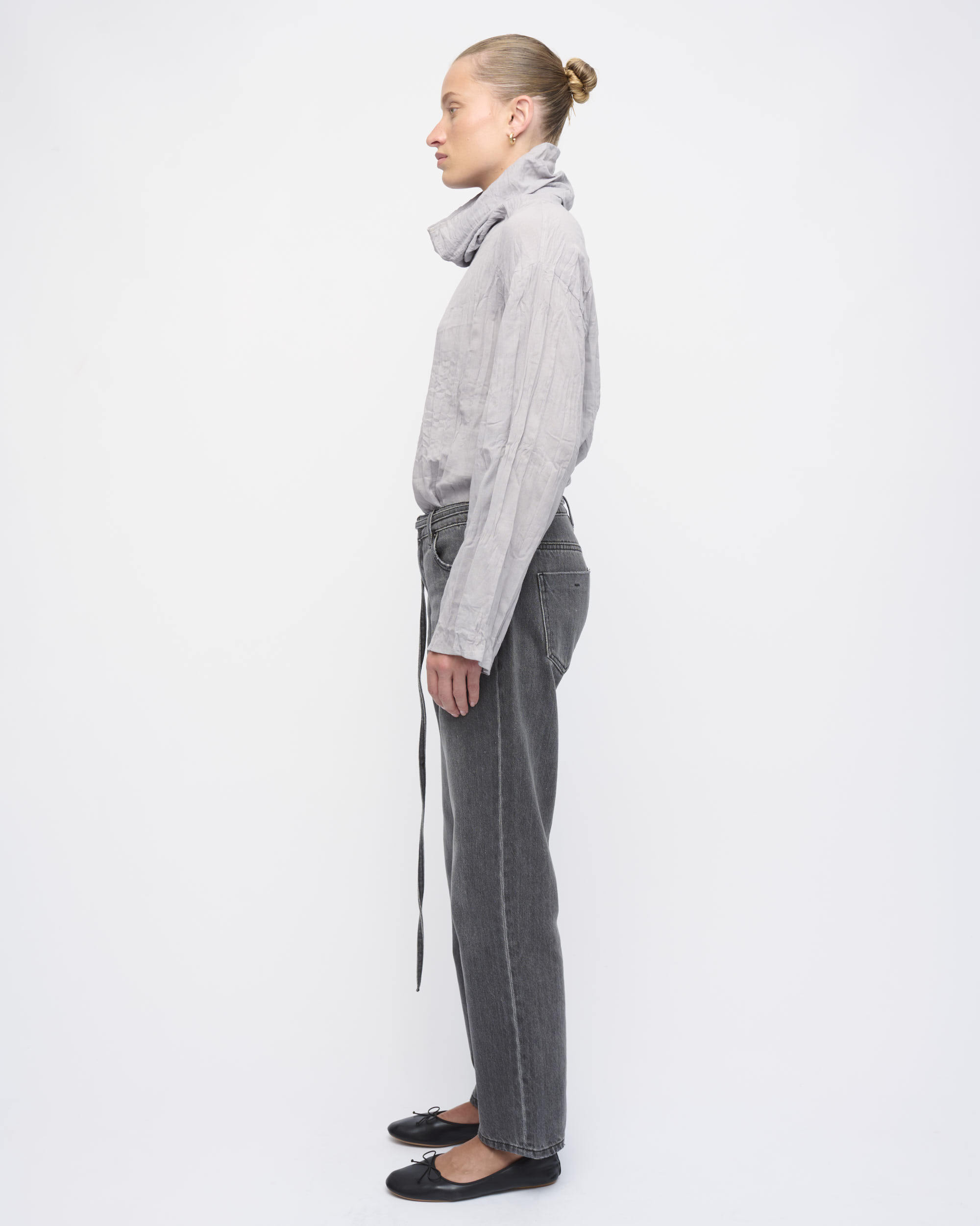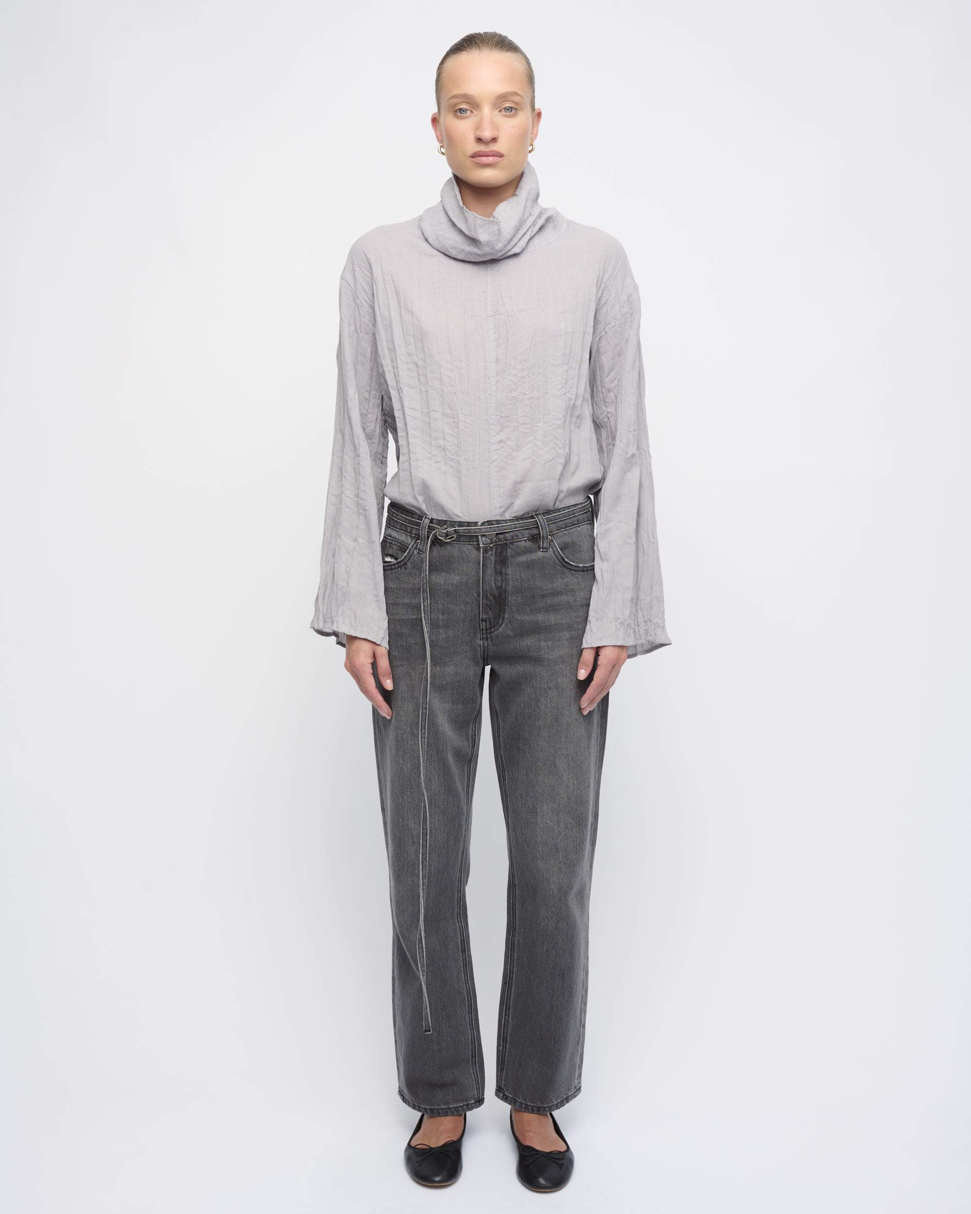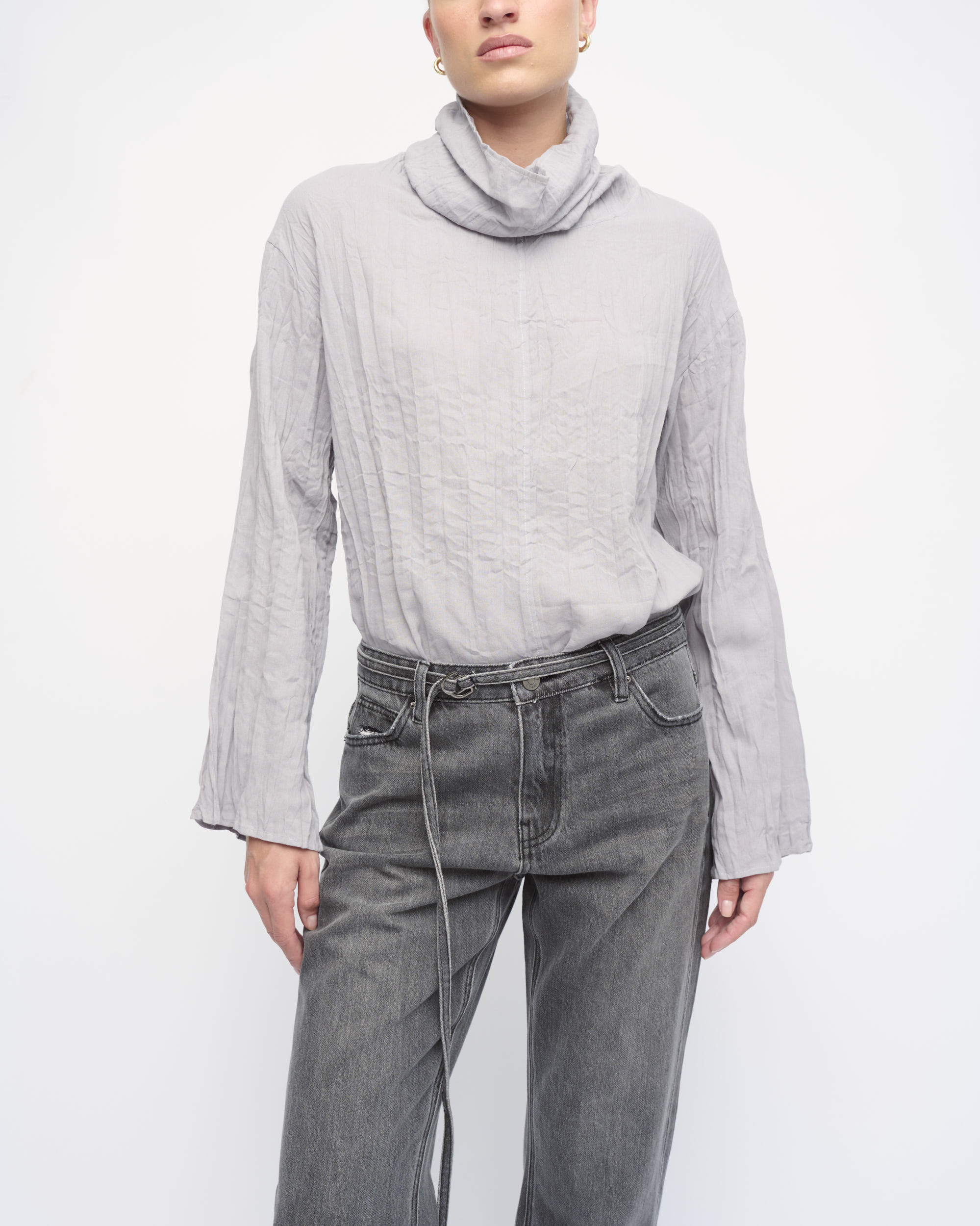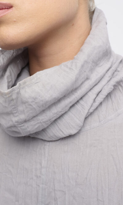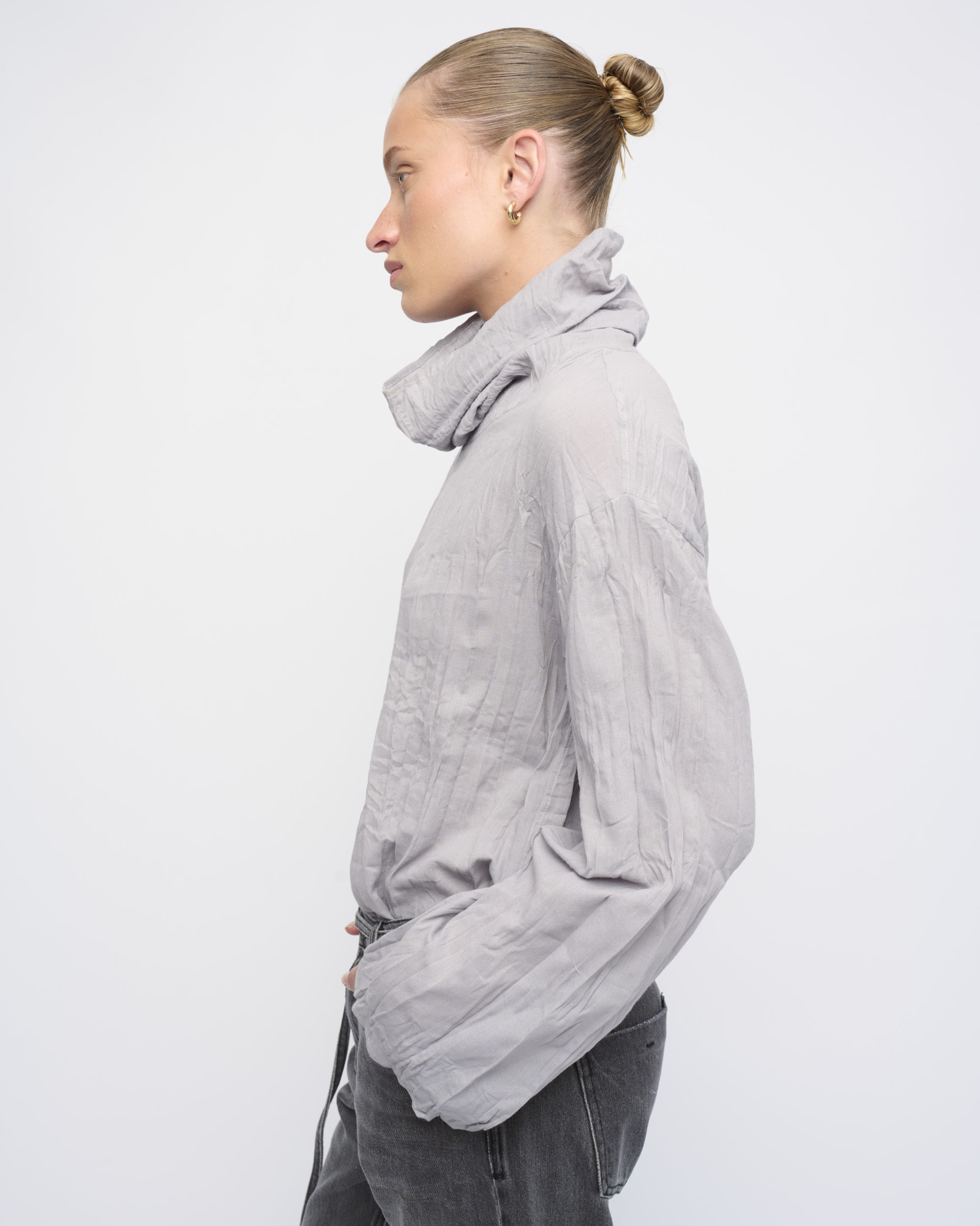 חולצה מכותנה קרפ, צללית קרובה לגוף, צוארון גבוה, עם אפקט קימוט.