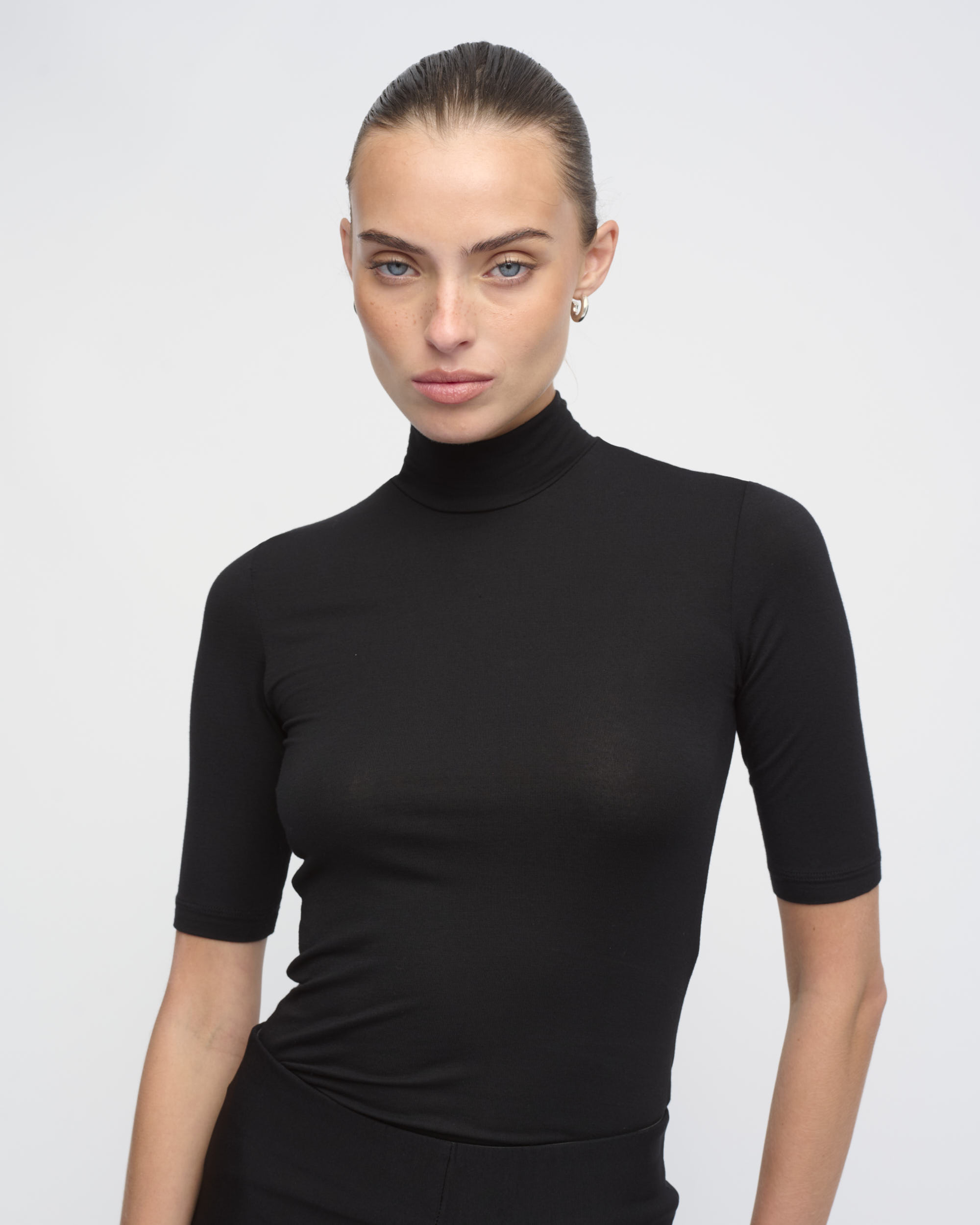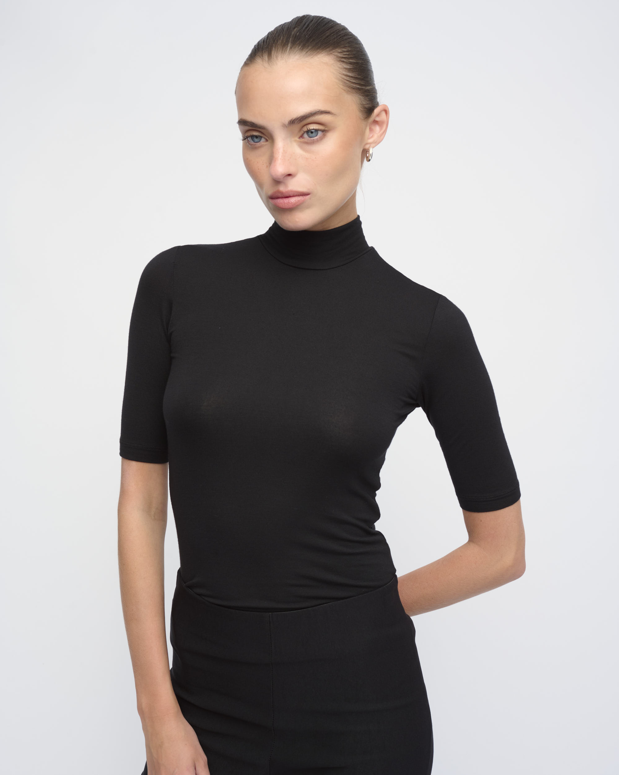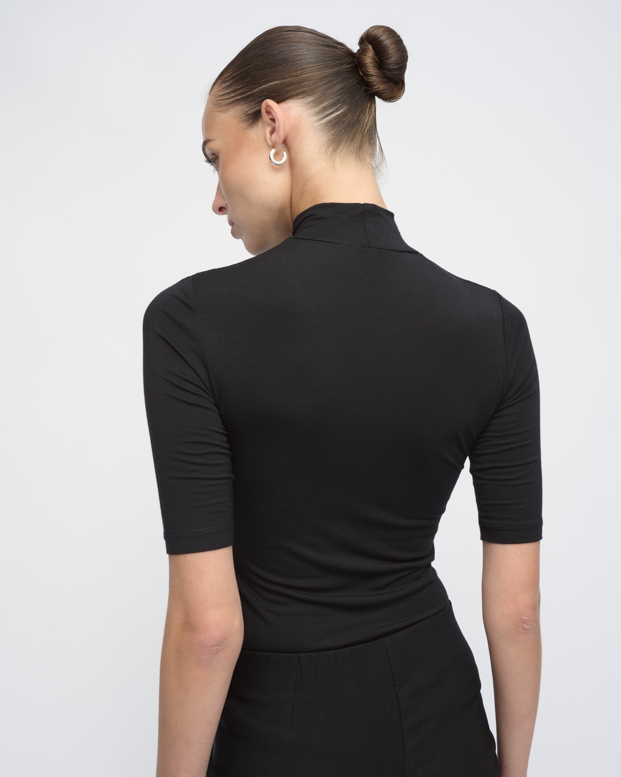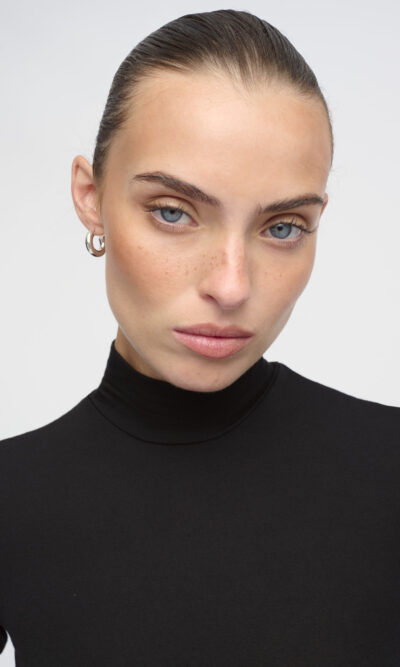 חולצה מסריג ויסקוזה דק. צללית צמודה לגוף. צוארון גולף, שרוולים באורך המרפק.