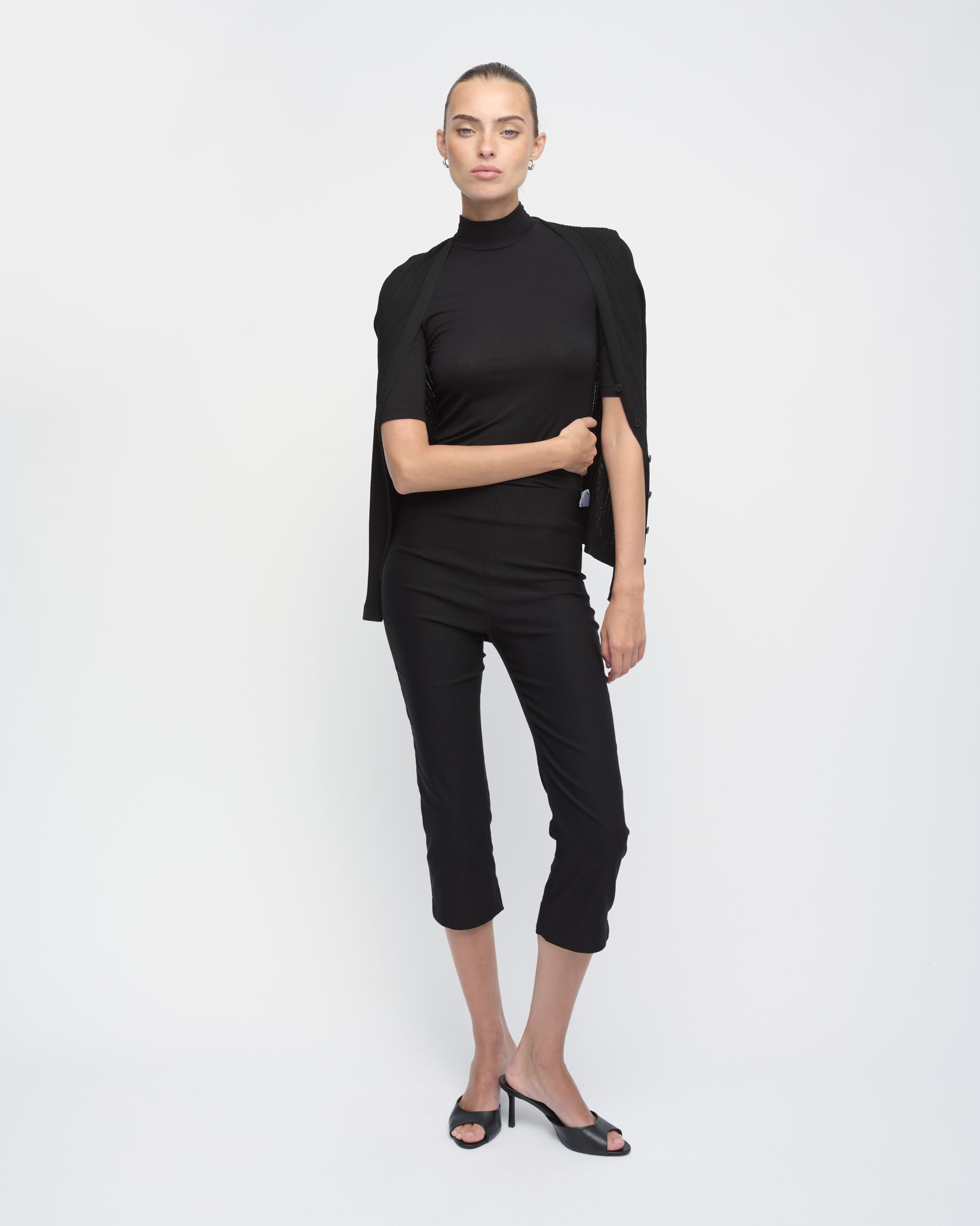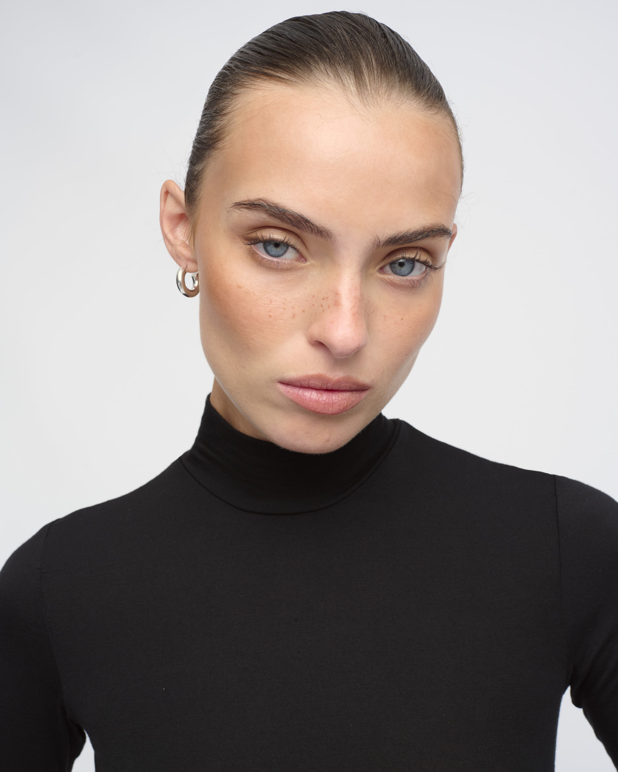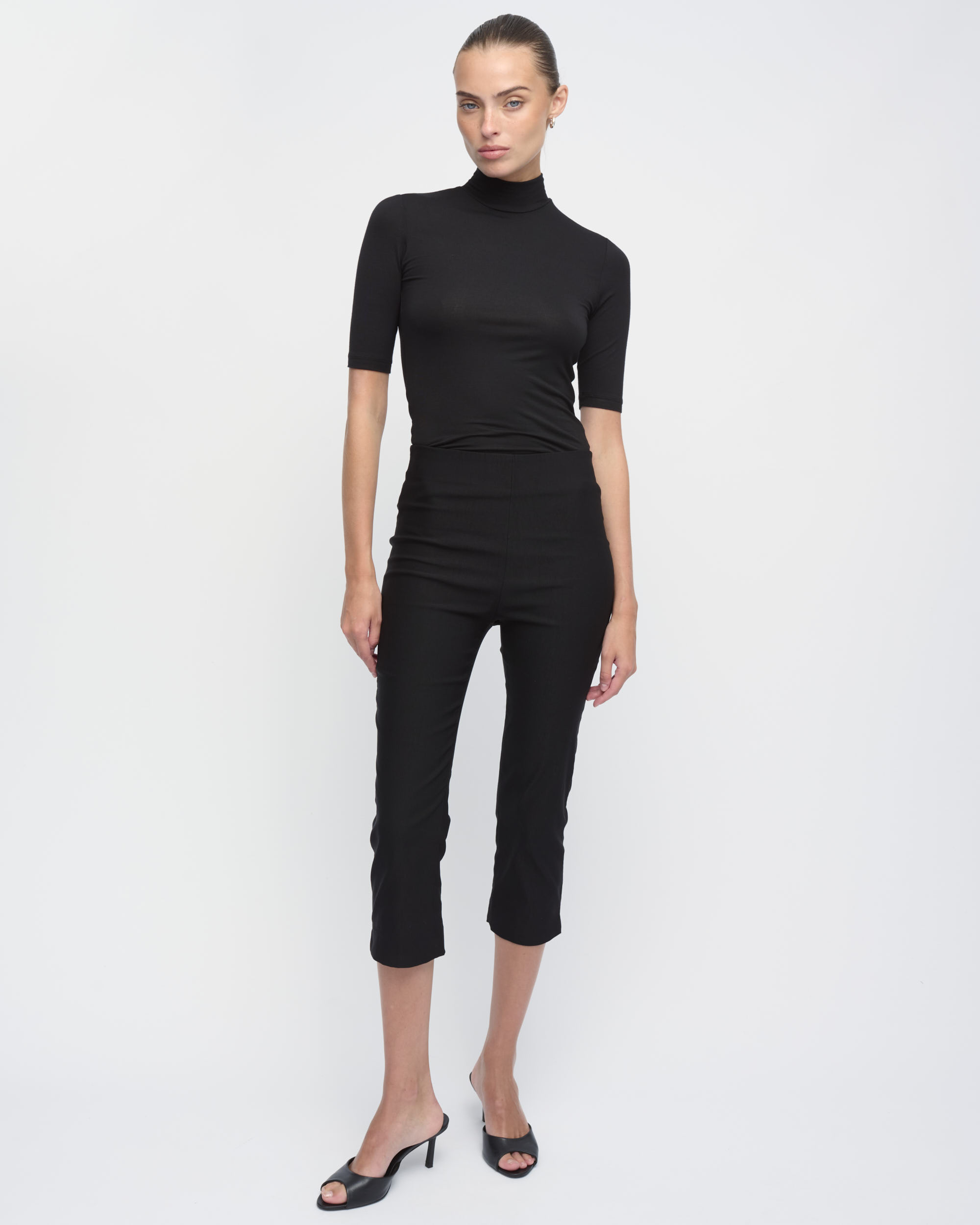 חולצה מסריג ויסקוזה דק. צללית צמודה לגוף. צוארון גולף, שרוולים באורך המרפק.