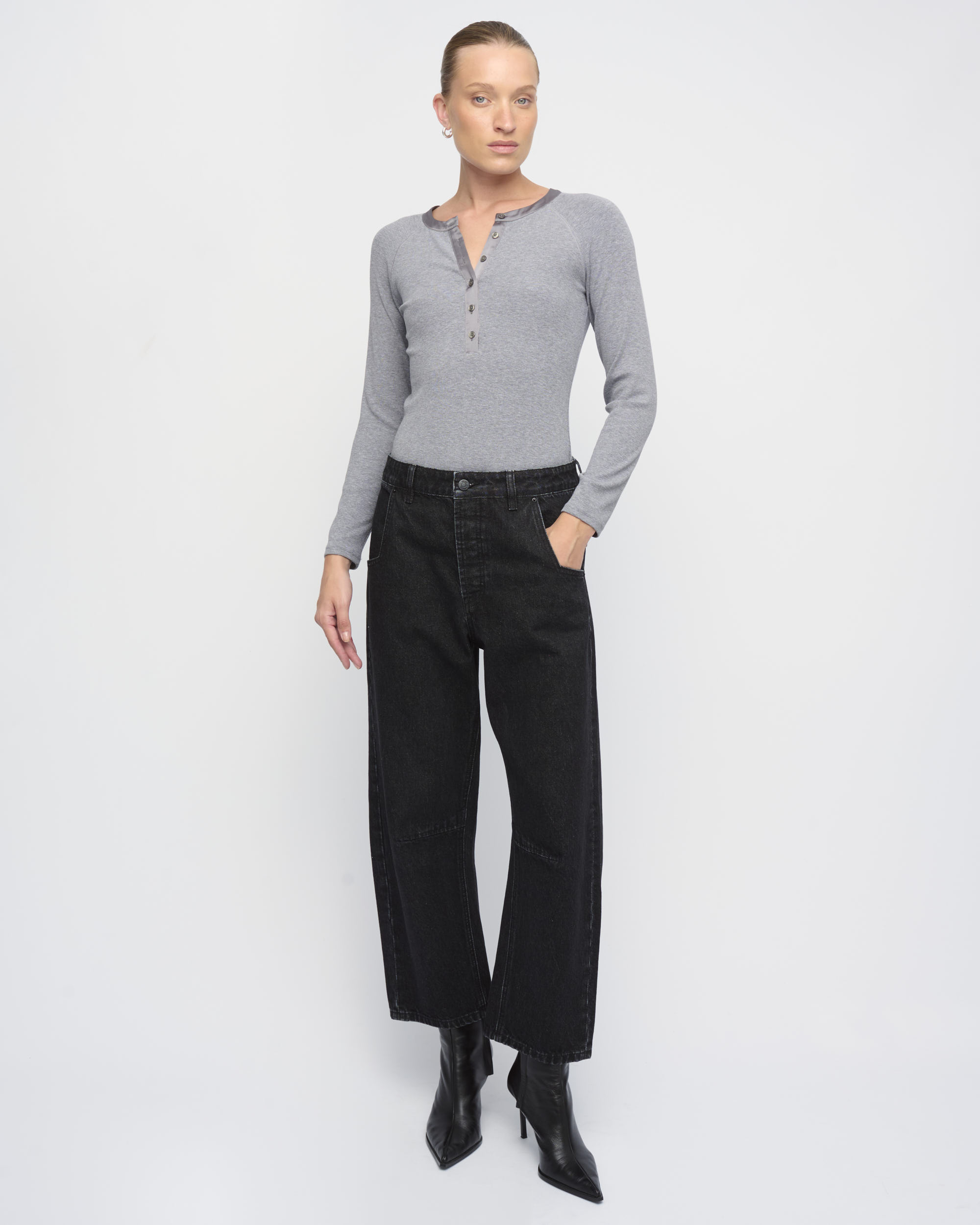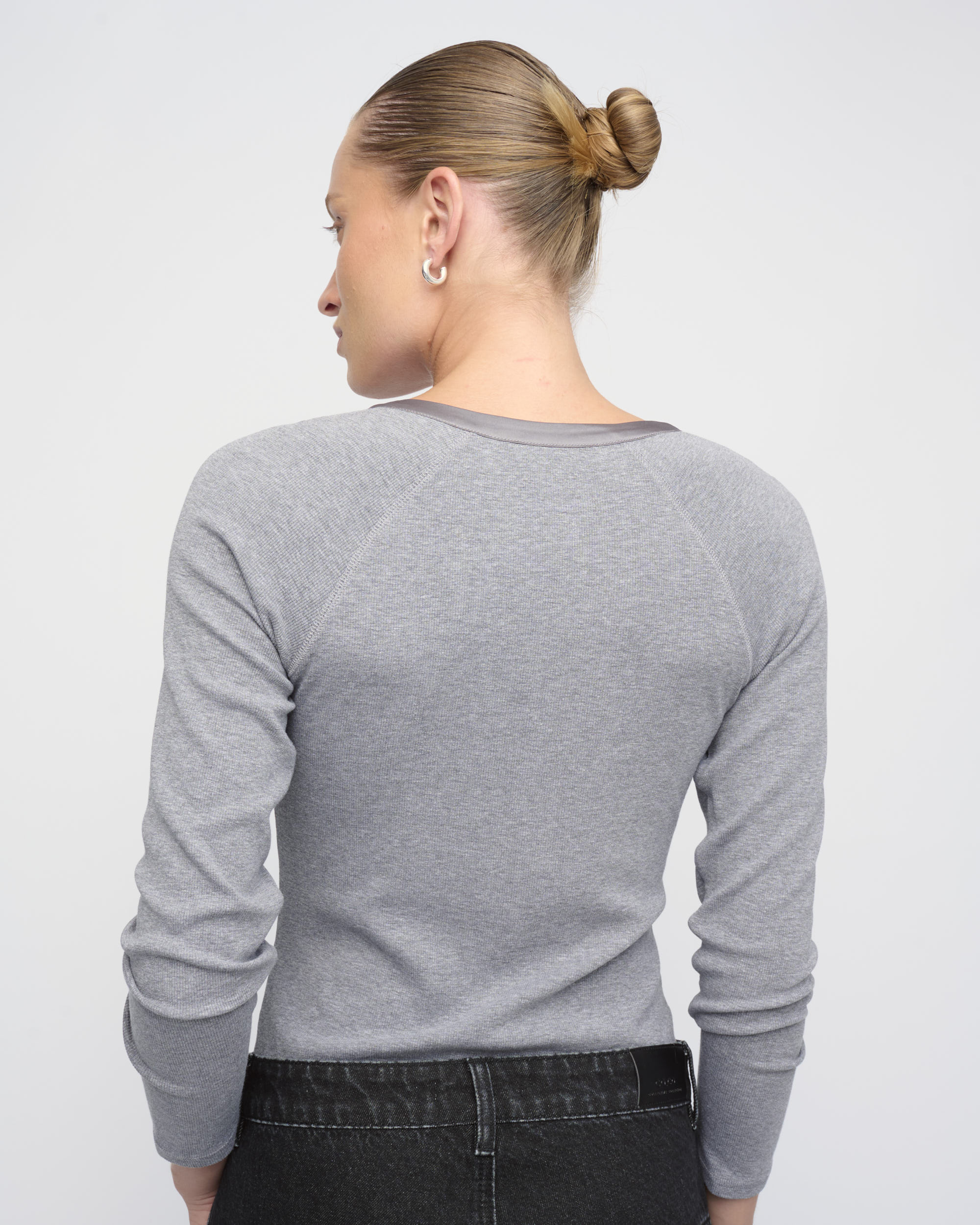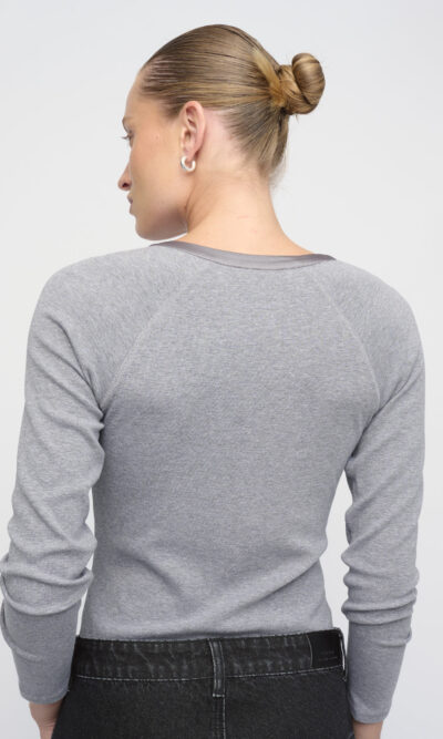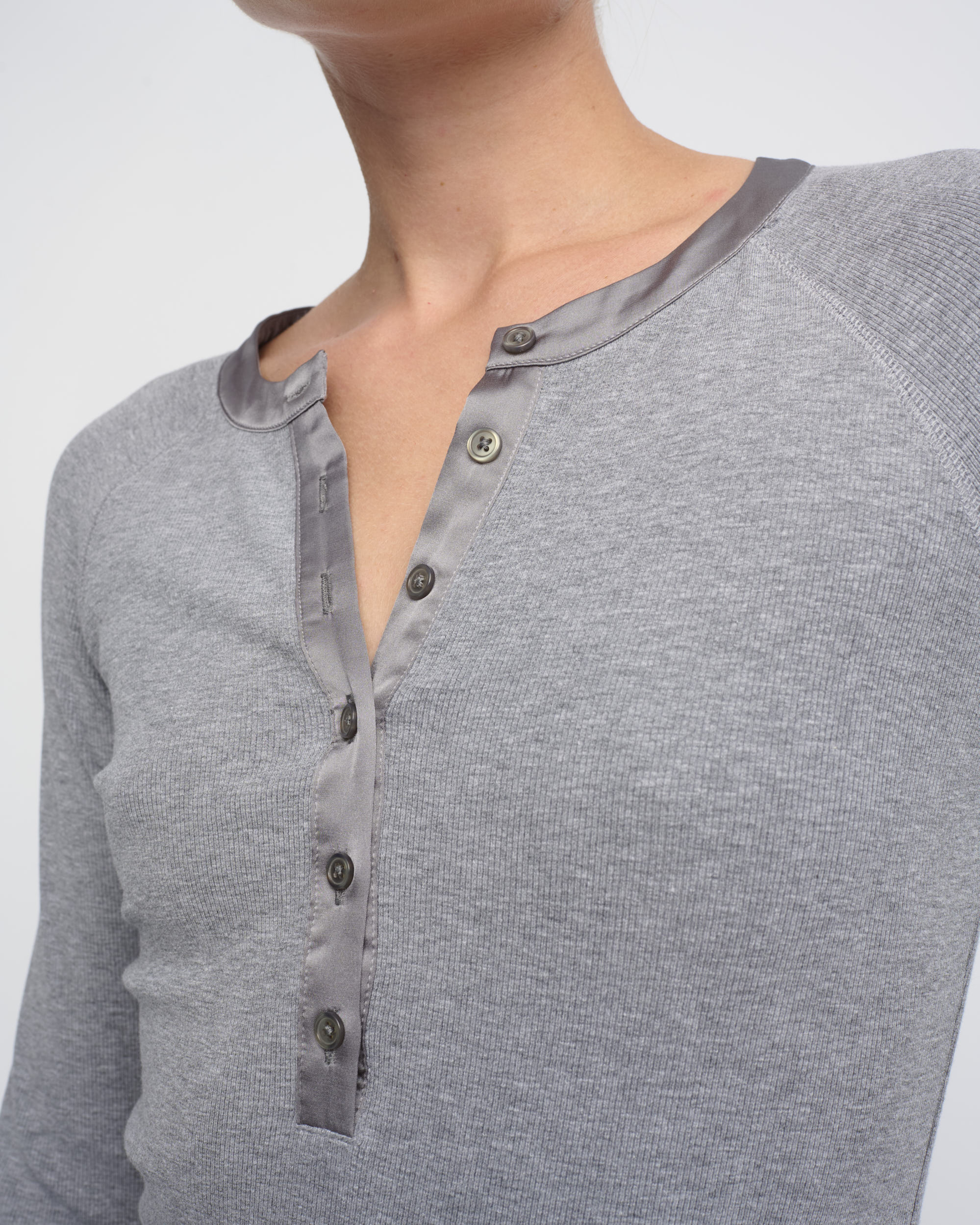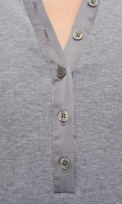 חולצת טי מסריג ריב. צללית צמודה. שרוול רגלן, מחשוף עם כפתרה בגימור סאטן.
