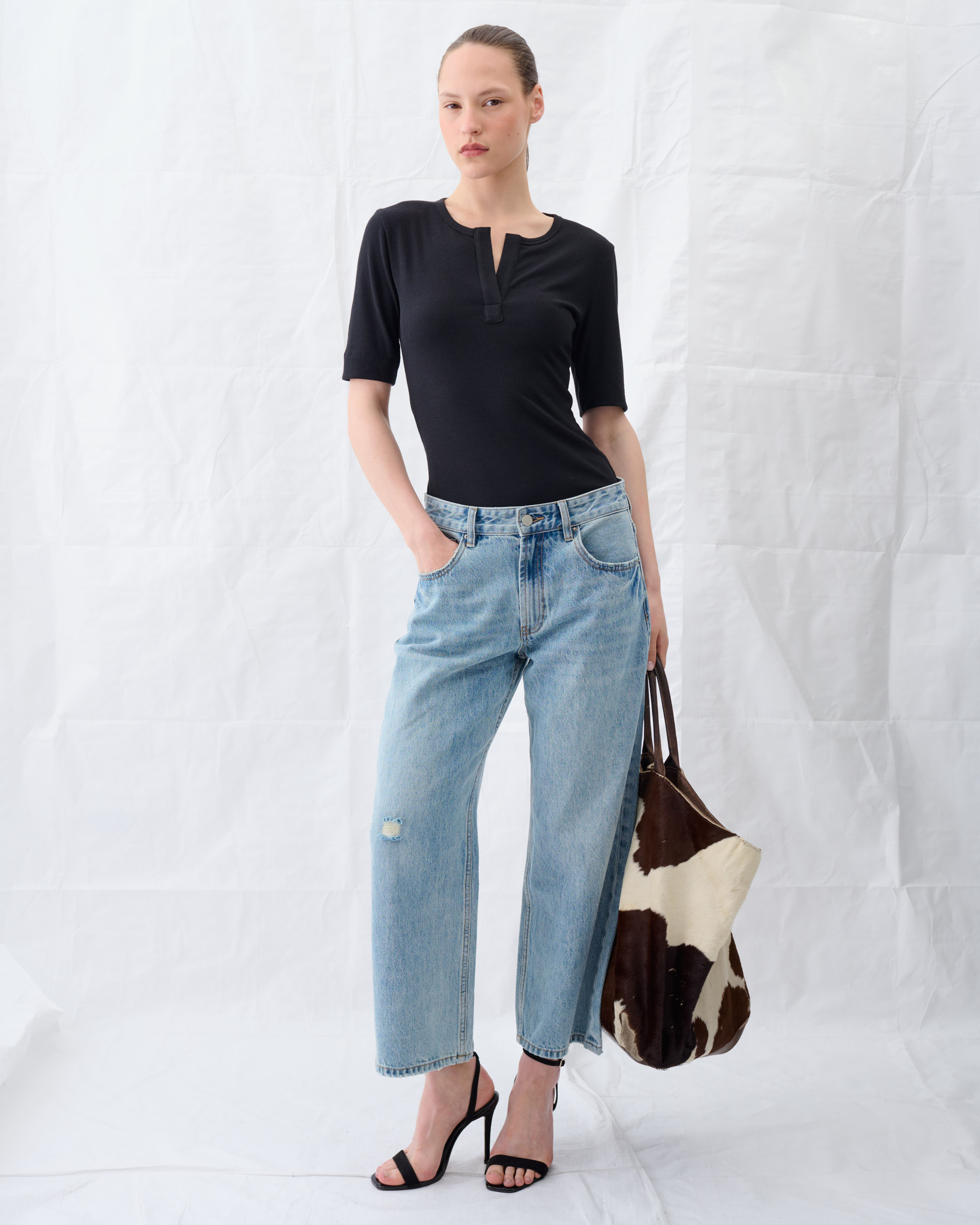 חולצת טי מסריג ויסקוזה בדוגמת ריב. צללית צמודה, מחשוף עגול עם מפתח בחזית.