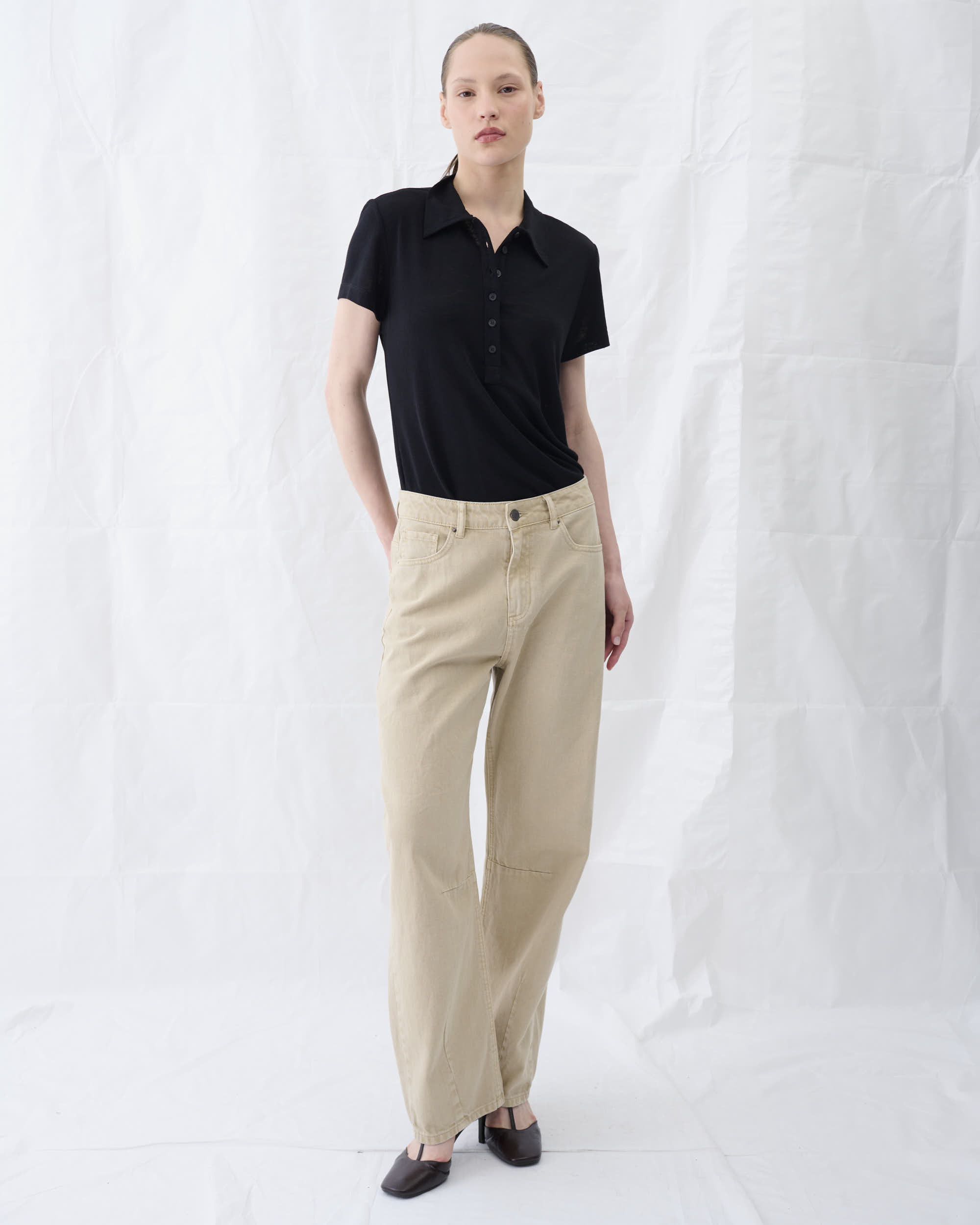 חולצה מסריג ויסקוזה מעורב, צללית קרובה לגוף. שרוול קצר, צוארון פולו.