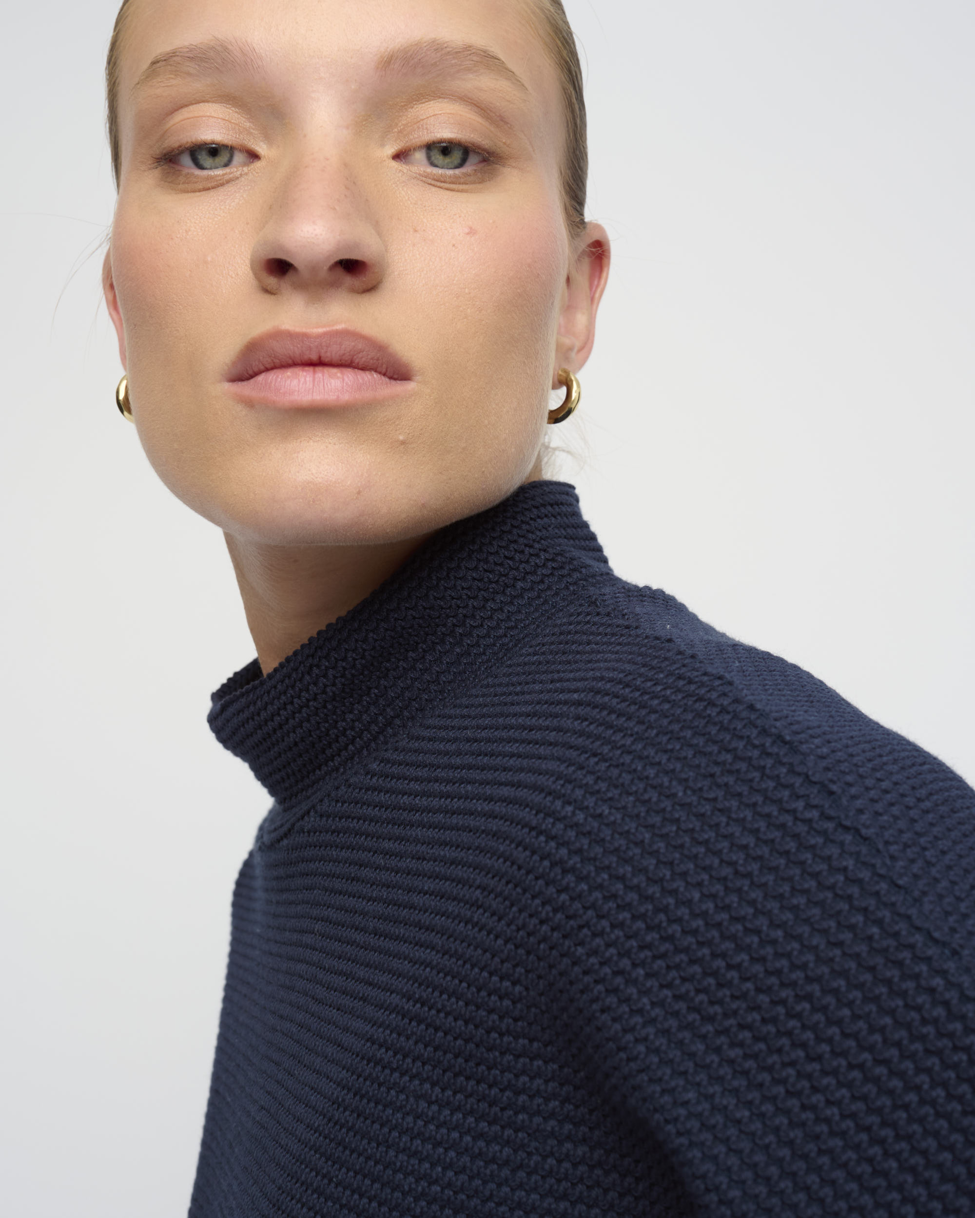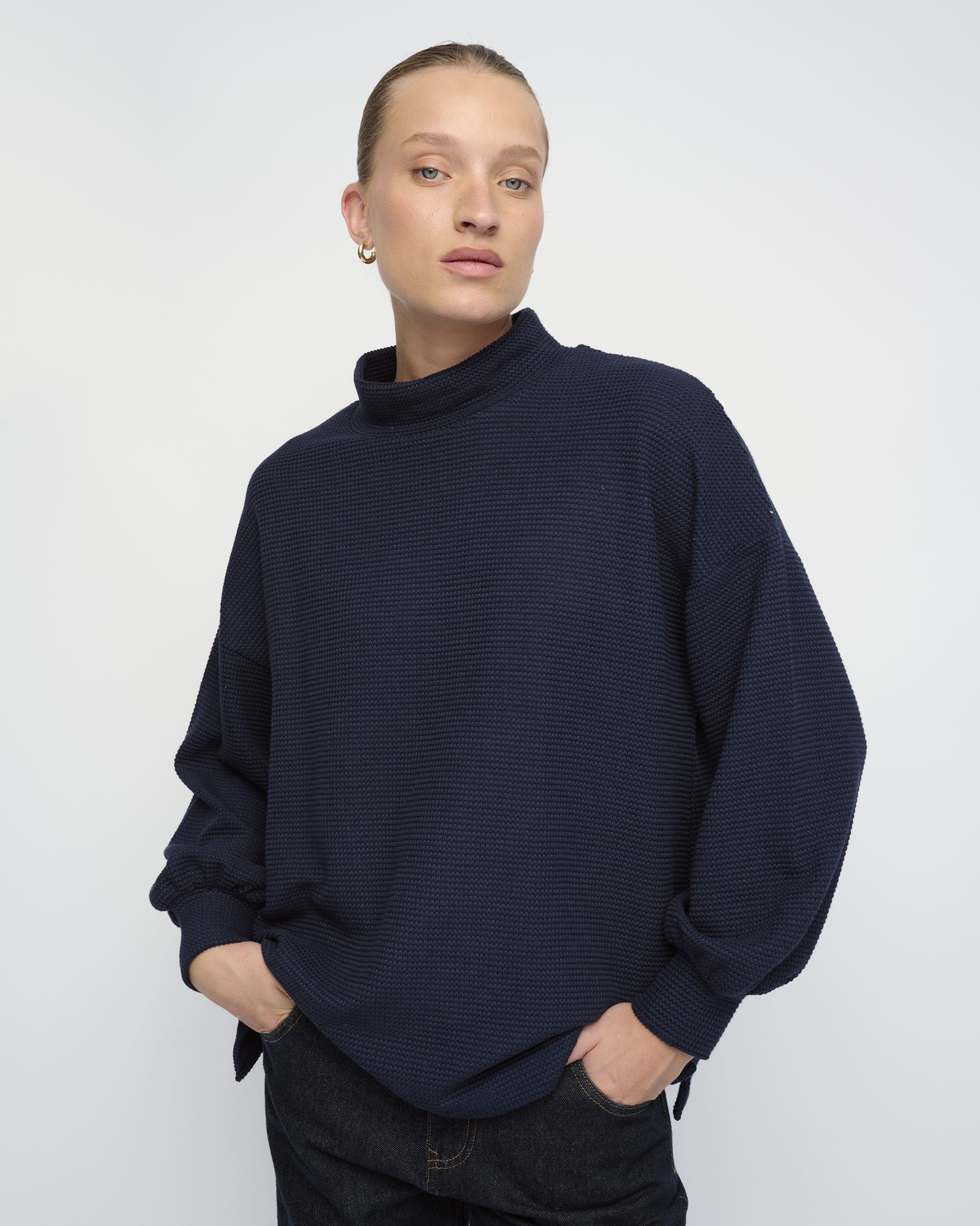 חולצה מסריג וואפל. צללית רחבה, שרוולים רחבים נאספים לחפת רחב. עם צוארון גולף רחב.