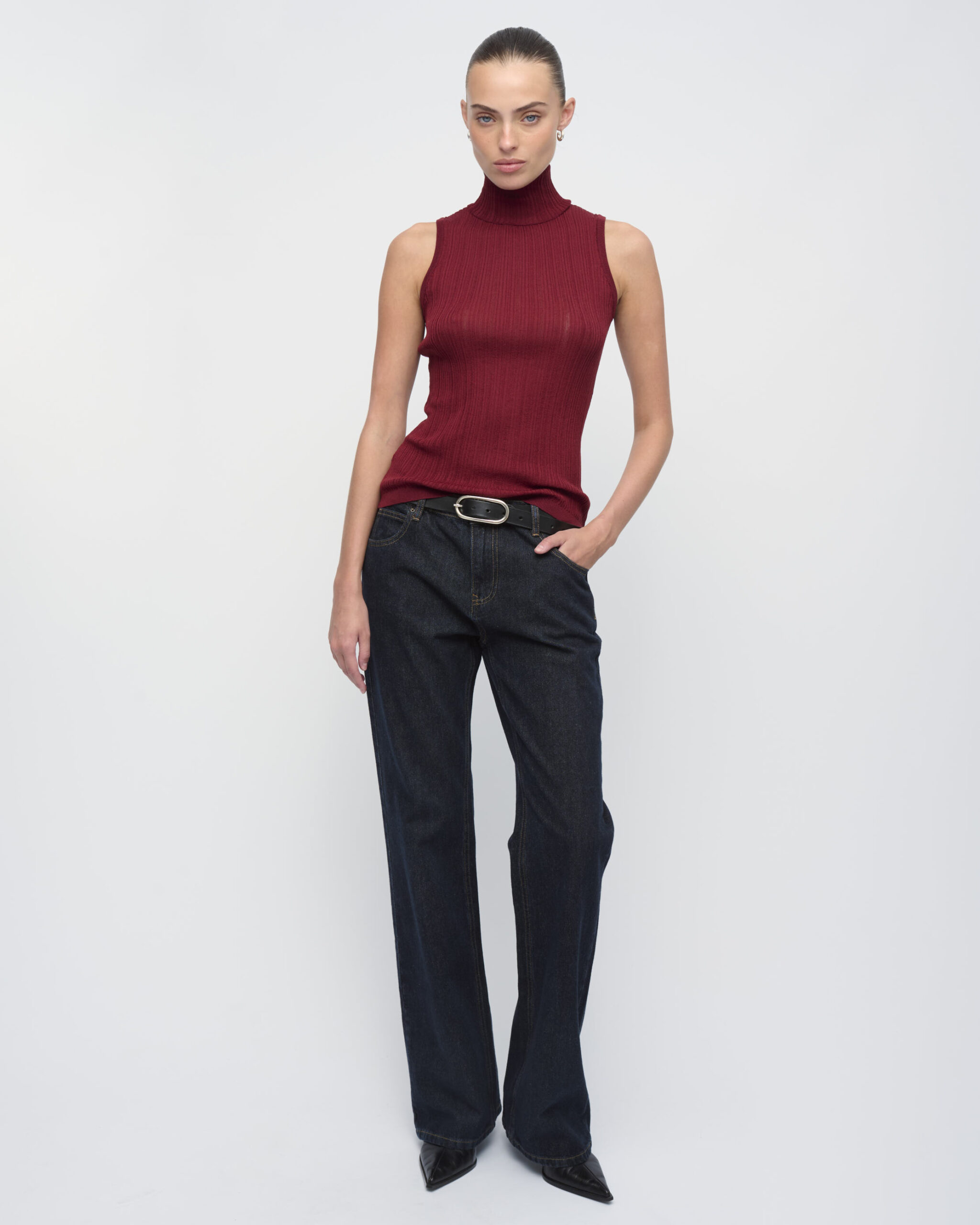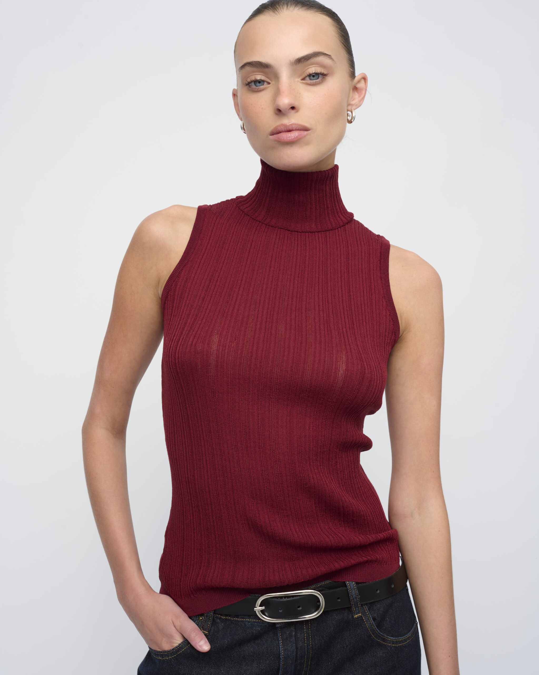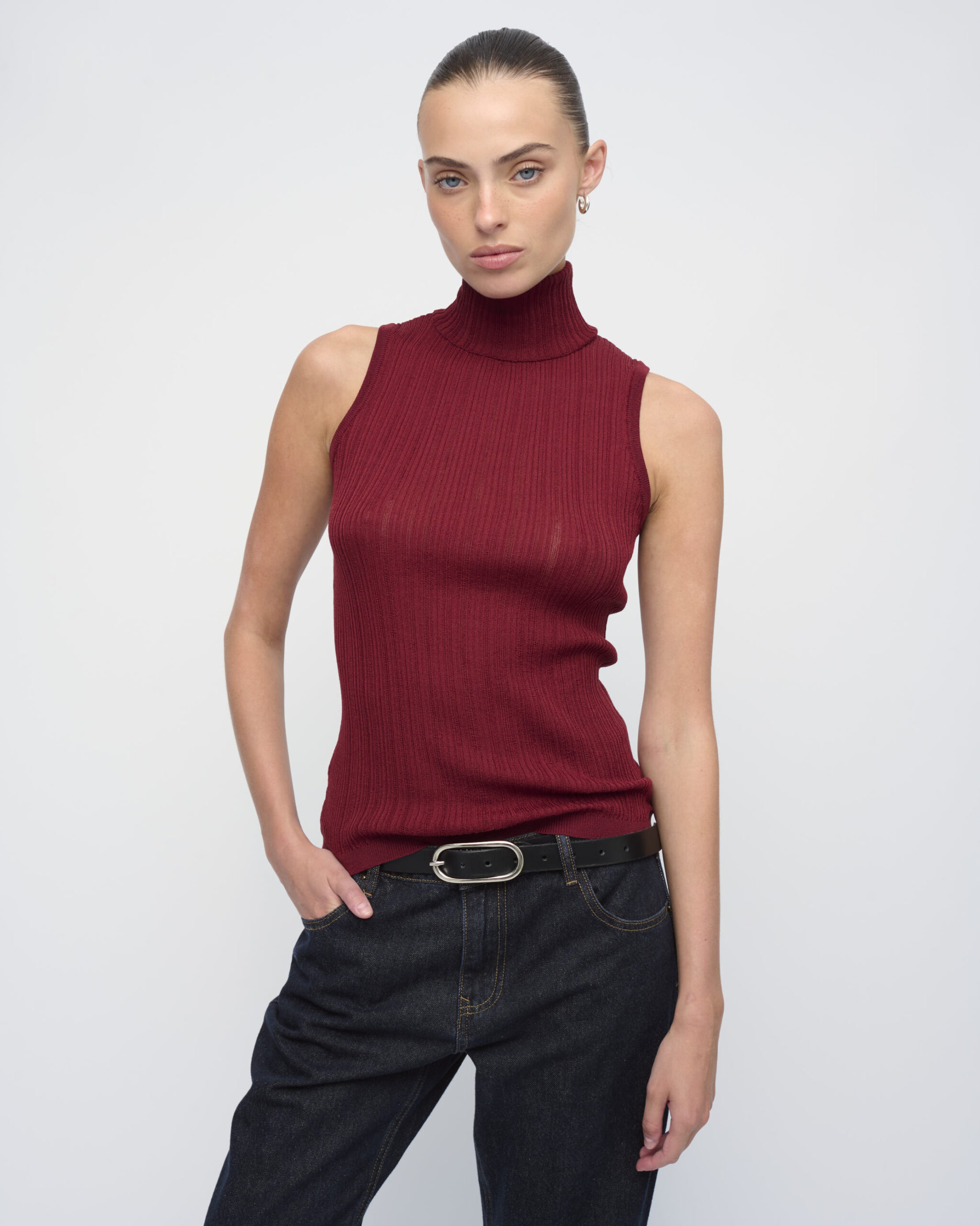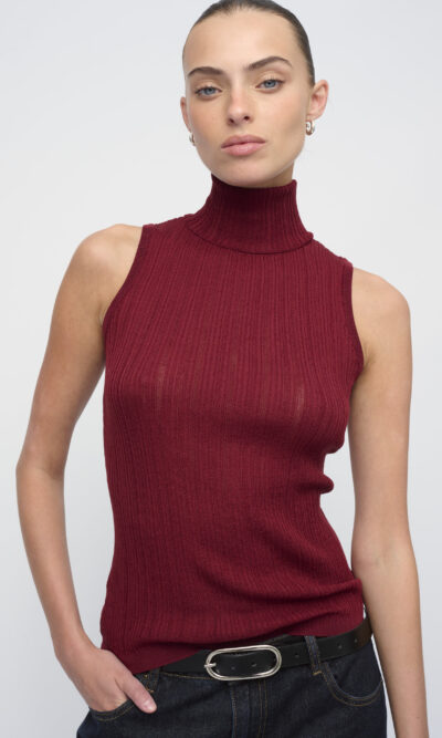 טופ בסריגת ריב מגוונת. צללית צמודה, ללא שרוולים, עם צוארון גולף מתקפל.