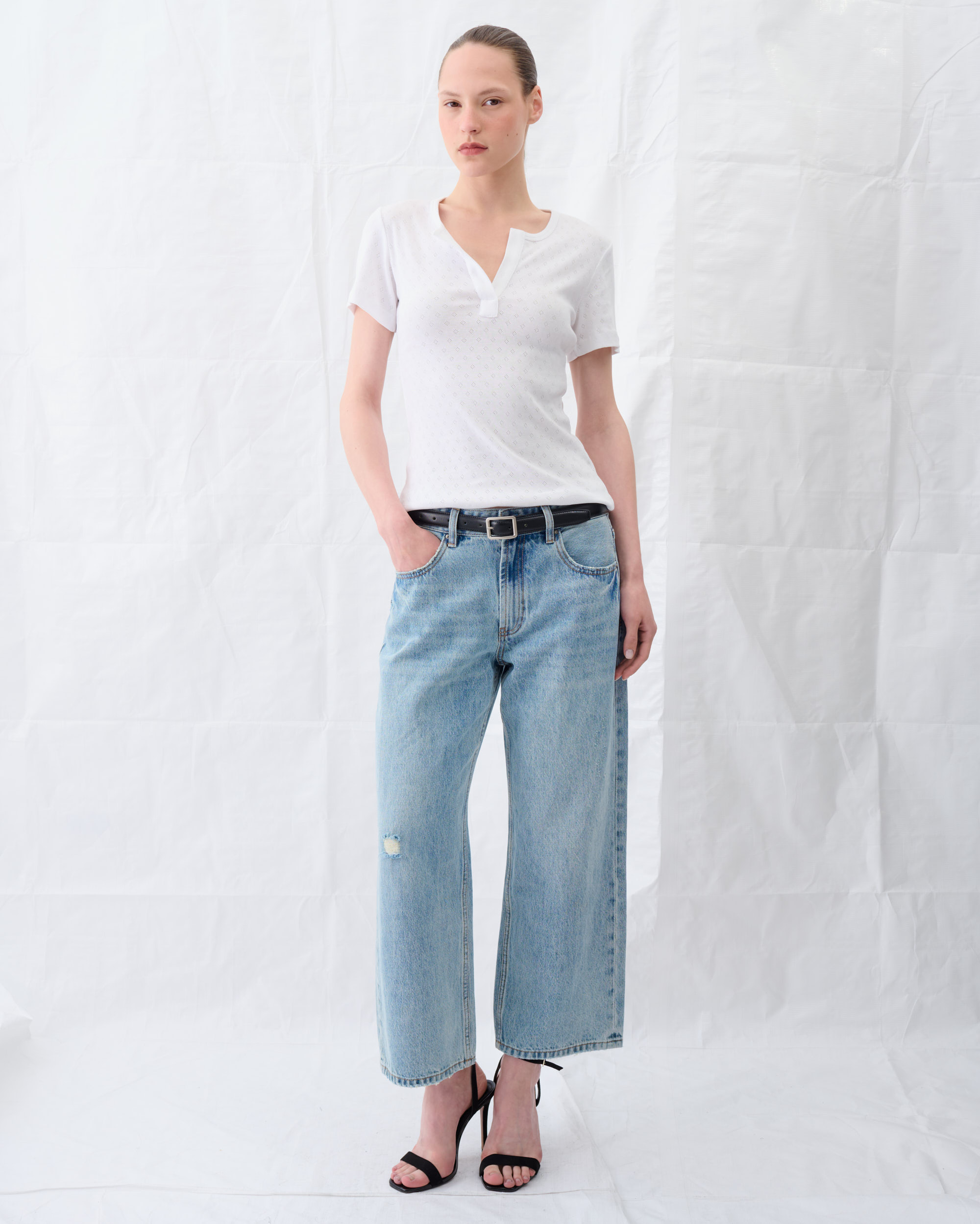 חולצה מסריג כותנה בדוגמת תחרה פוינטל. שרוול קצר, מחשוף עגול עם מפתח עמוק.