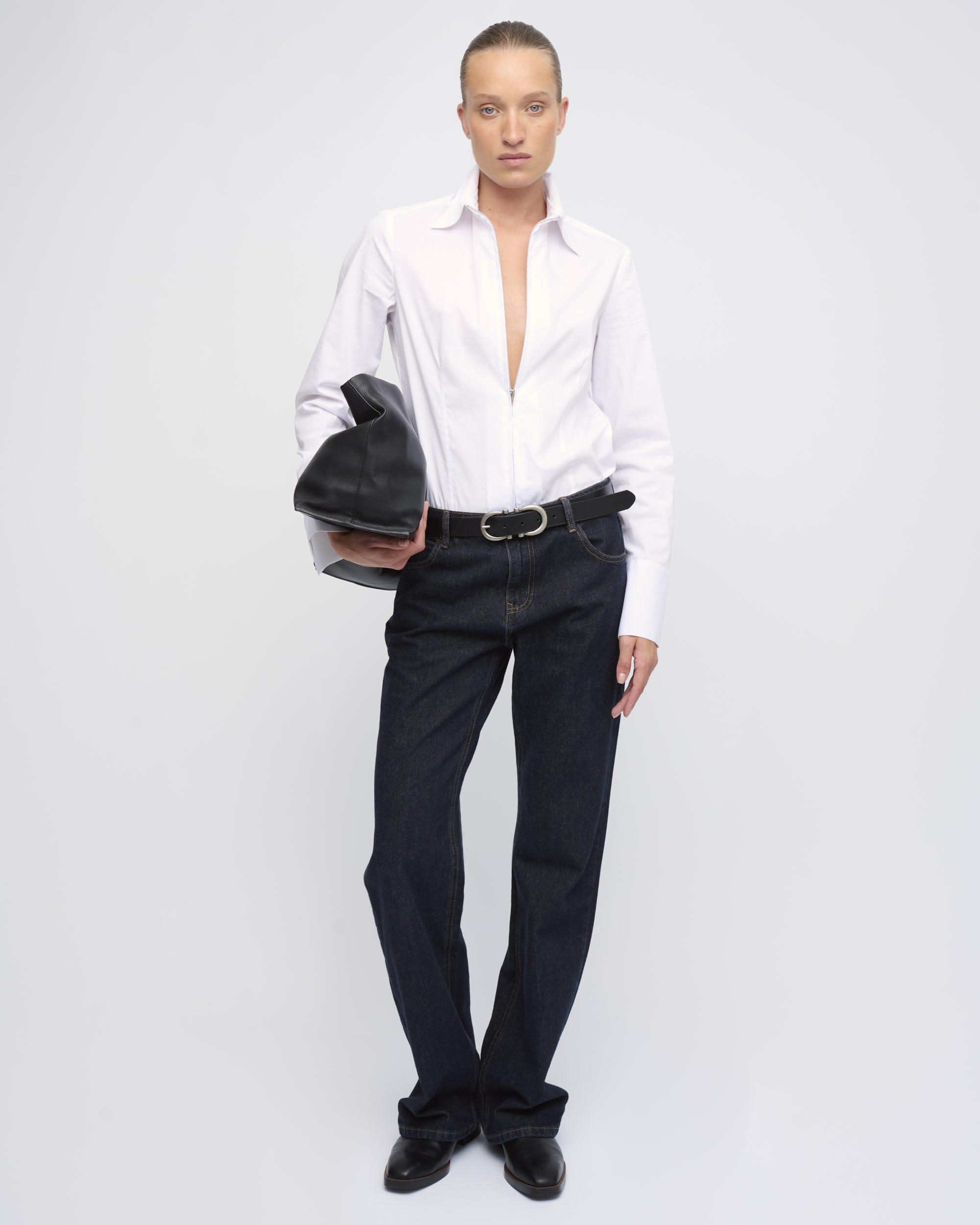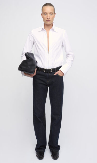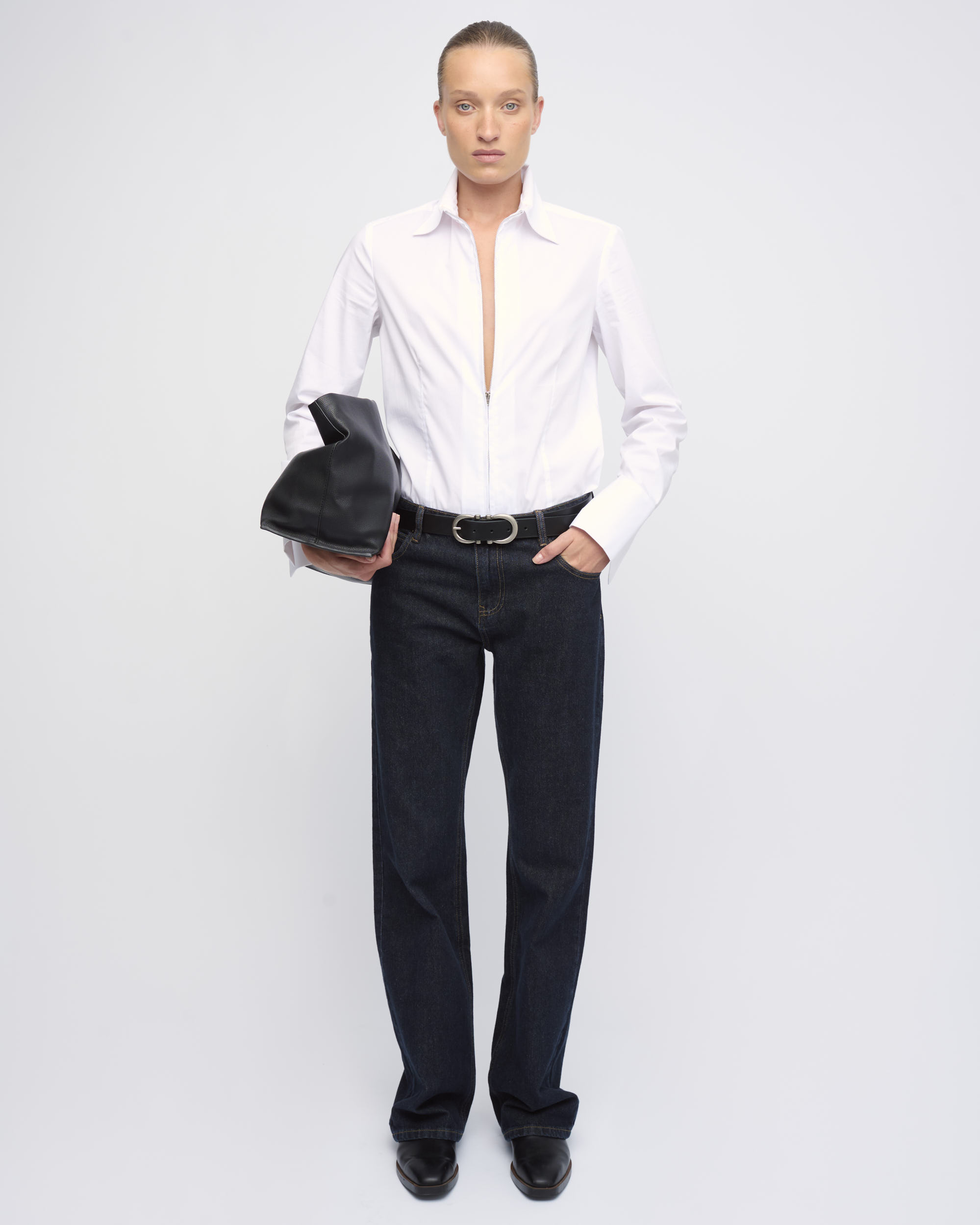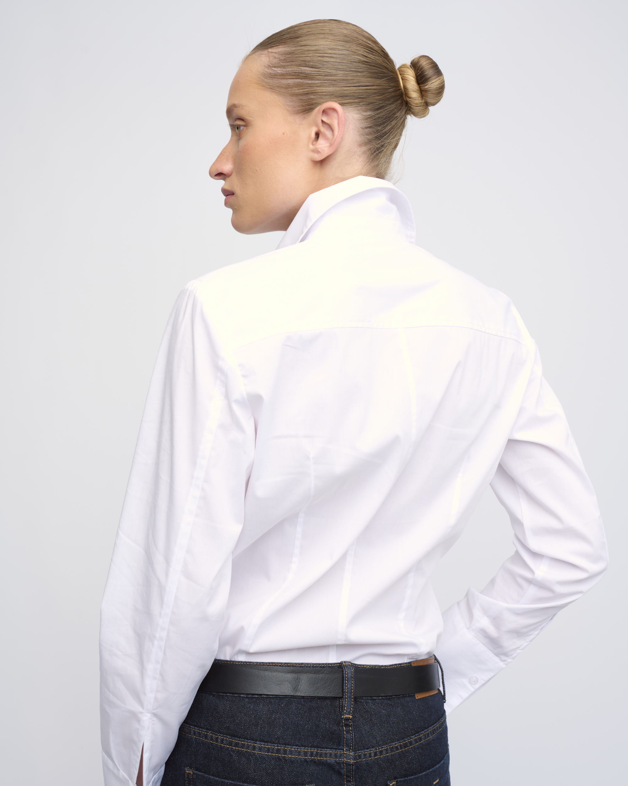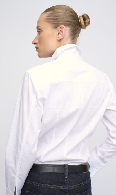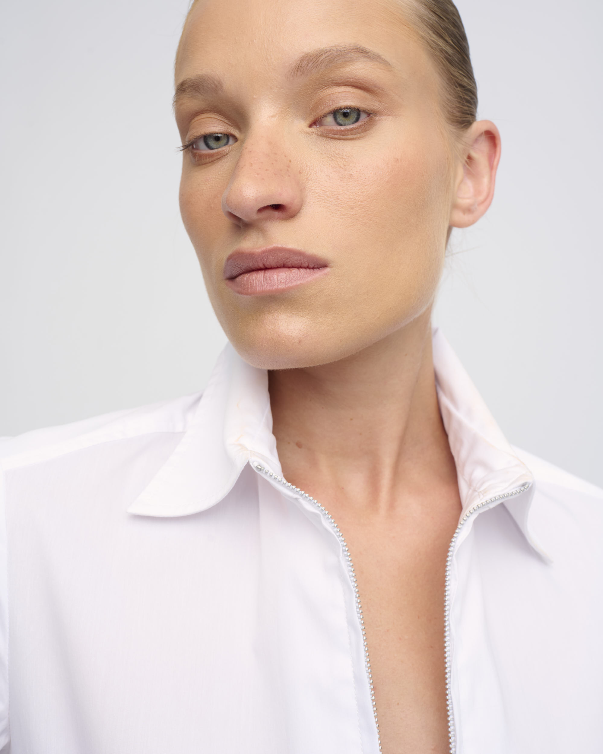 חולצה מכותנה ליקרה בצללית שעון חול, עם סגירת רוכסן בחזית.