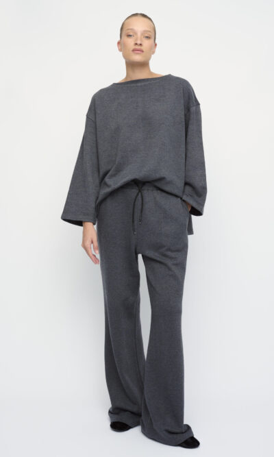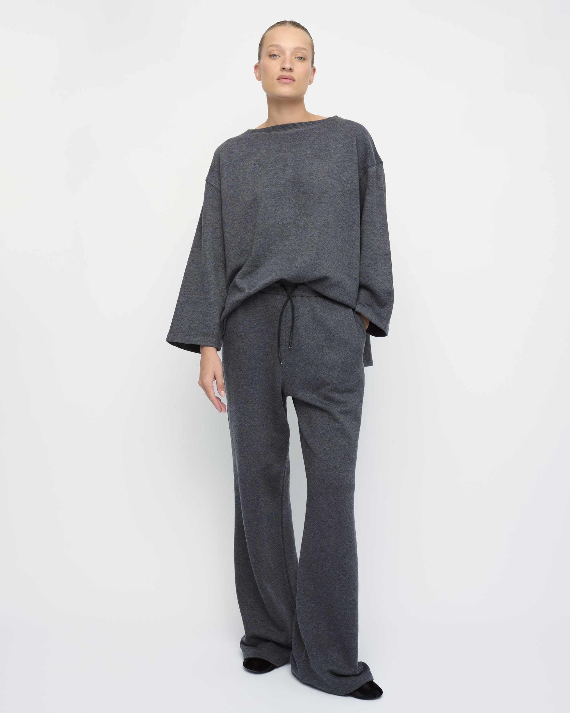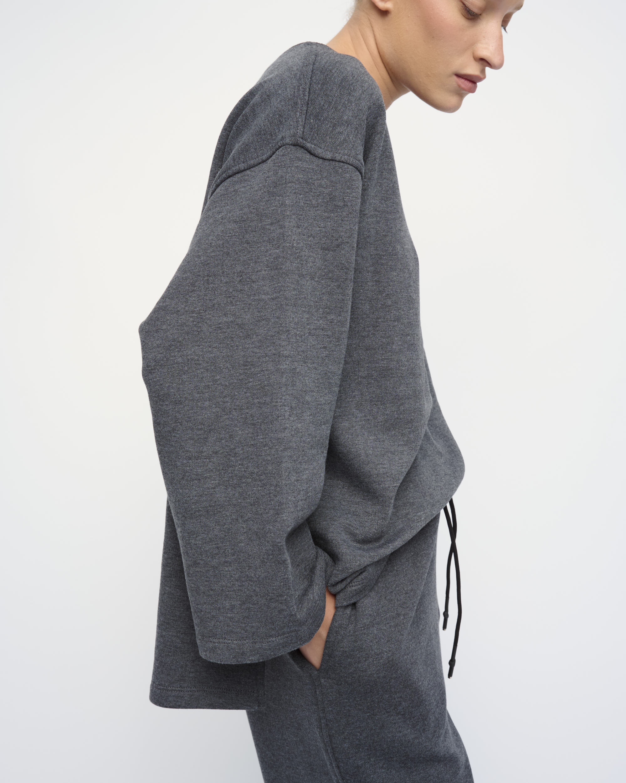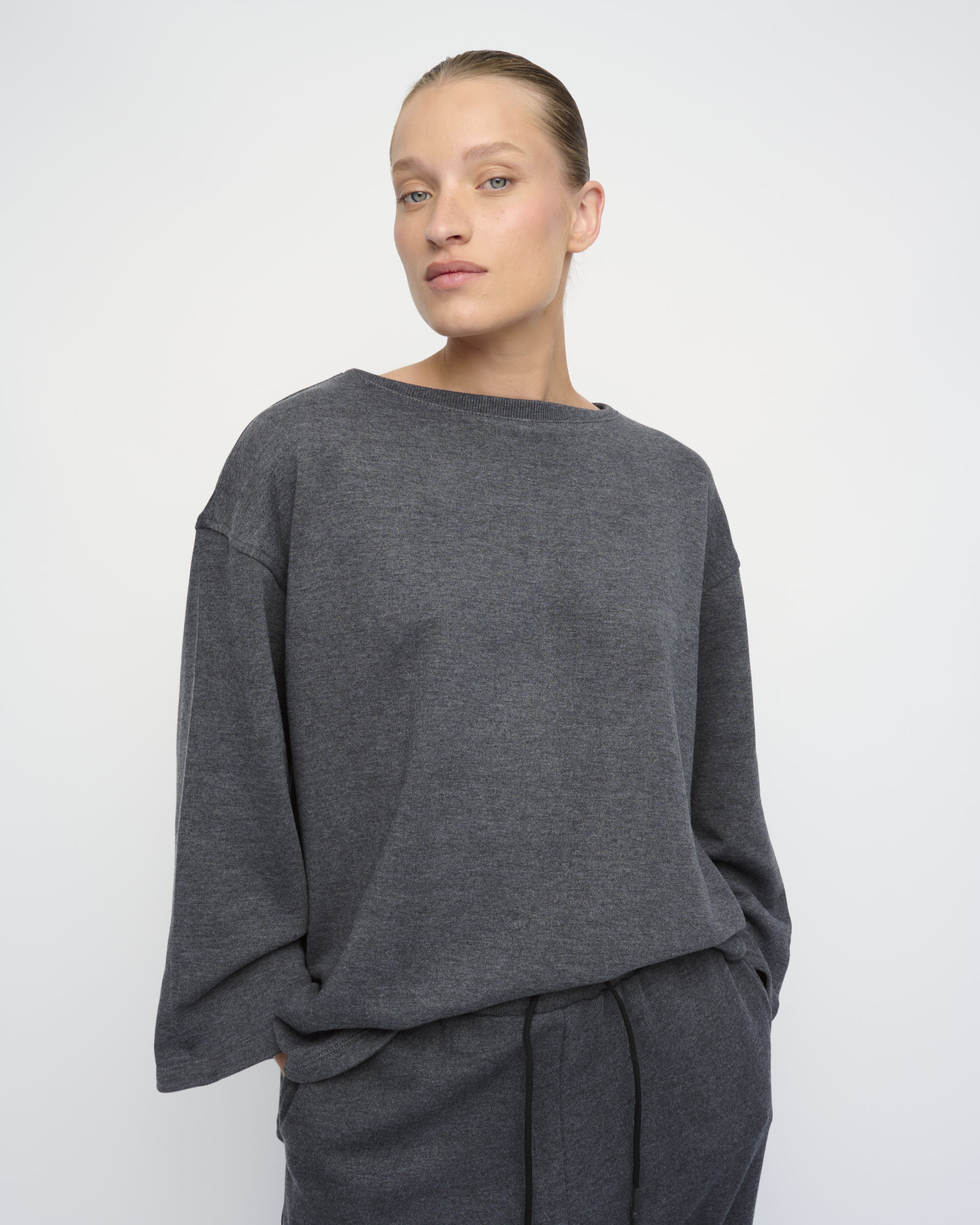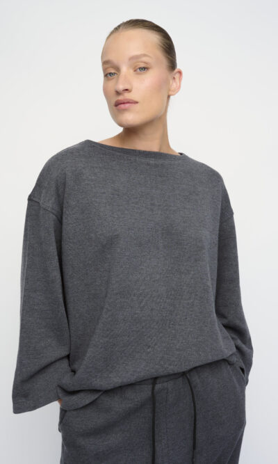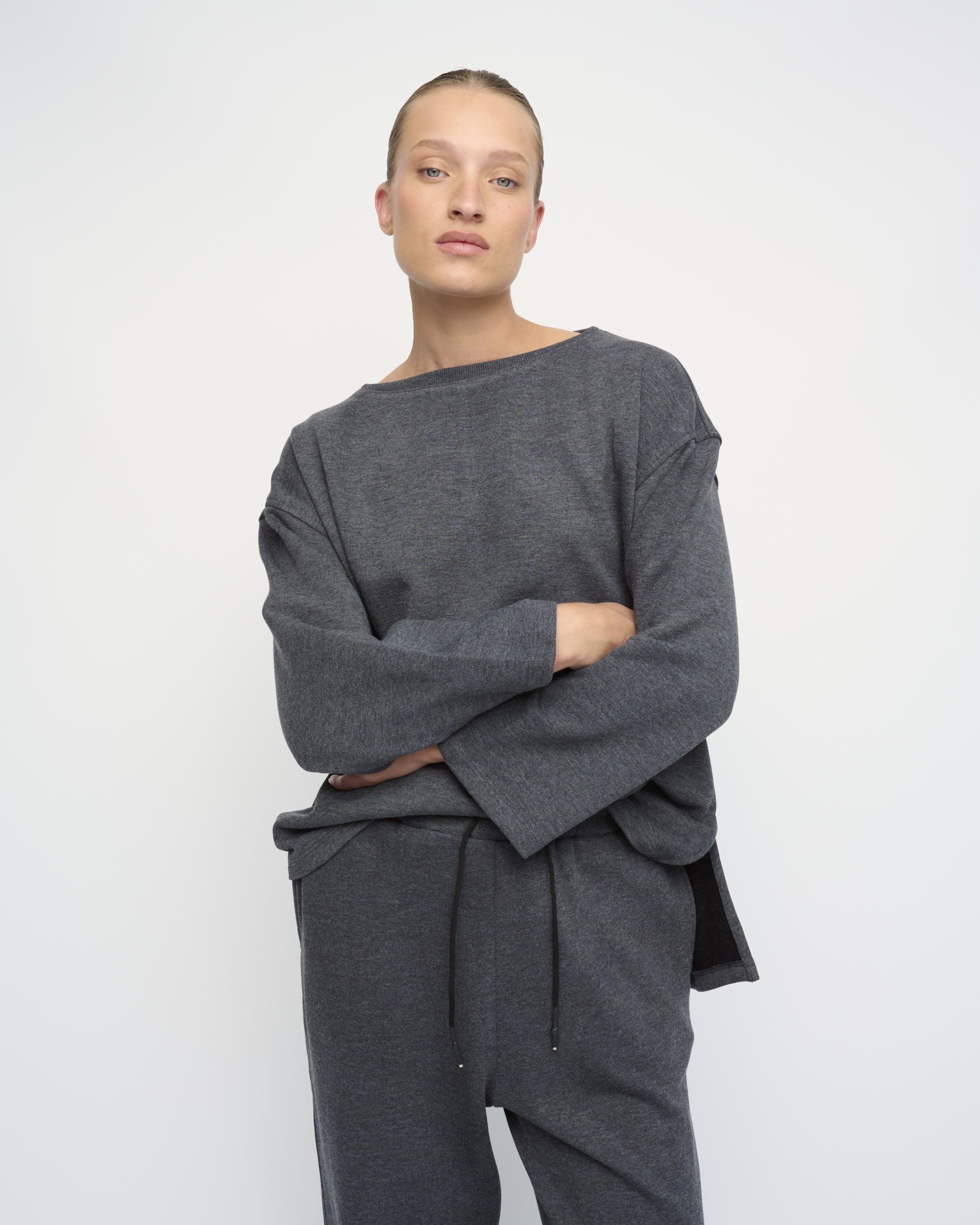 טופ מסריג פרנץ’ טרי כותנה. צללית רחוקה מהגוף, שרוול רחב, מחשוף סירה.