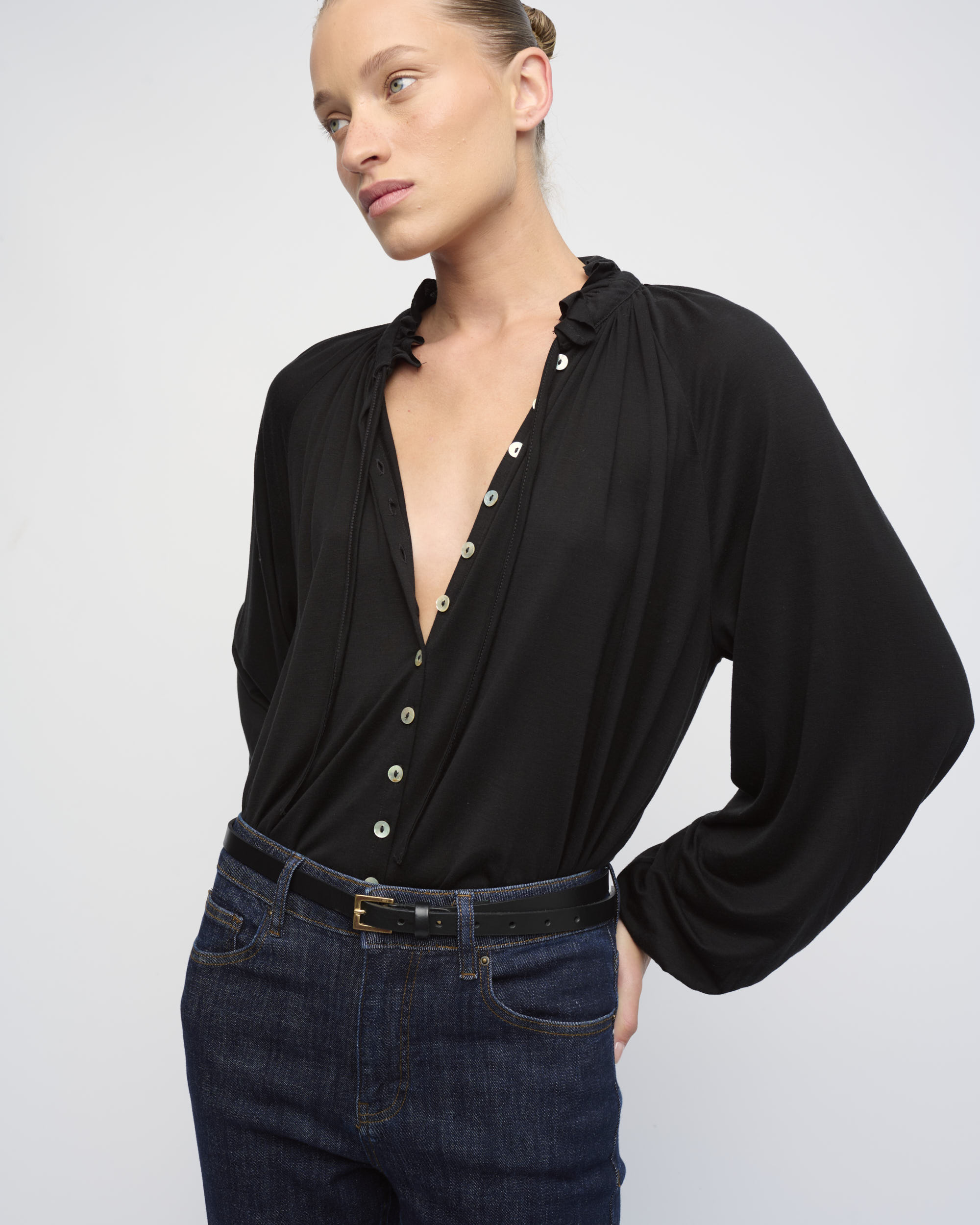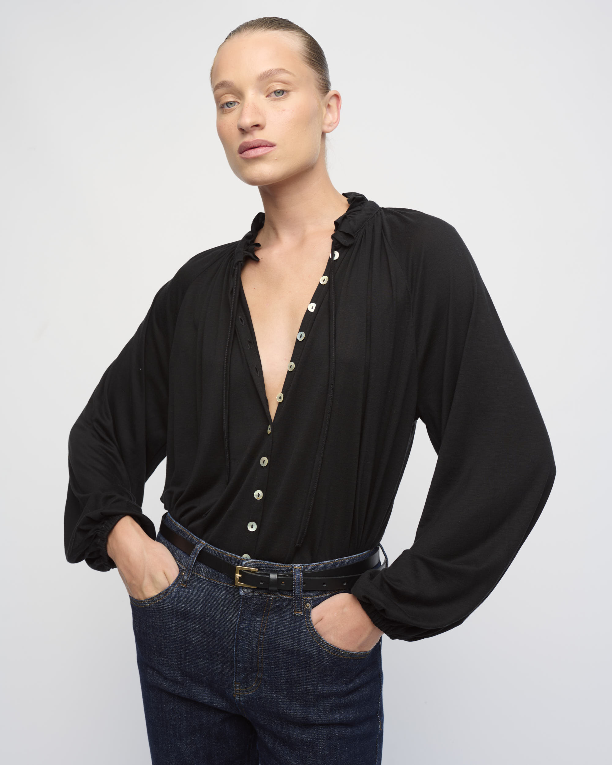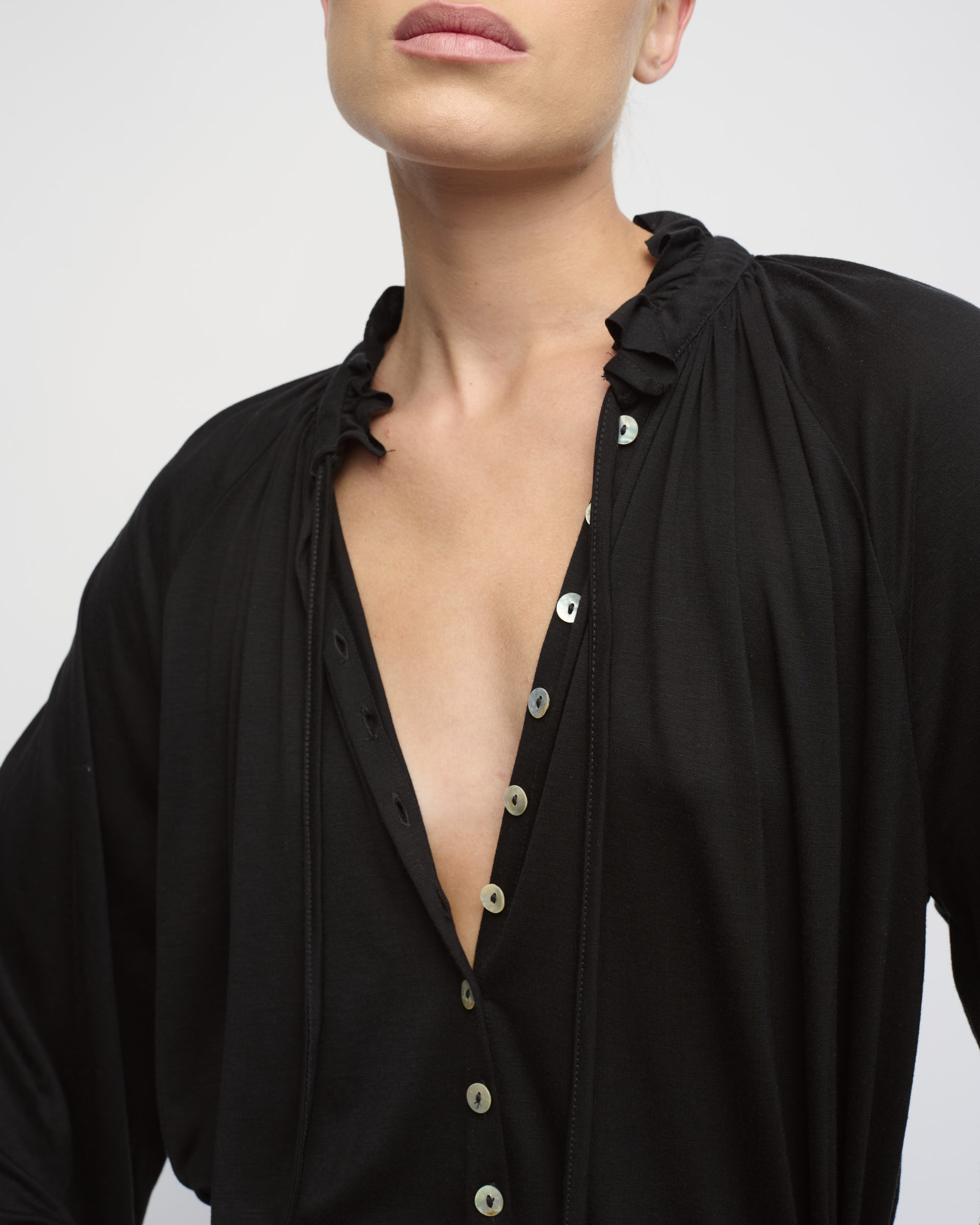 חולצה במראה רומנטי מסריג טנסל. צללית רחבה, כיווצים במחשוף, סגירת כפתורים בחזית.
