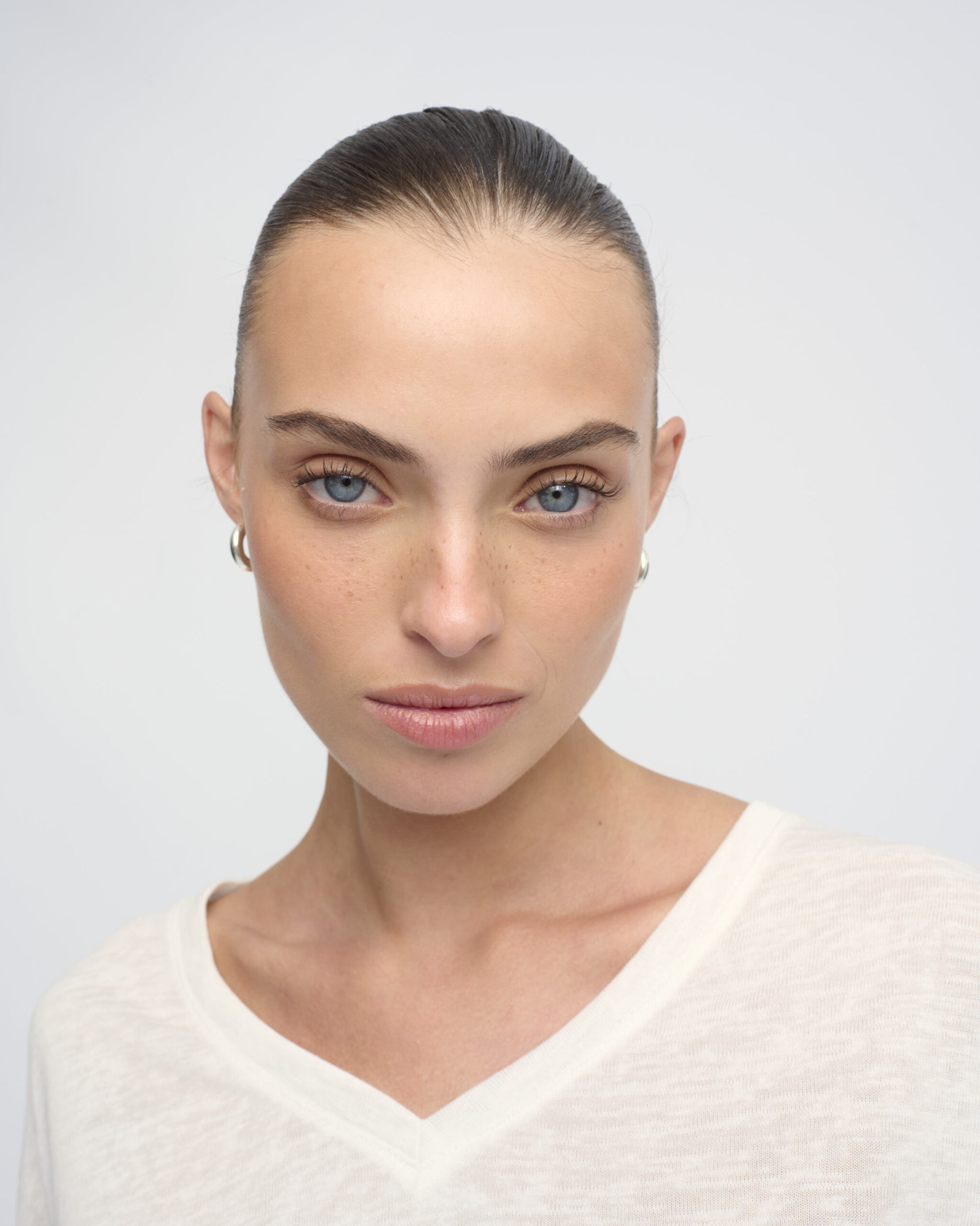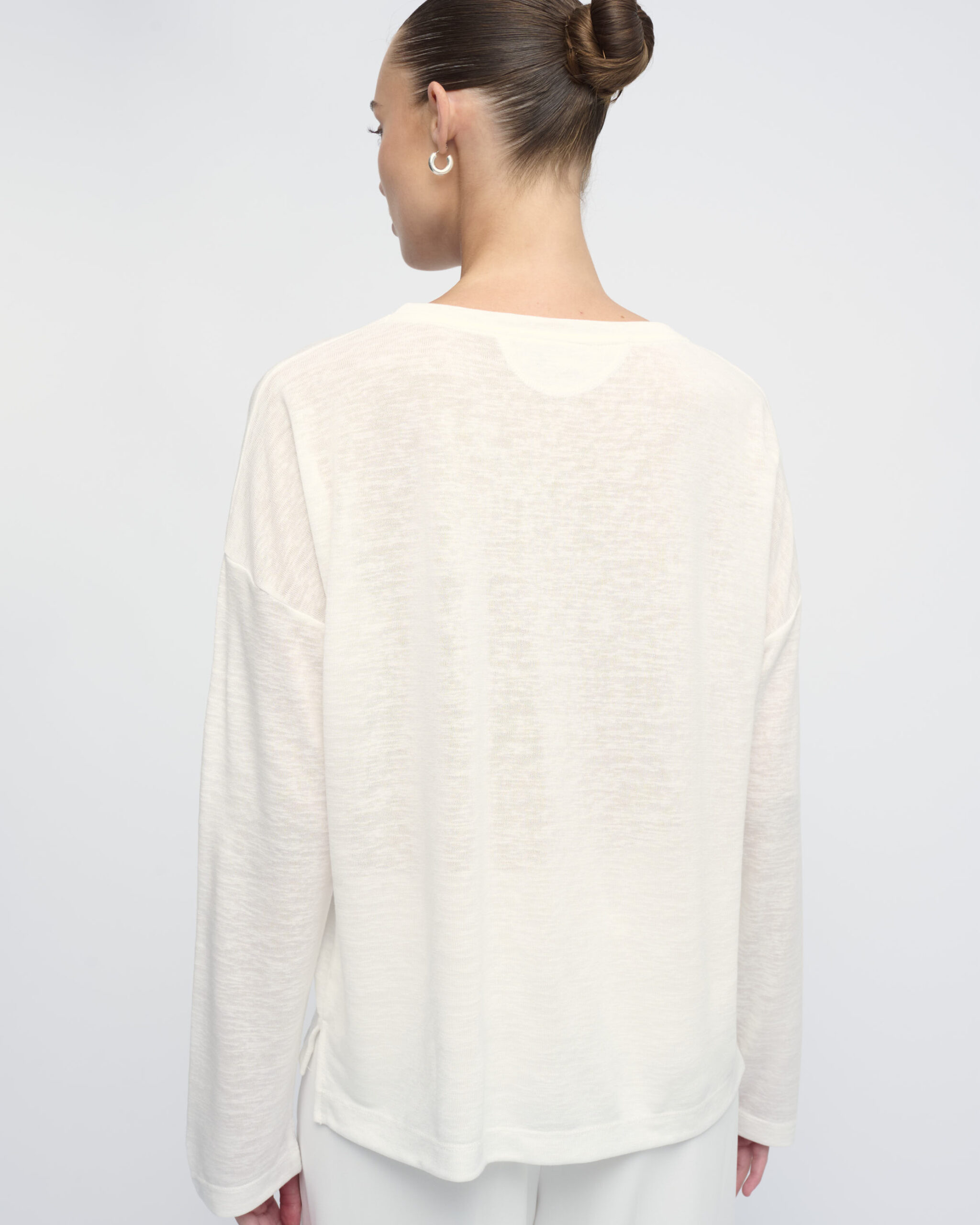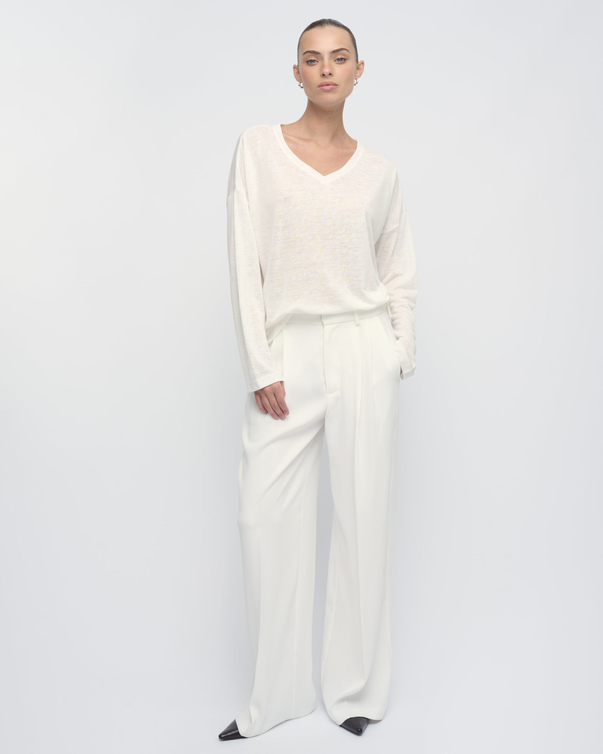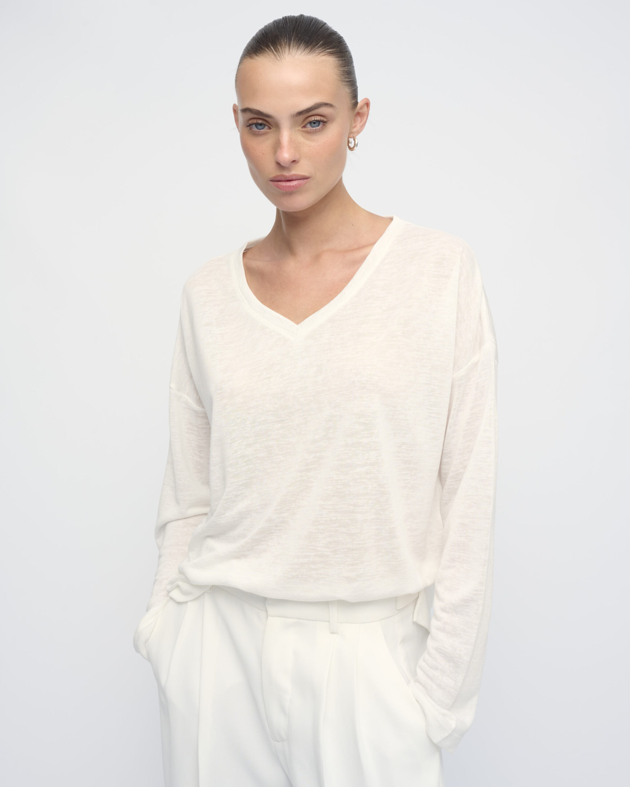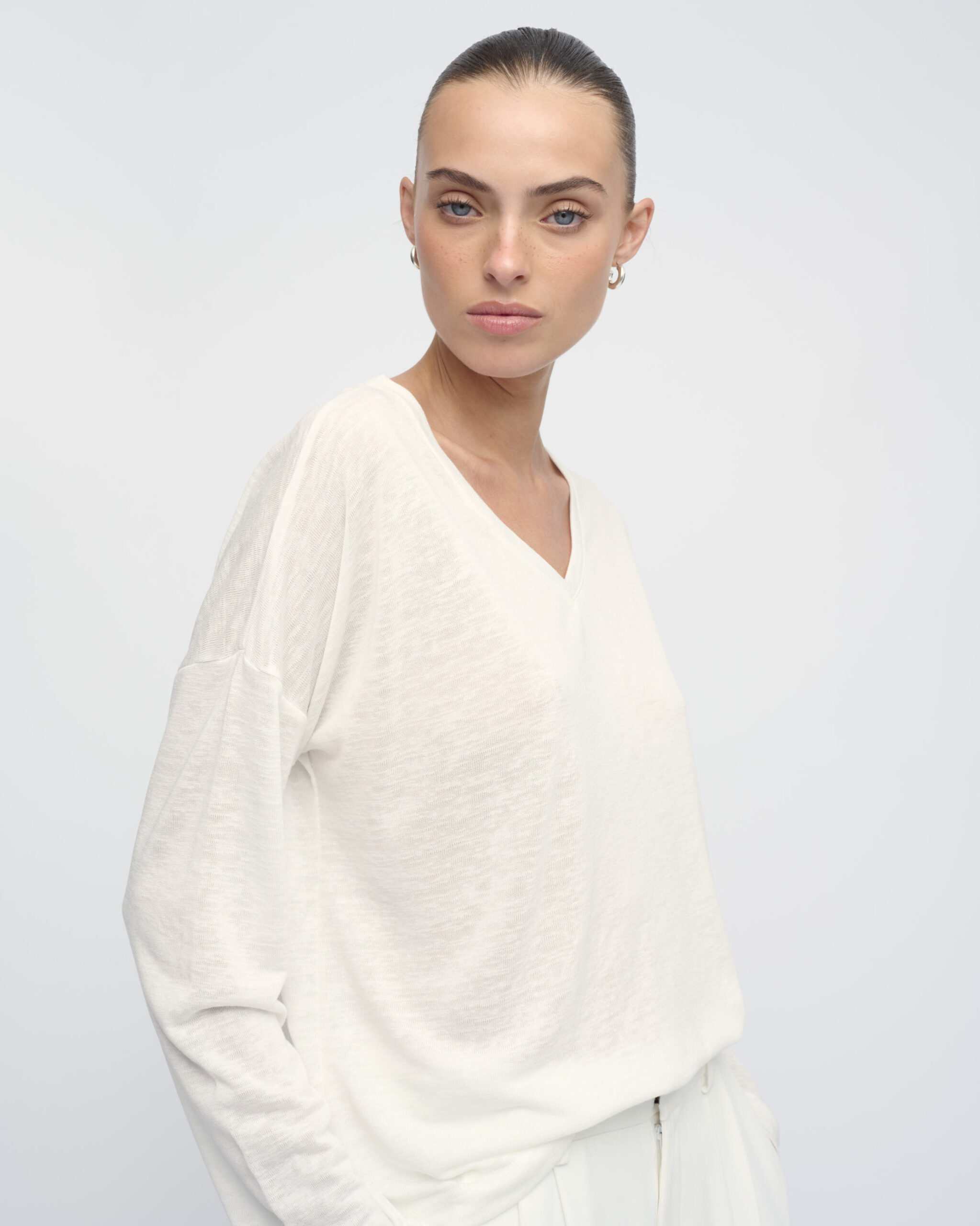חולצת טי בצללית בוקסי רחוקה מהגוף. עם מחשוף וי.