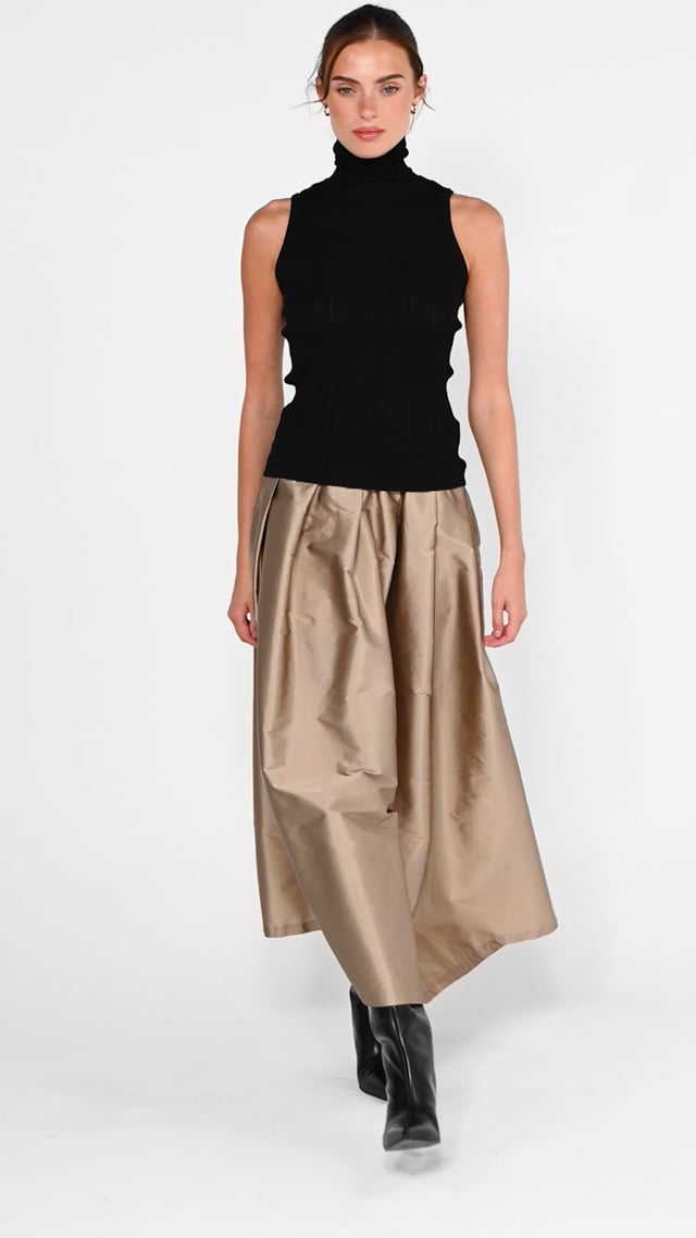 חצאית מאריג טאפט קריספי. צללית טוליפ רחבה, גומי בקו המותן, עם כיסי צד.