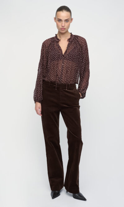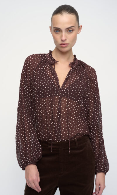 חולצת כפתורים במראה רומנטי, משיפון קרפ בדוגמת נקודות. צללית רחוקה מהגוף. צוארון אסוף עם וולן מכווץ. שרוולים עם חפת וולן. סגירת כפתורים בחזית.
