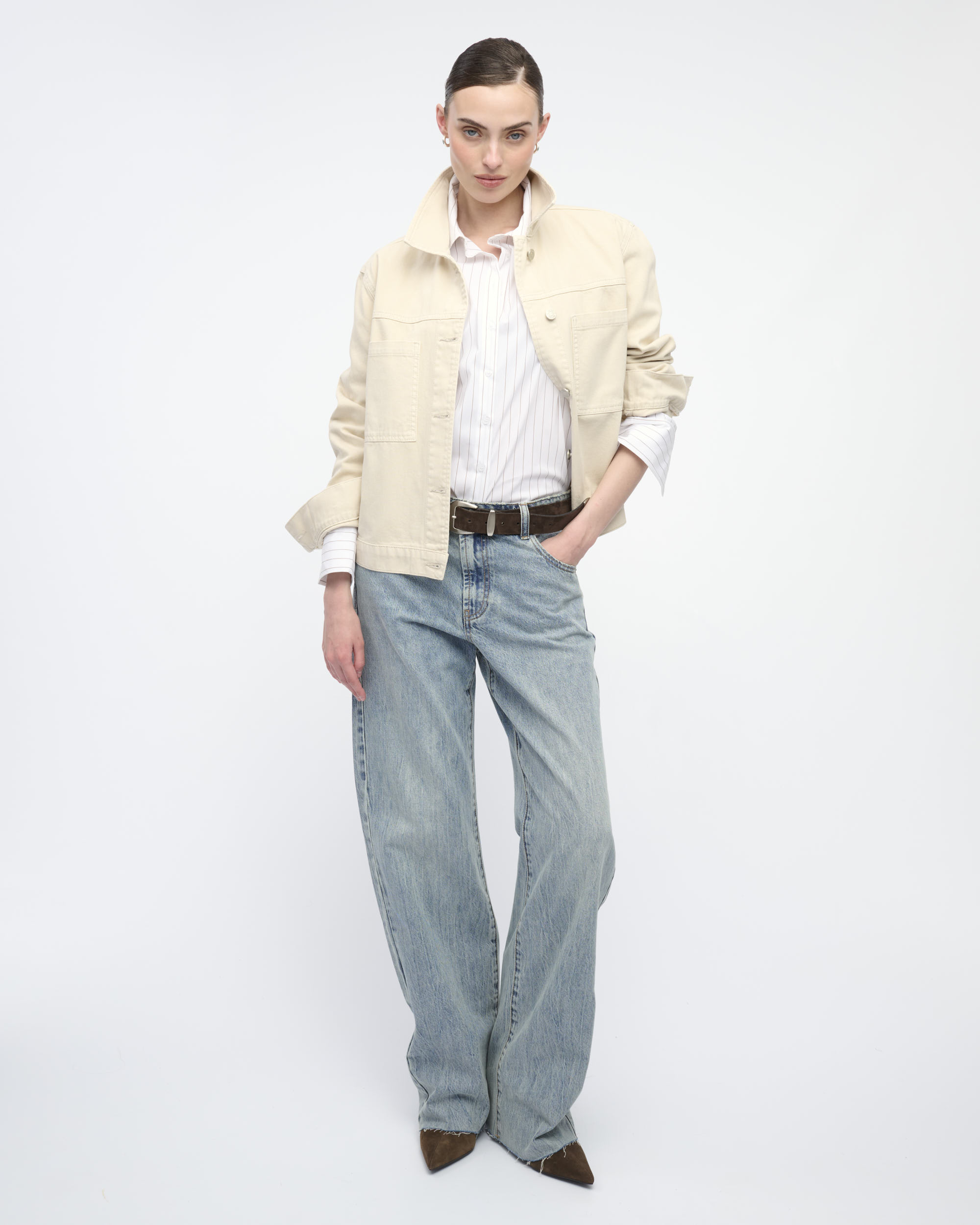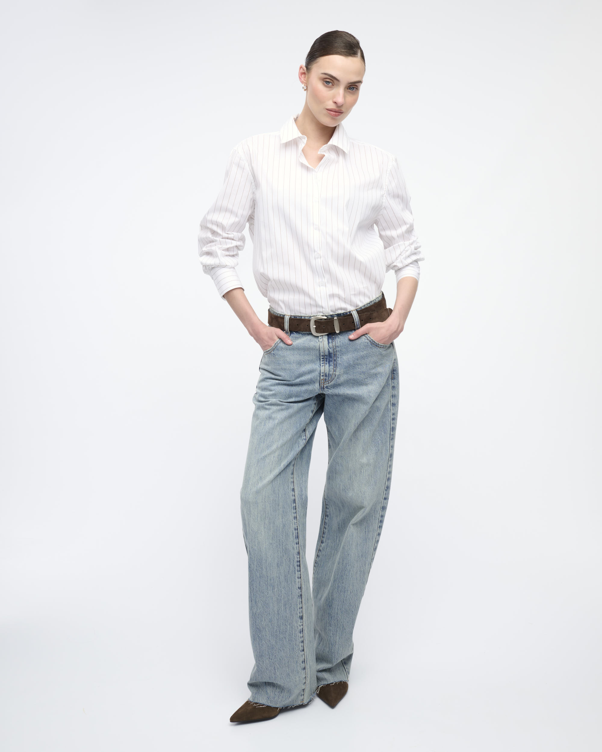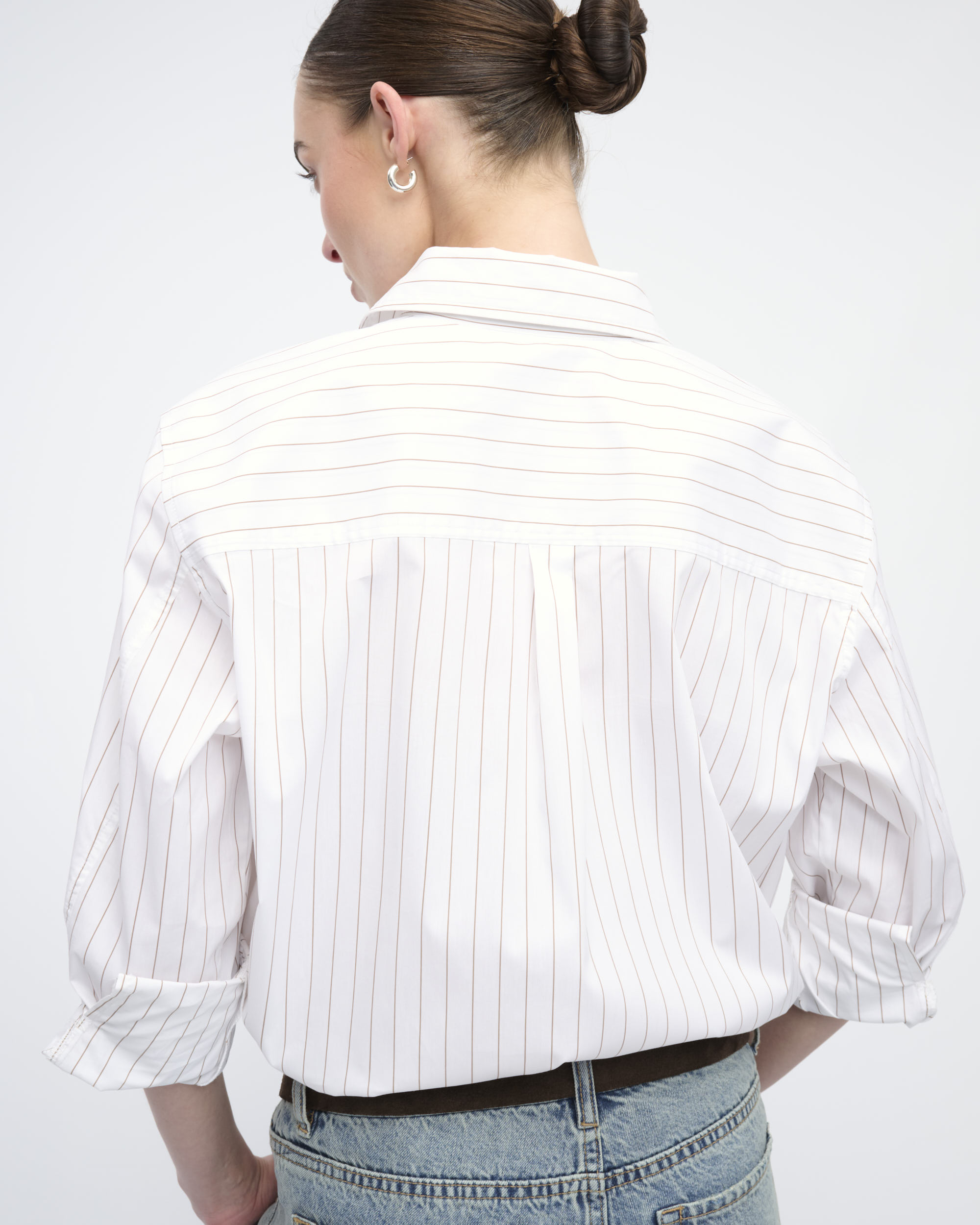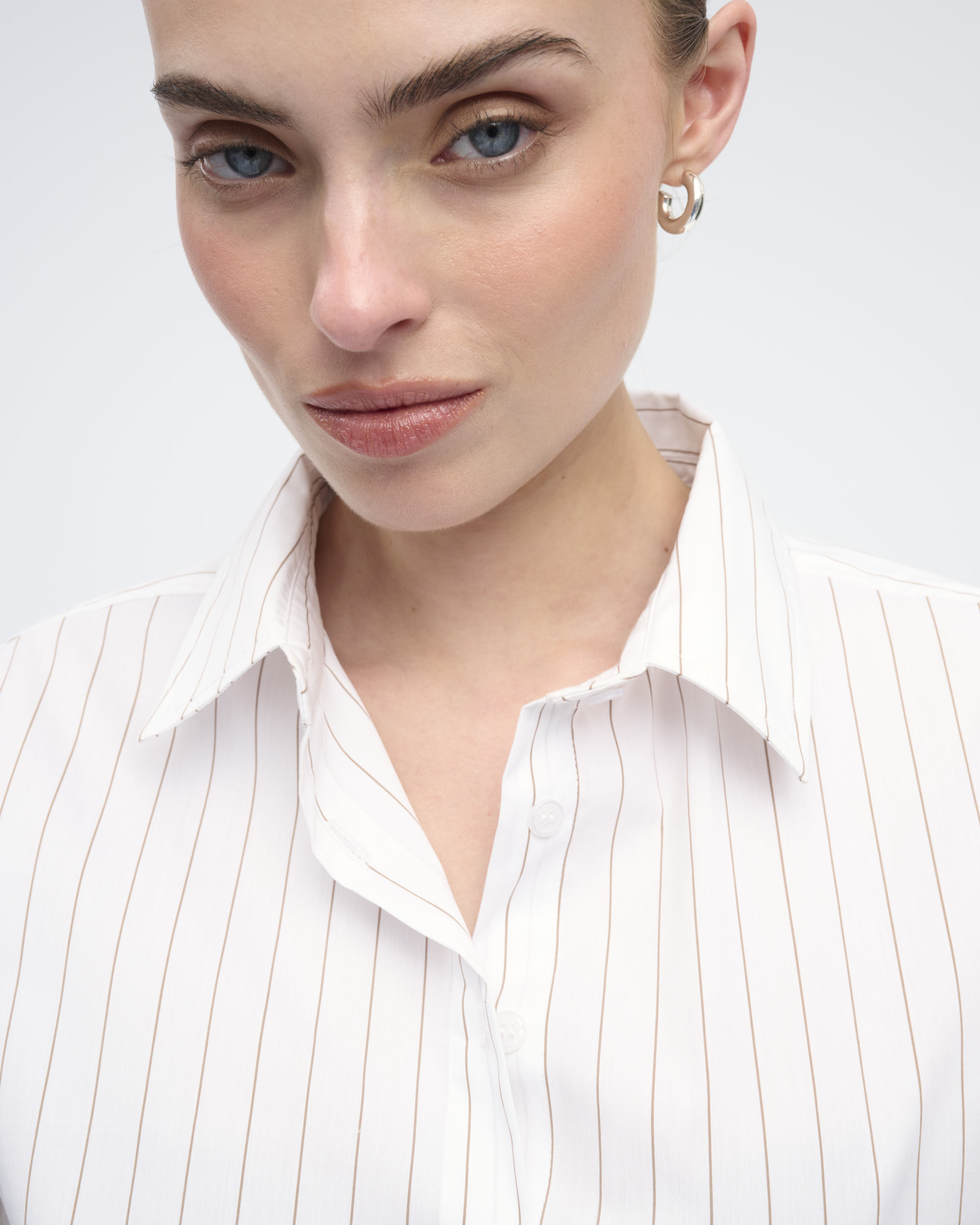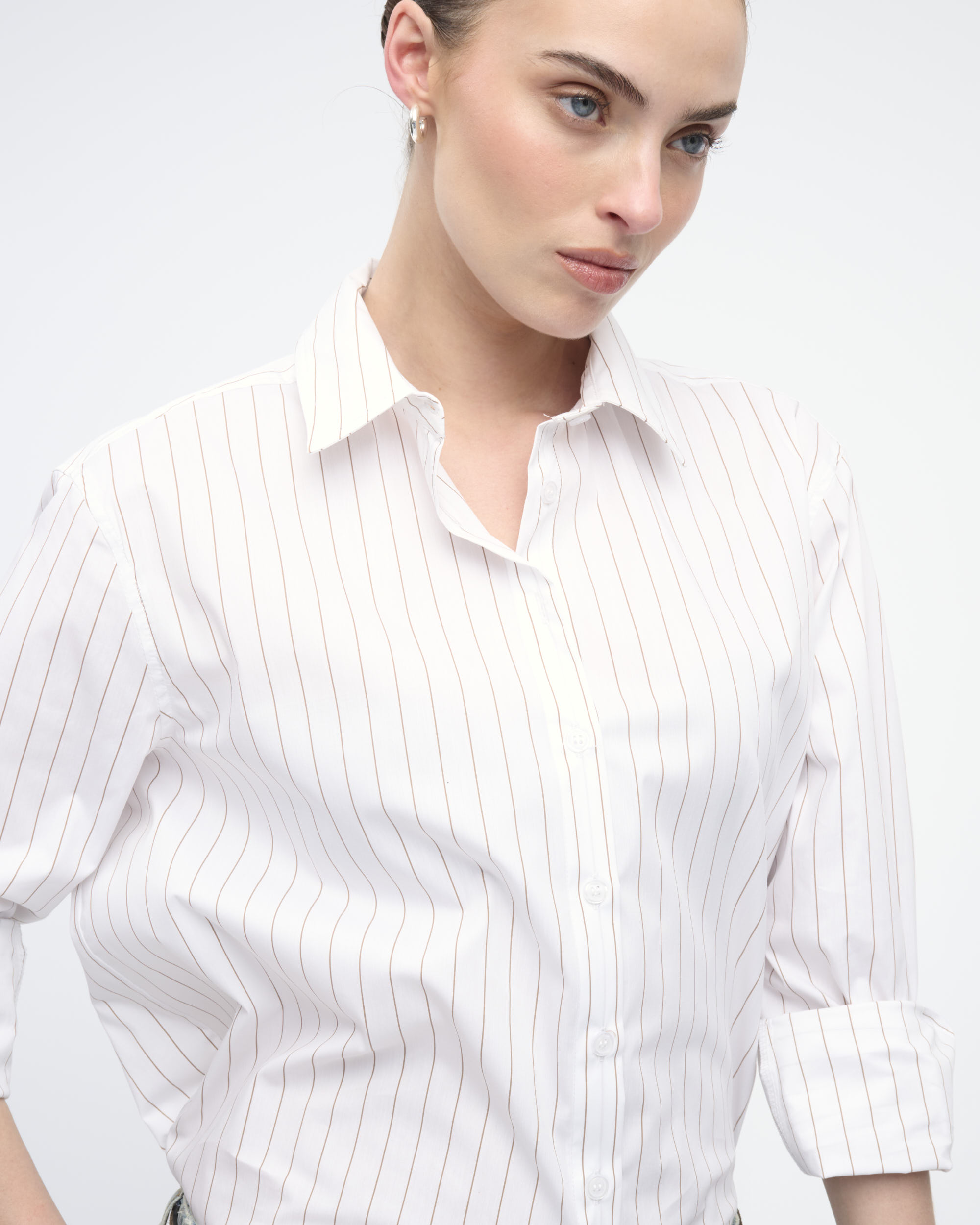 חולצת כפתורים מכותנה סטרץ’ בדוגמת פסי סיכה. צללית רחוקה מהגוף.