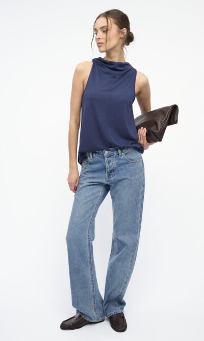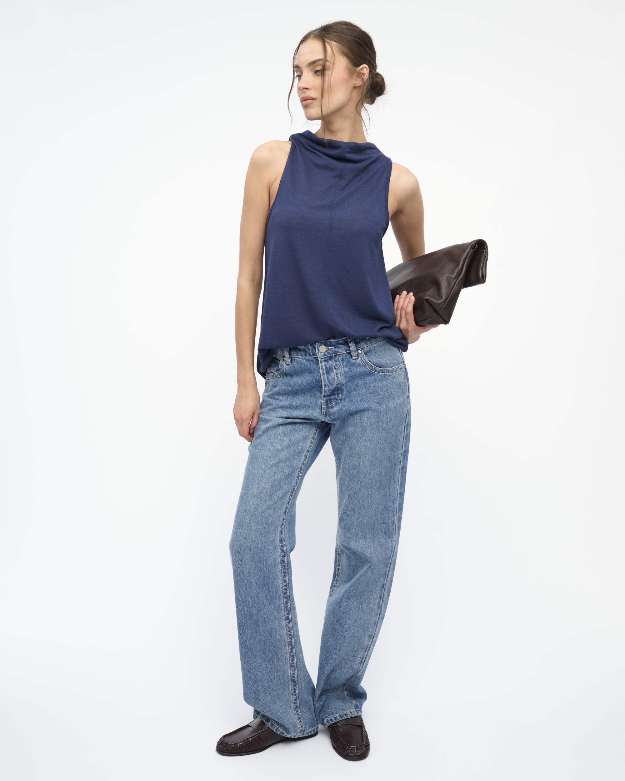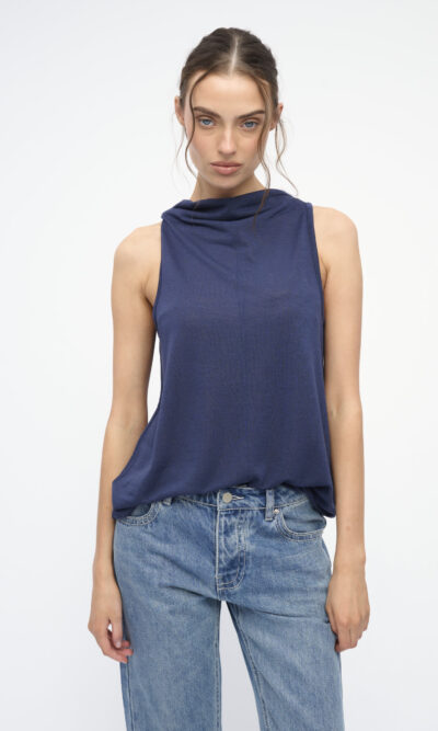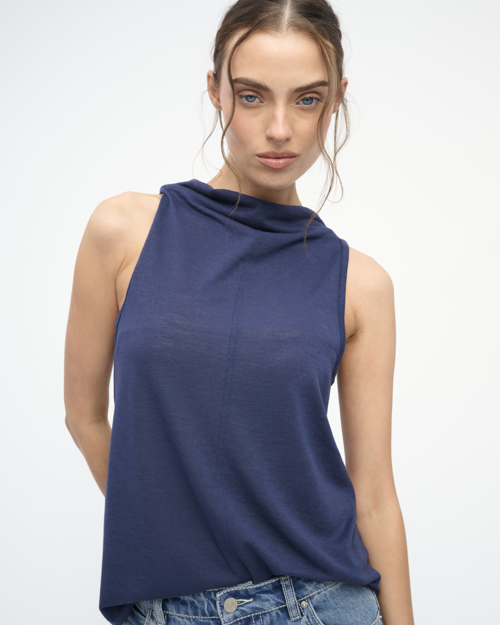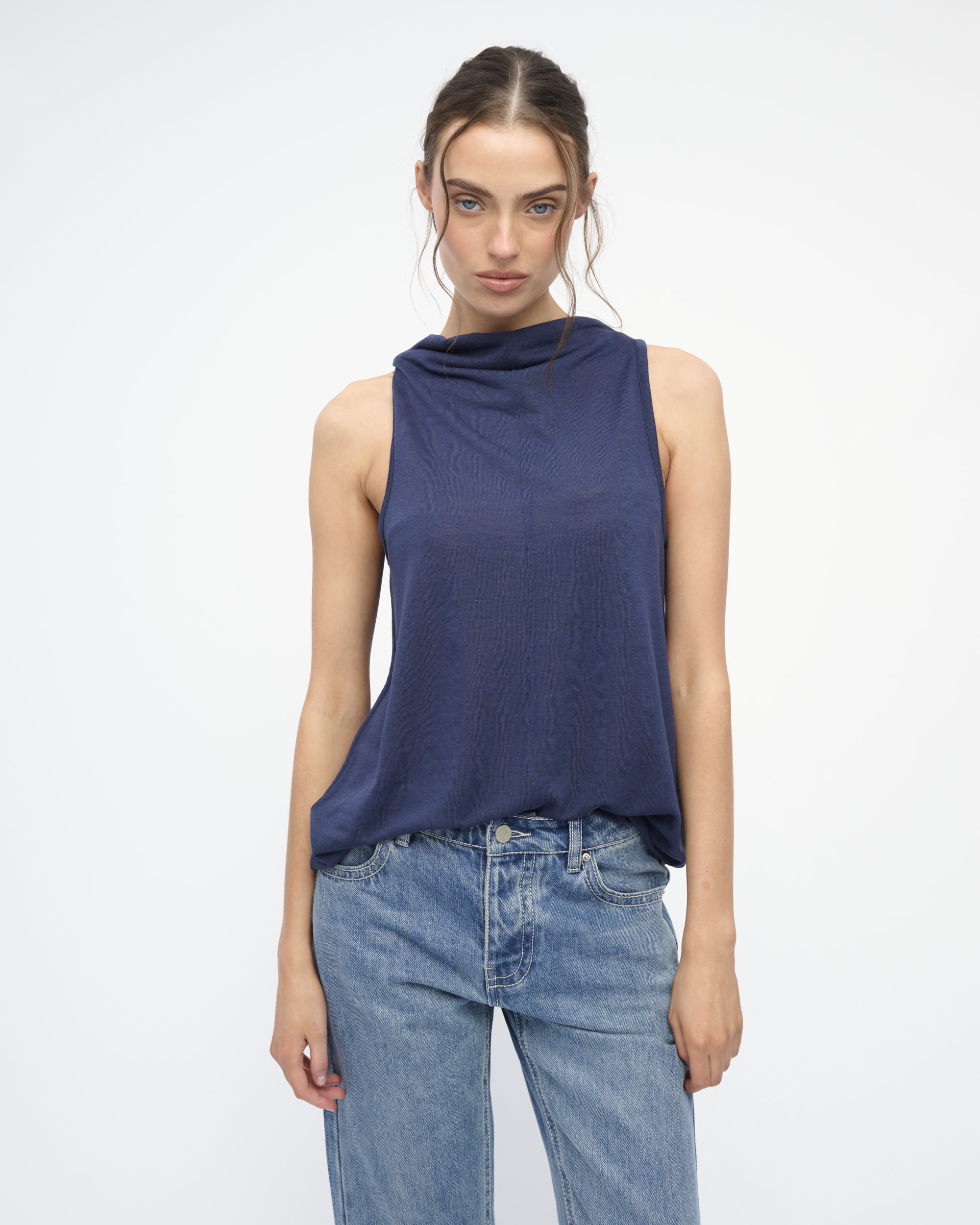 טופ מסריג ויסקוזה, צללית נינוחה, ללא שרוולים, צוארון גבוה.
