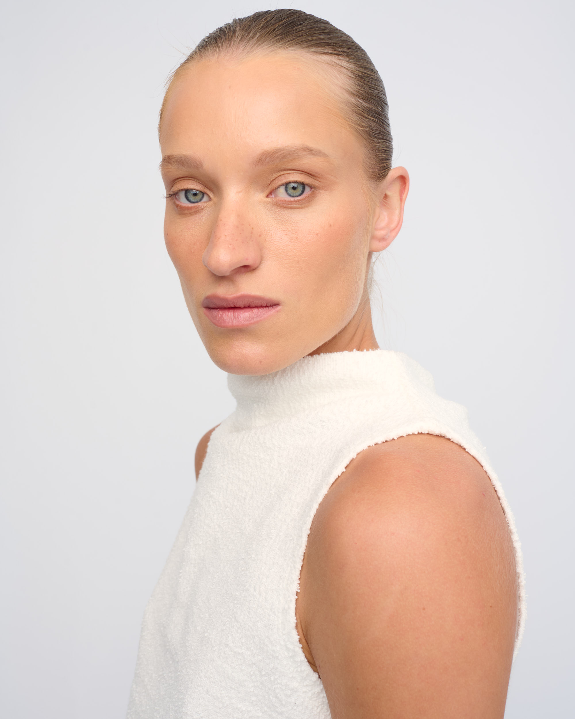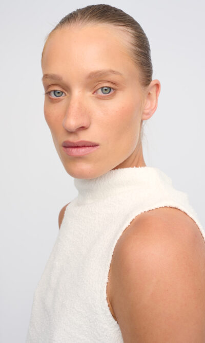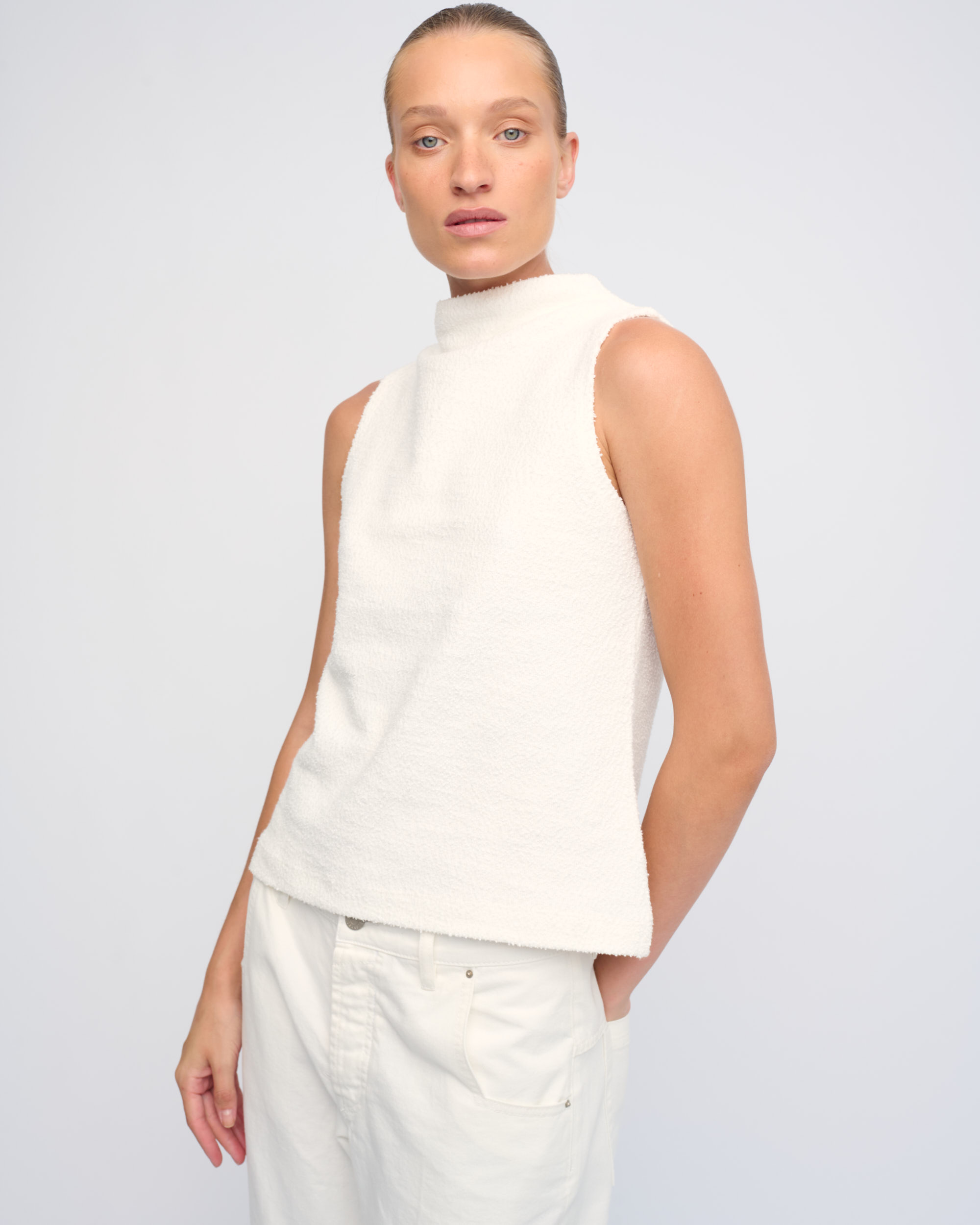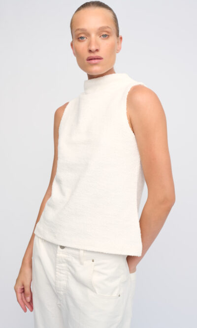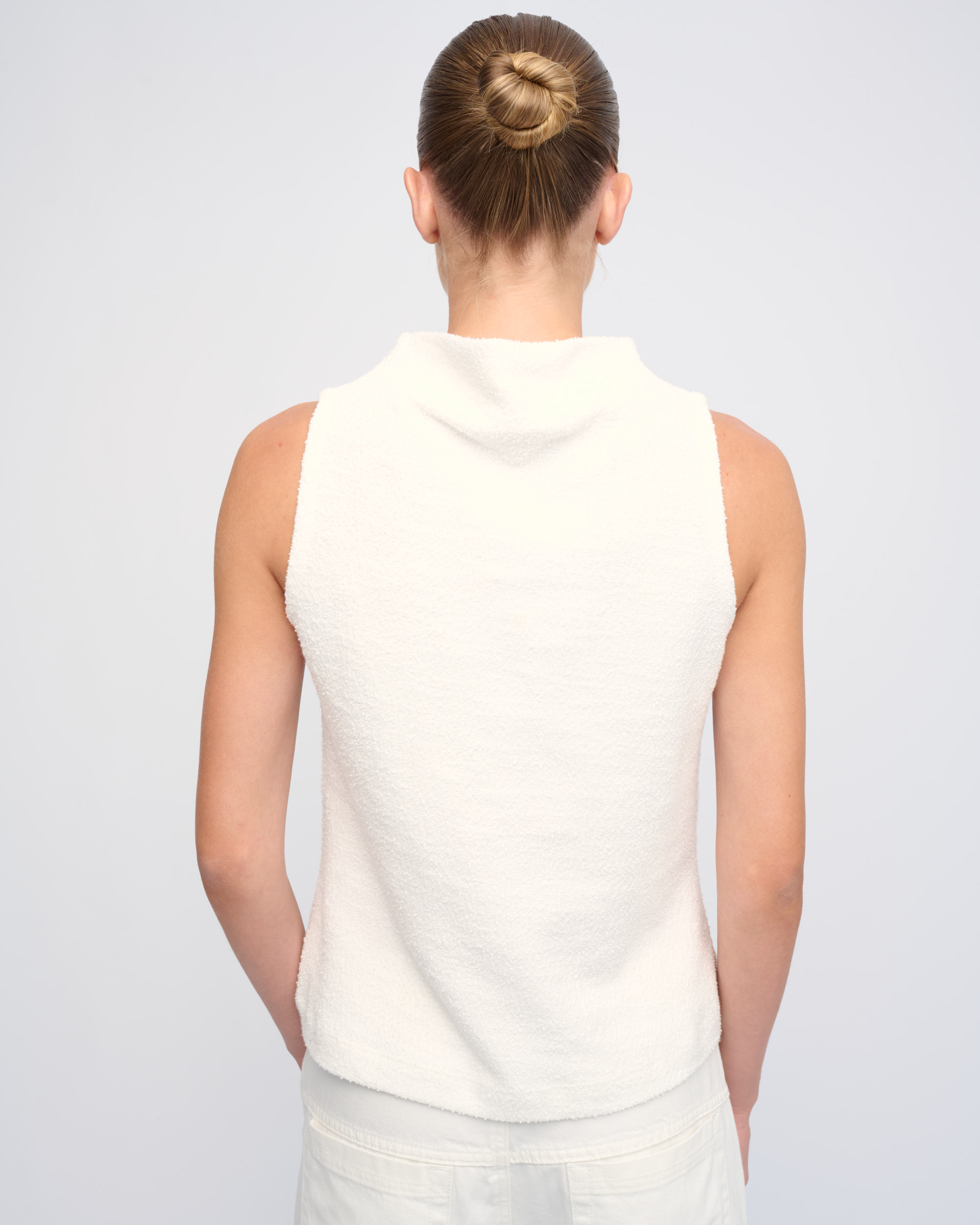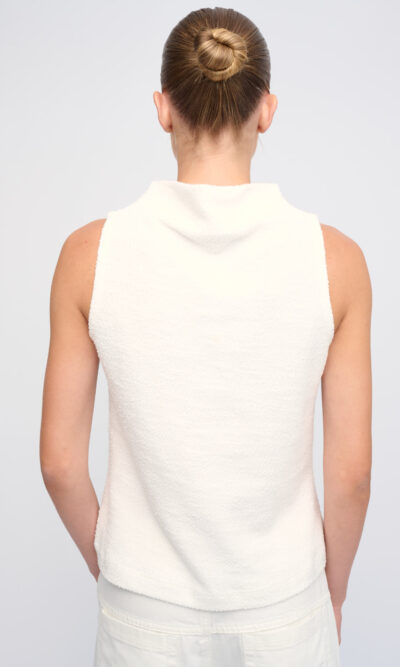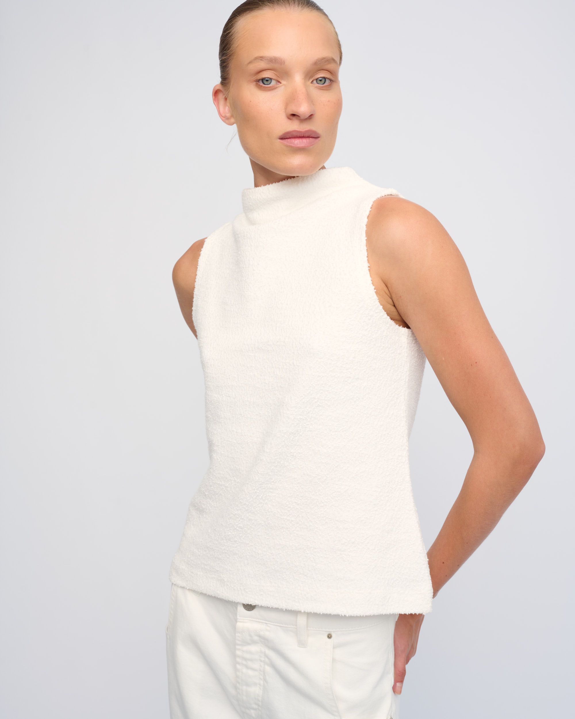 חולצה מסריג בסריגת בוקלה, ללא שרוולים, צוארון גבוה, צללית קרובה לגוף.