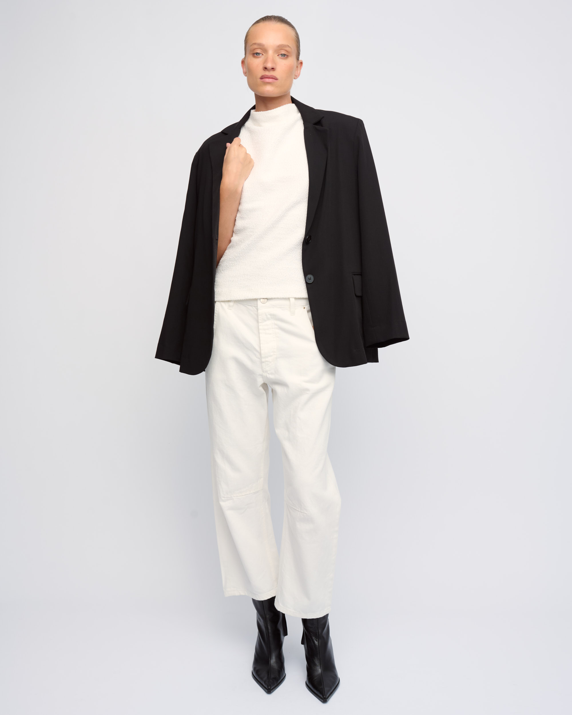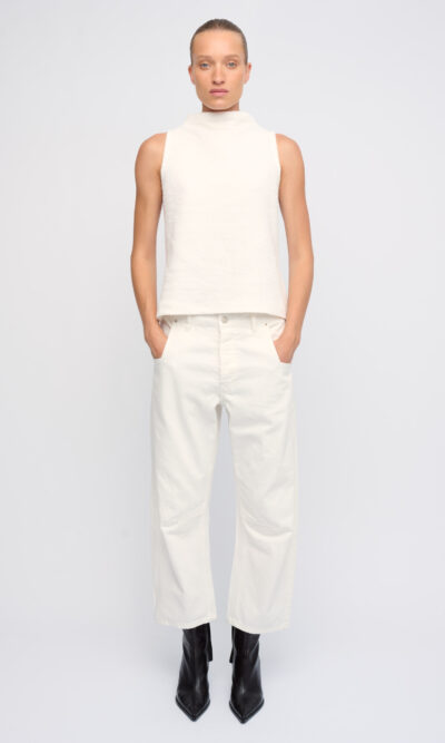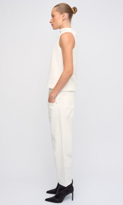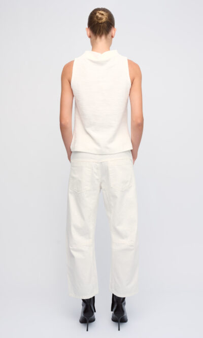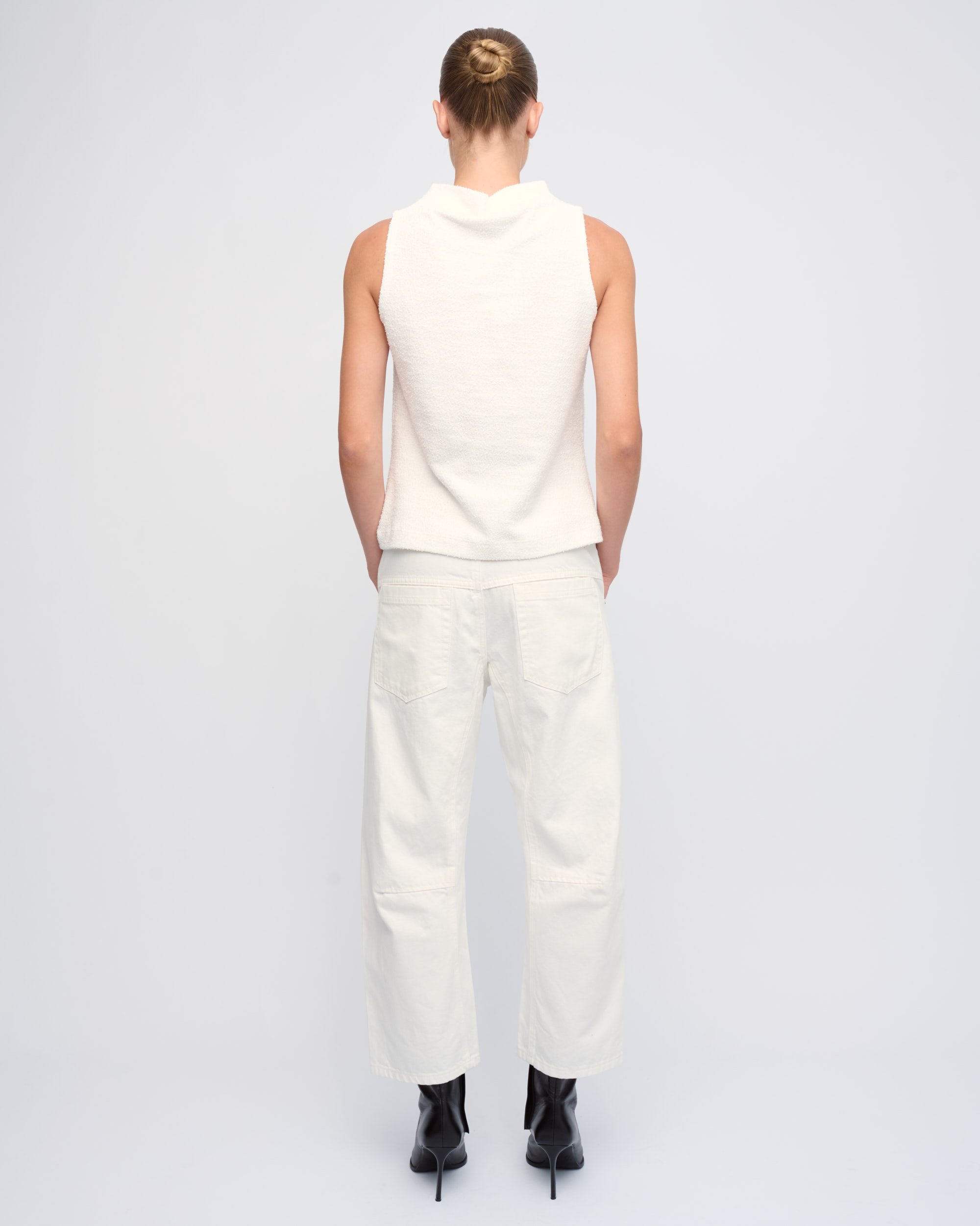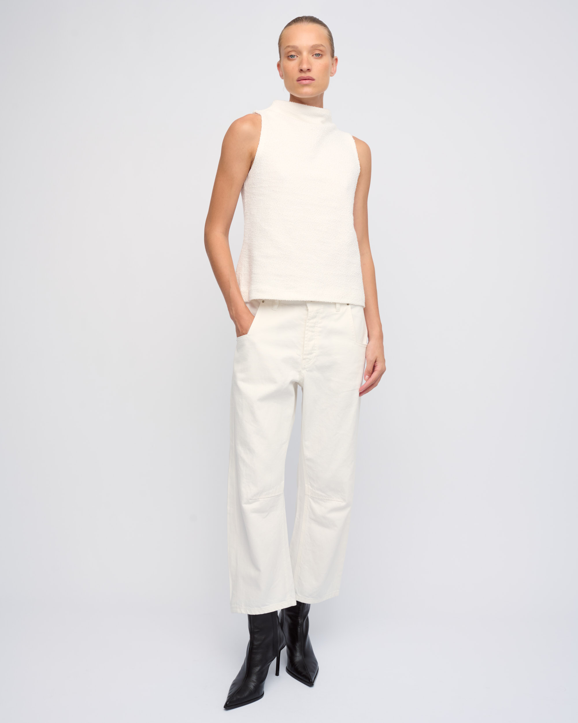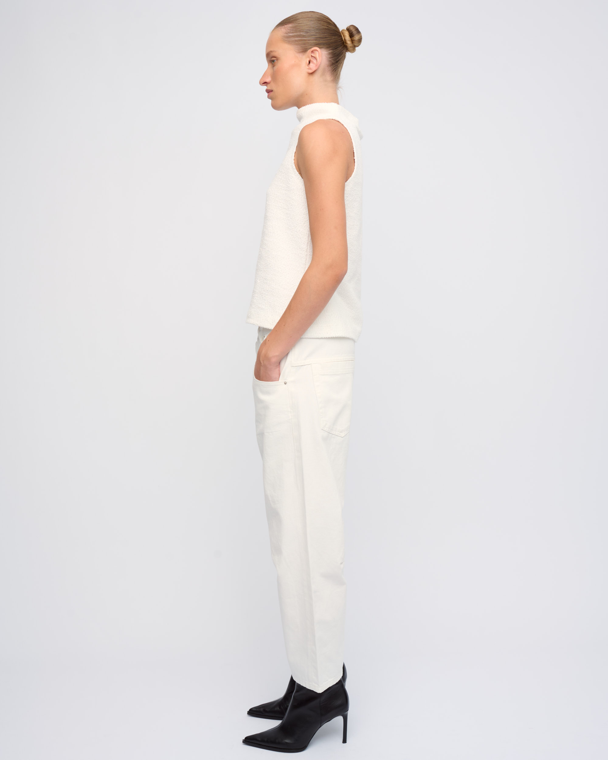 חולצה מסריג בסריגת בוקלה, ללא שרוולים, צוארון גבוה, צללית קרובה לגוף.