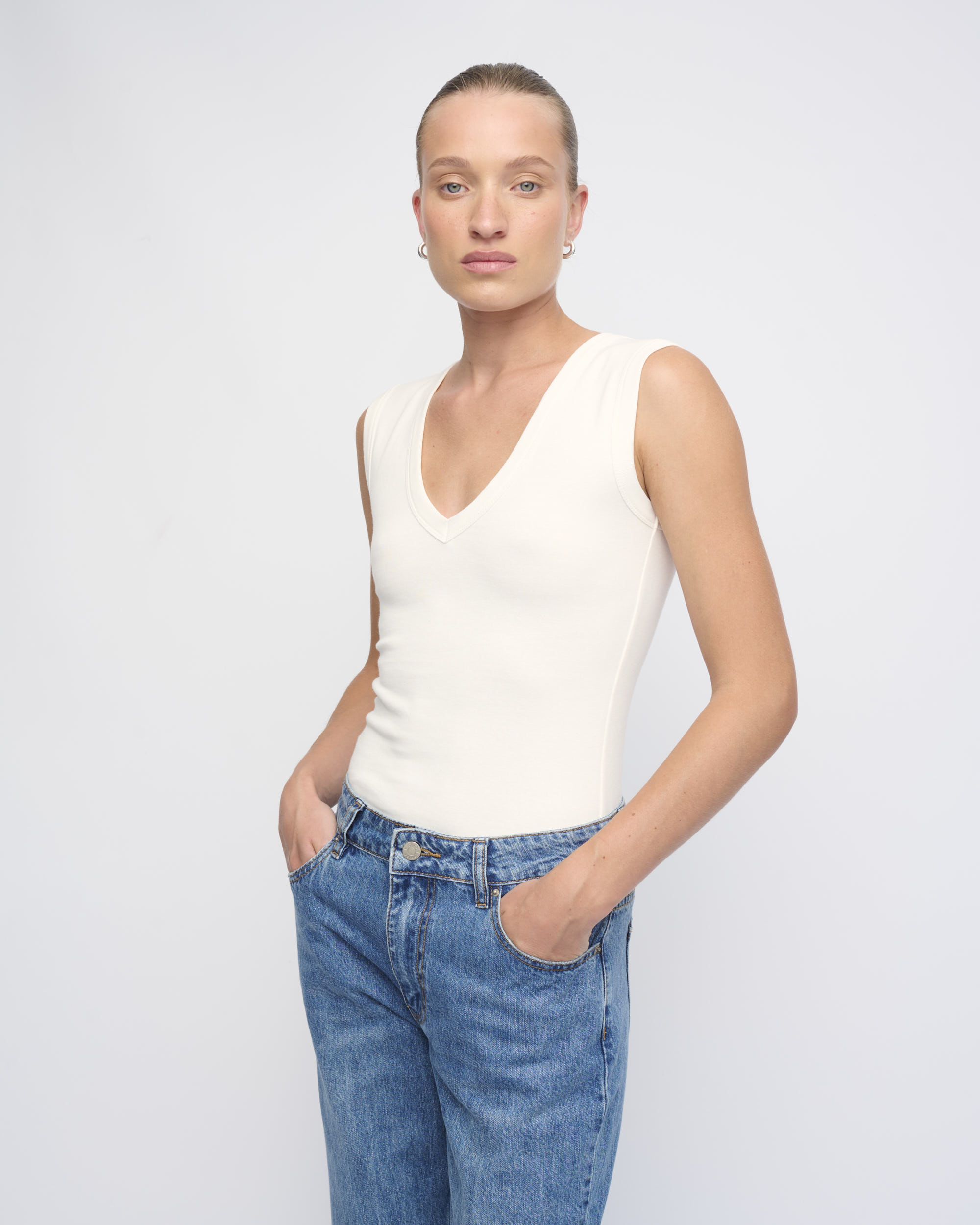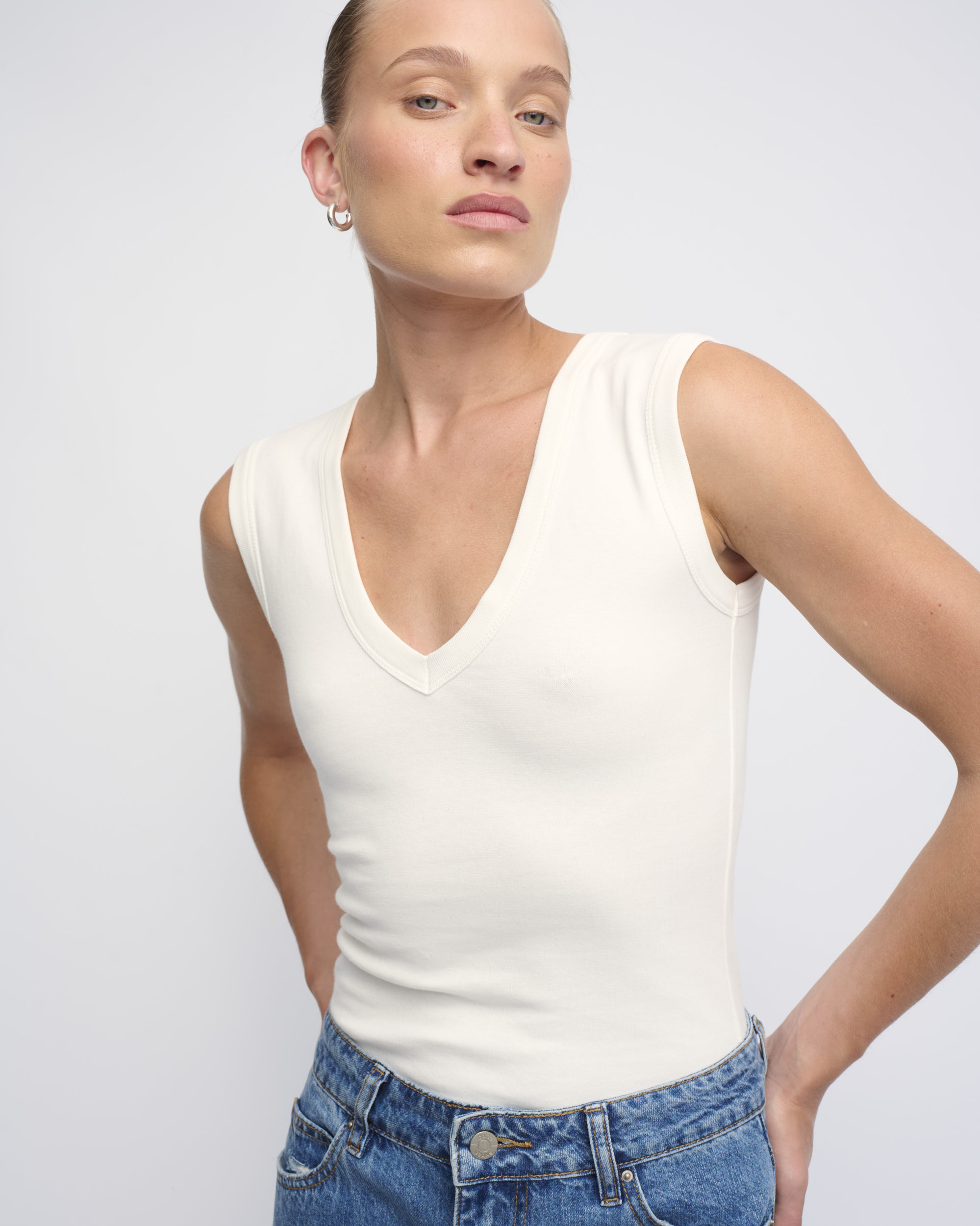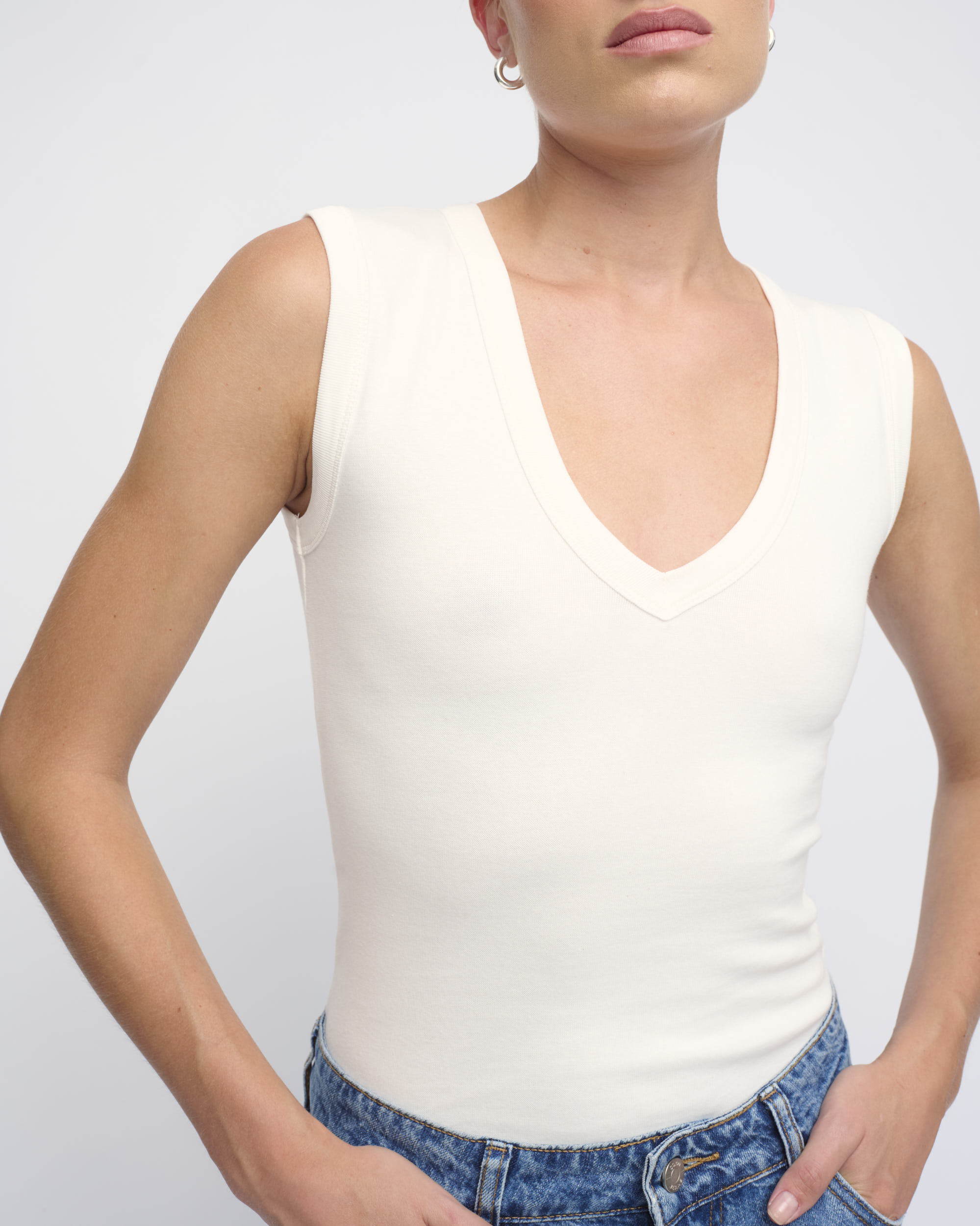 טופ סריג כותנה ליקרה, צללית צמודה. ללא שרוולים, מחשוף וי.