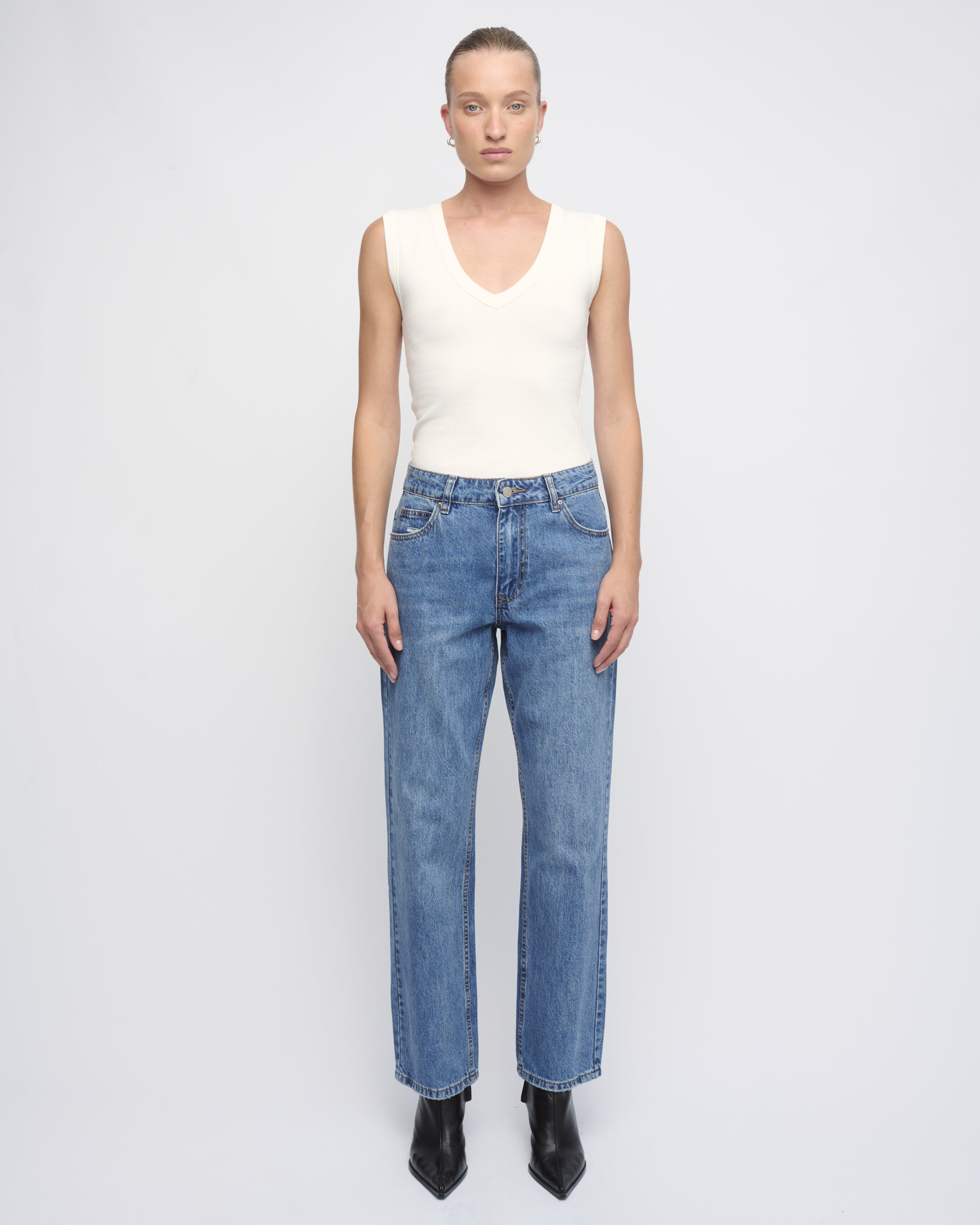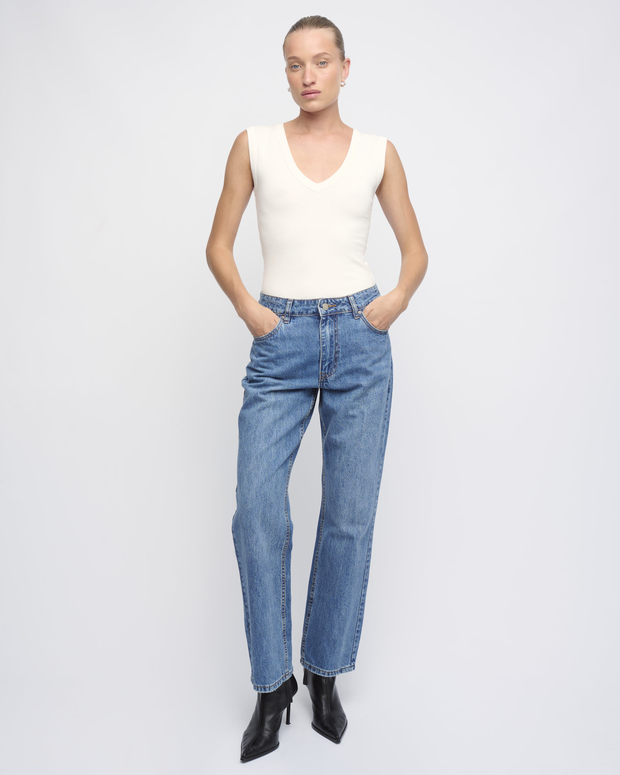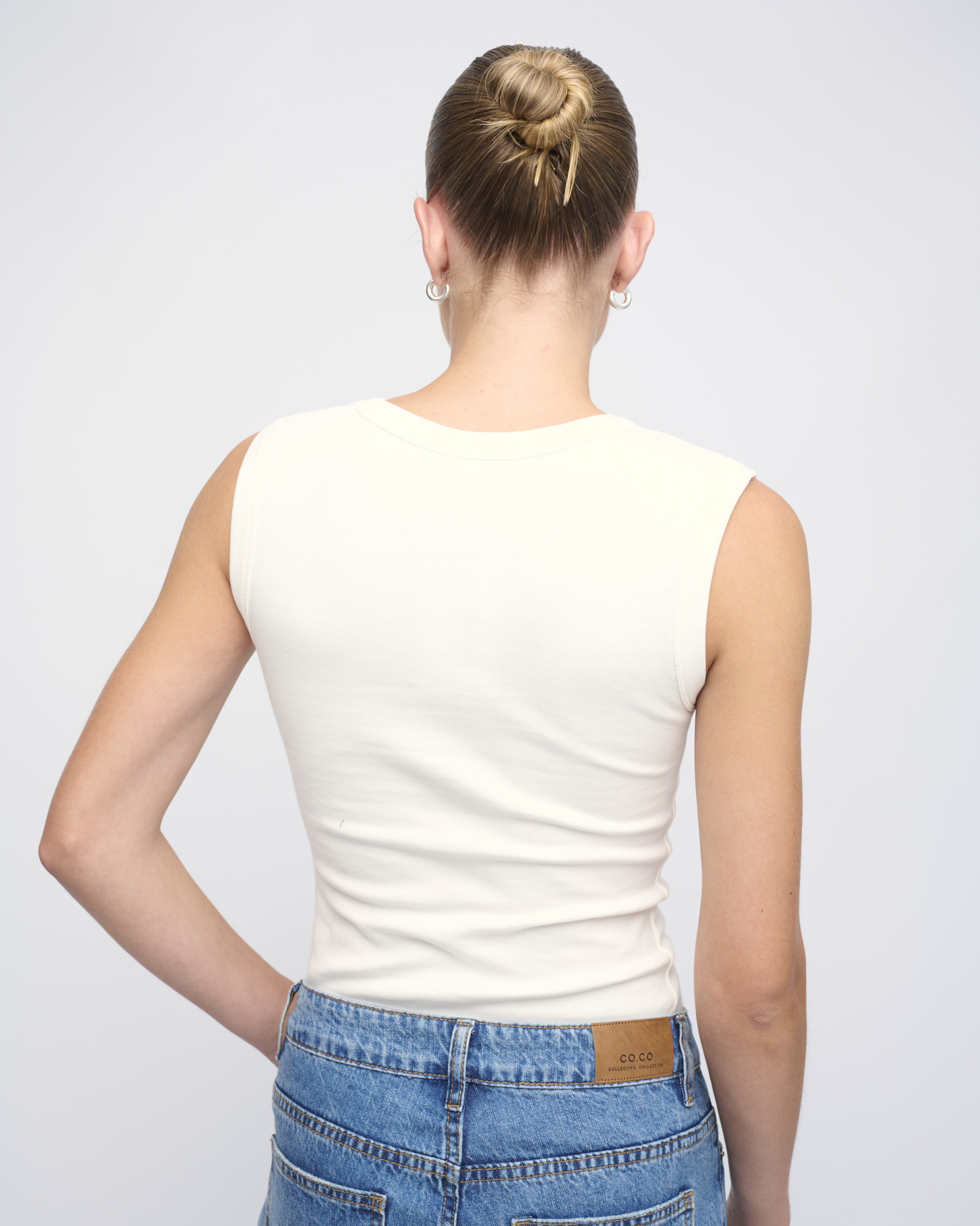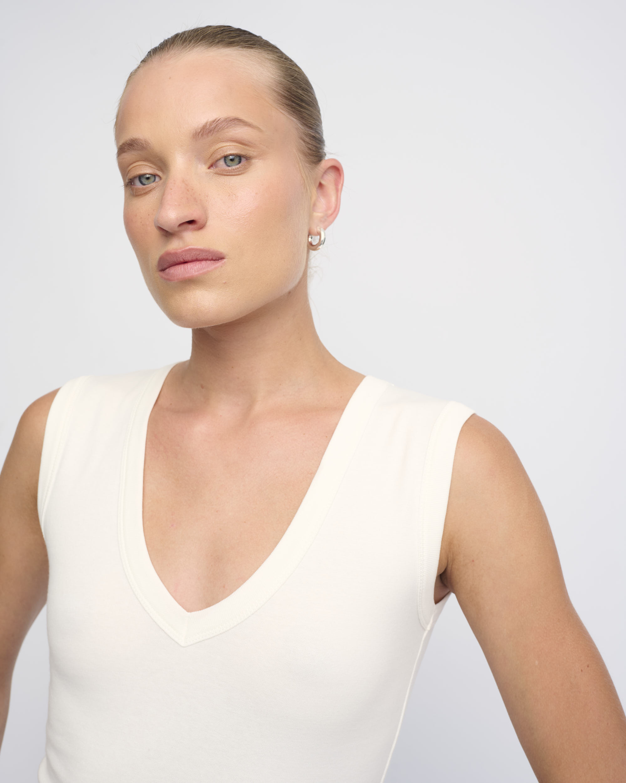 טופ סריג כותנה ליקרה, צללית צמודה. ללא שרוולים, מחשוף וי.