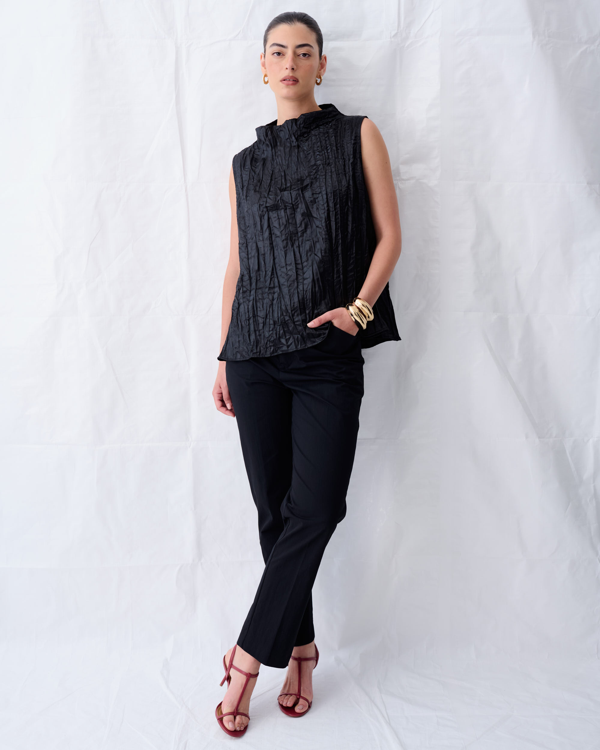 טופ מסאטן בטקסטורת קימוט.צללית A נינוחה. צוארון גבוה.