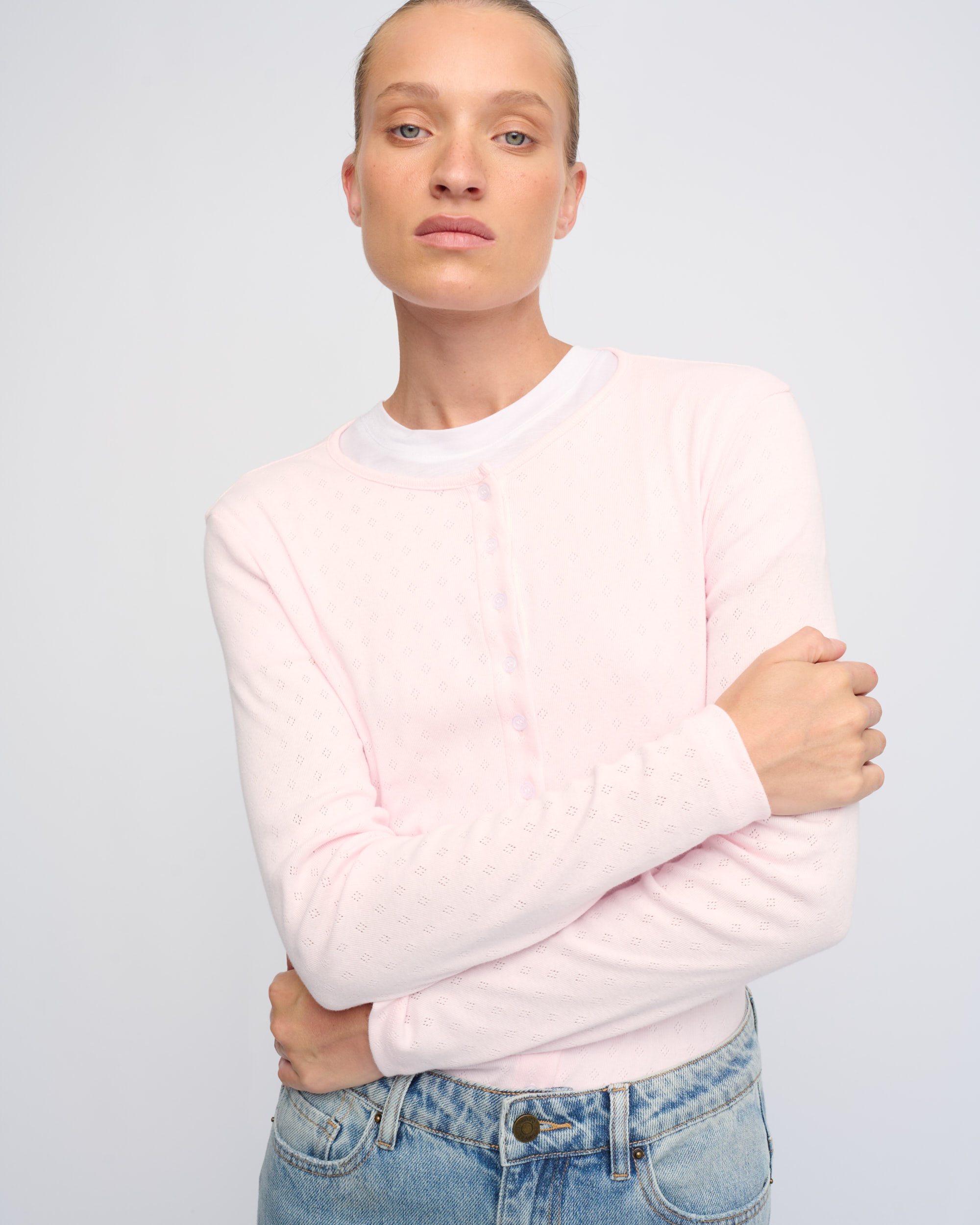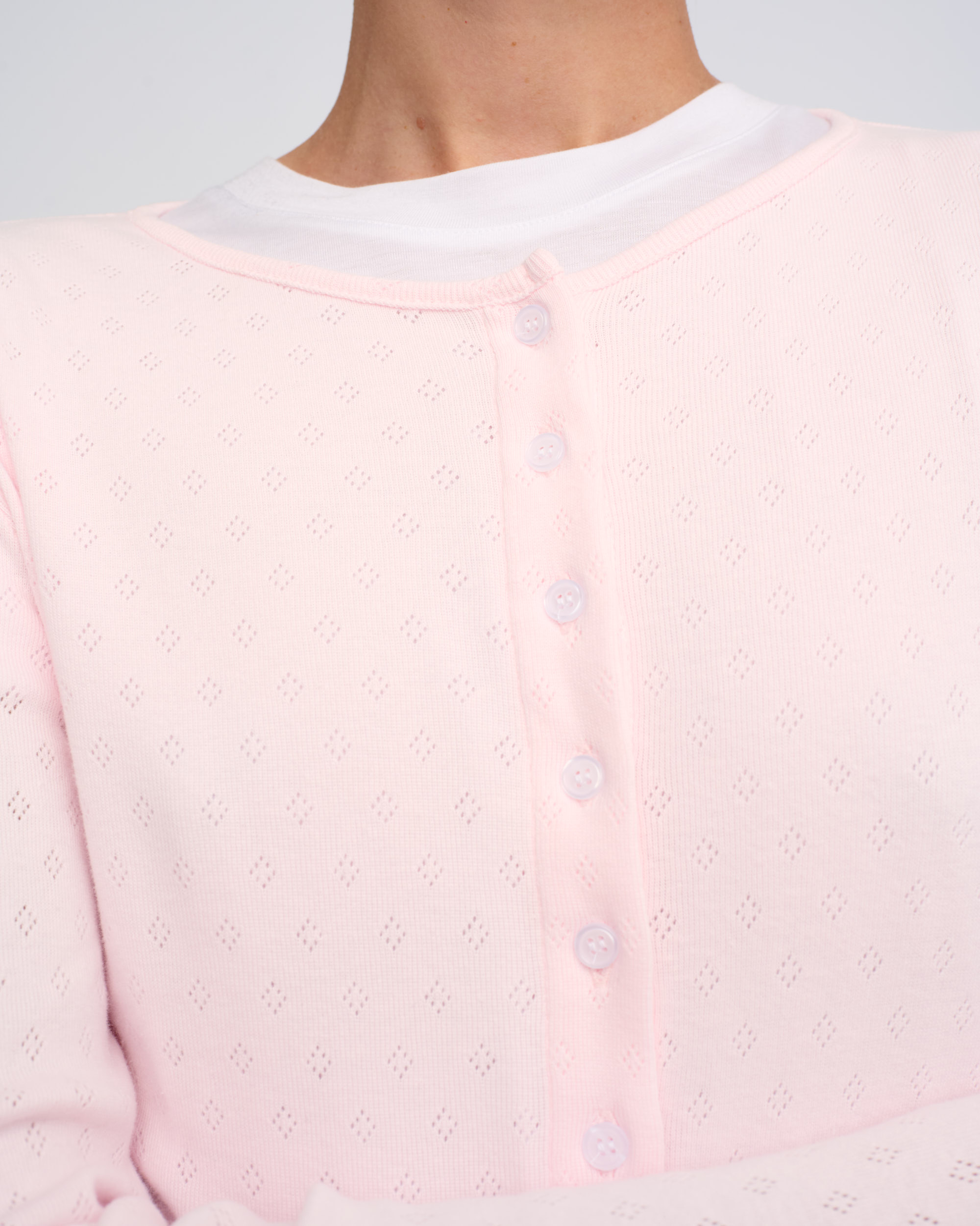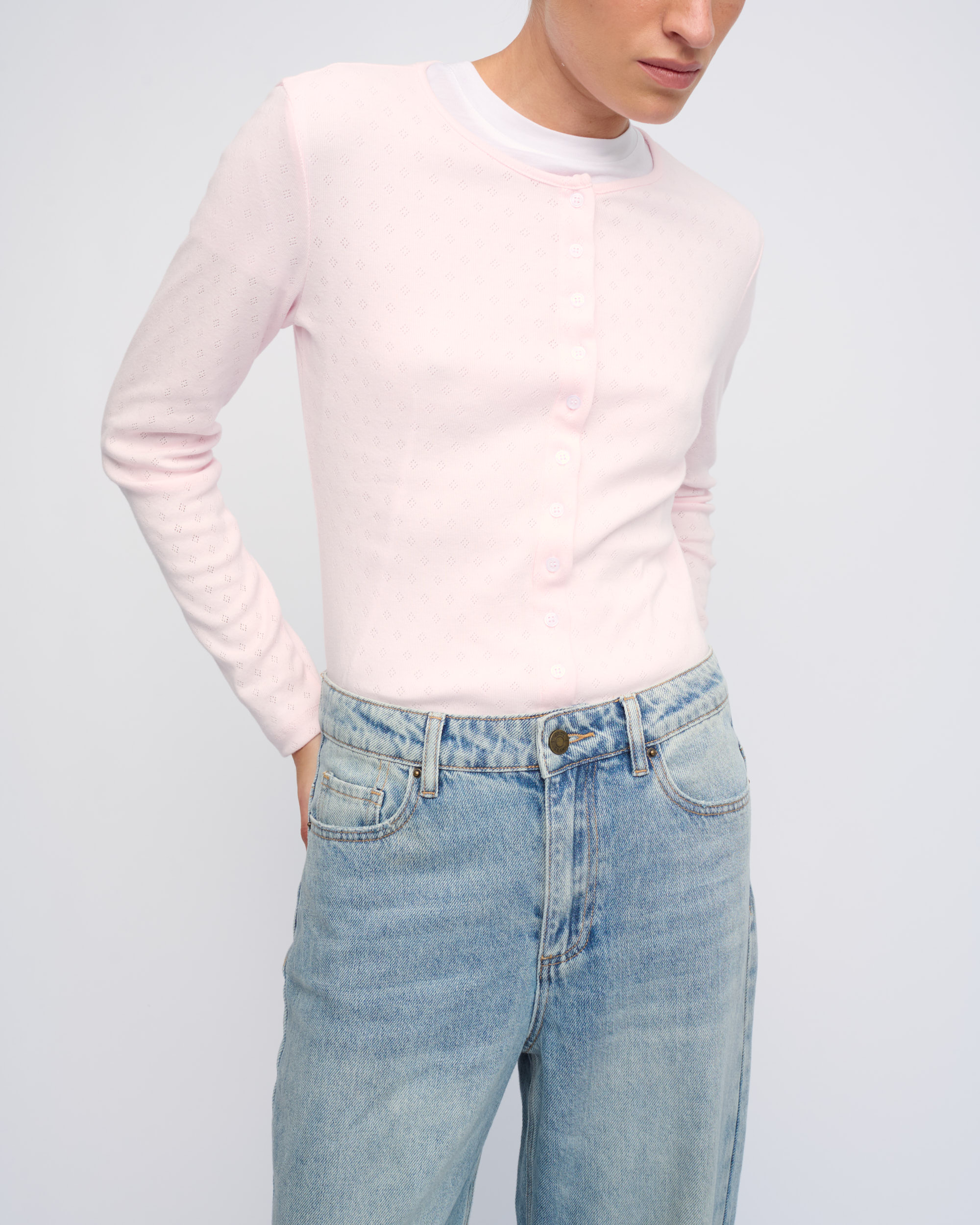 חולצה מכותנה בסריגת פוינטל, צללית צמודה. מחשוף עגול, סגירת כפתורים בחזית.