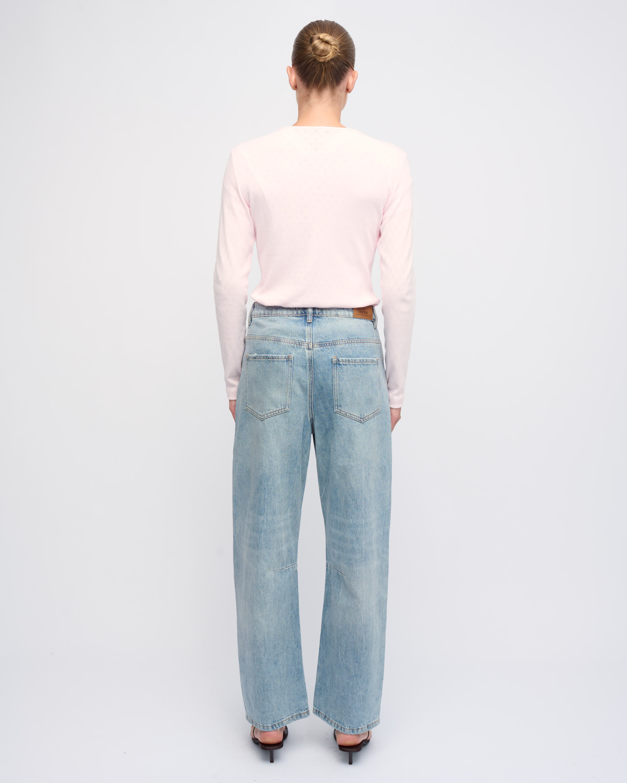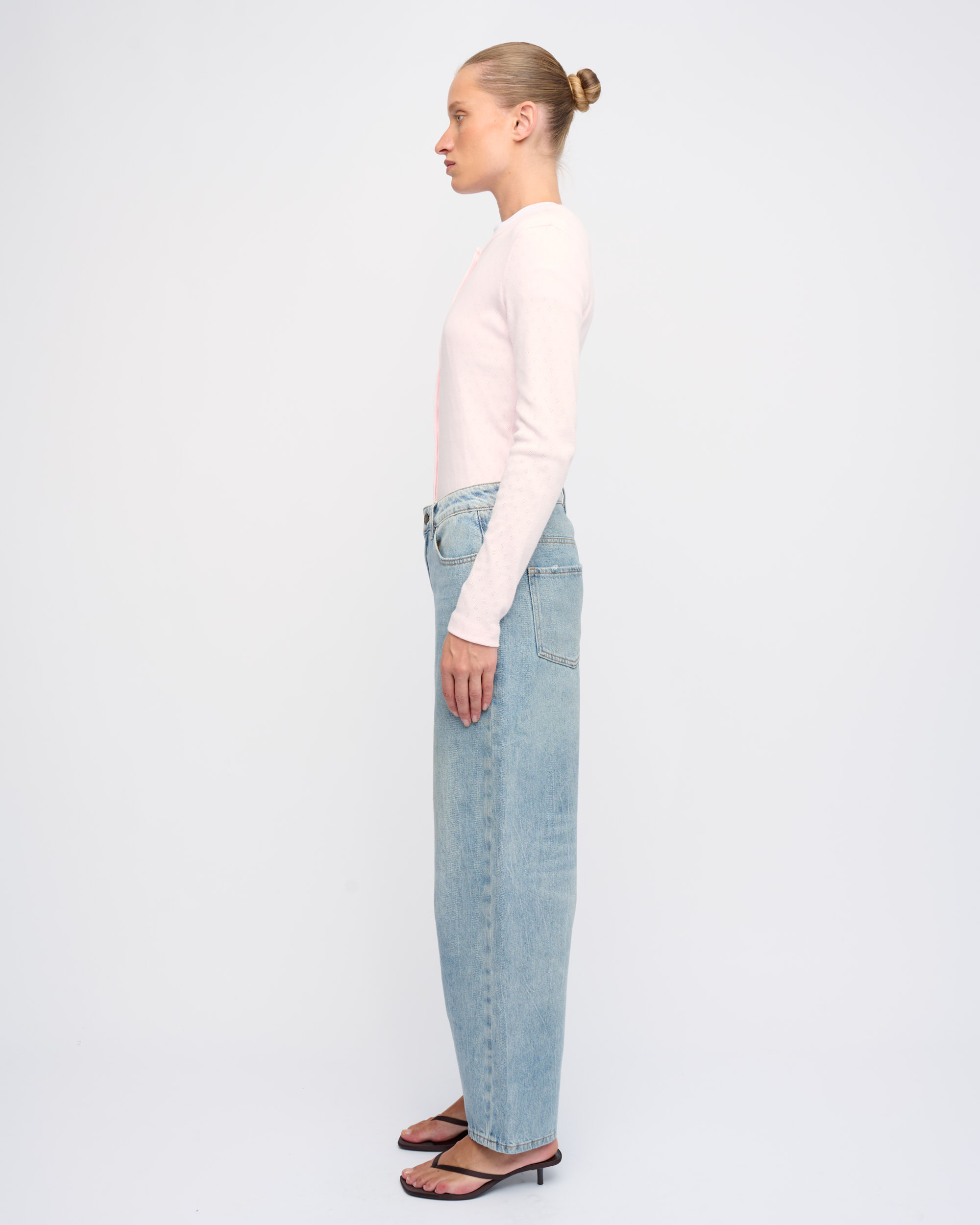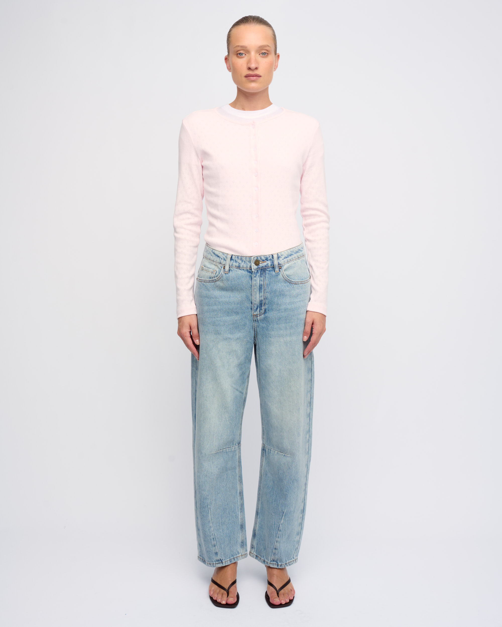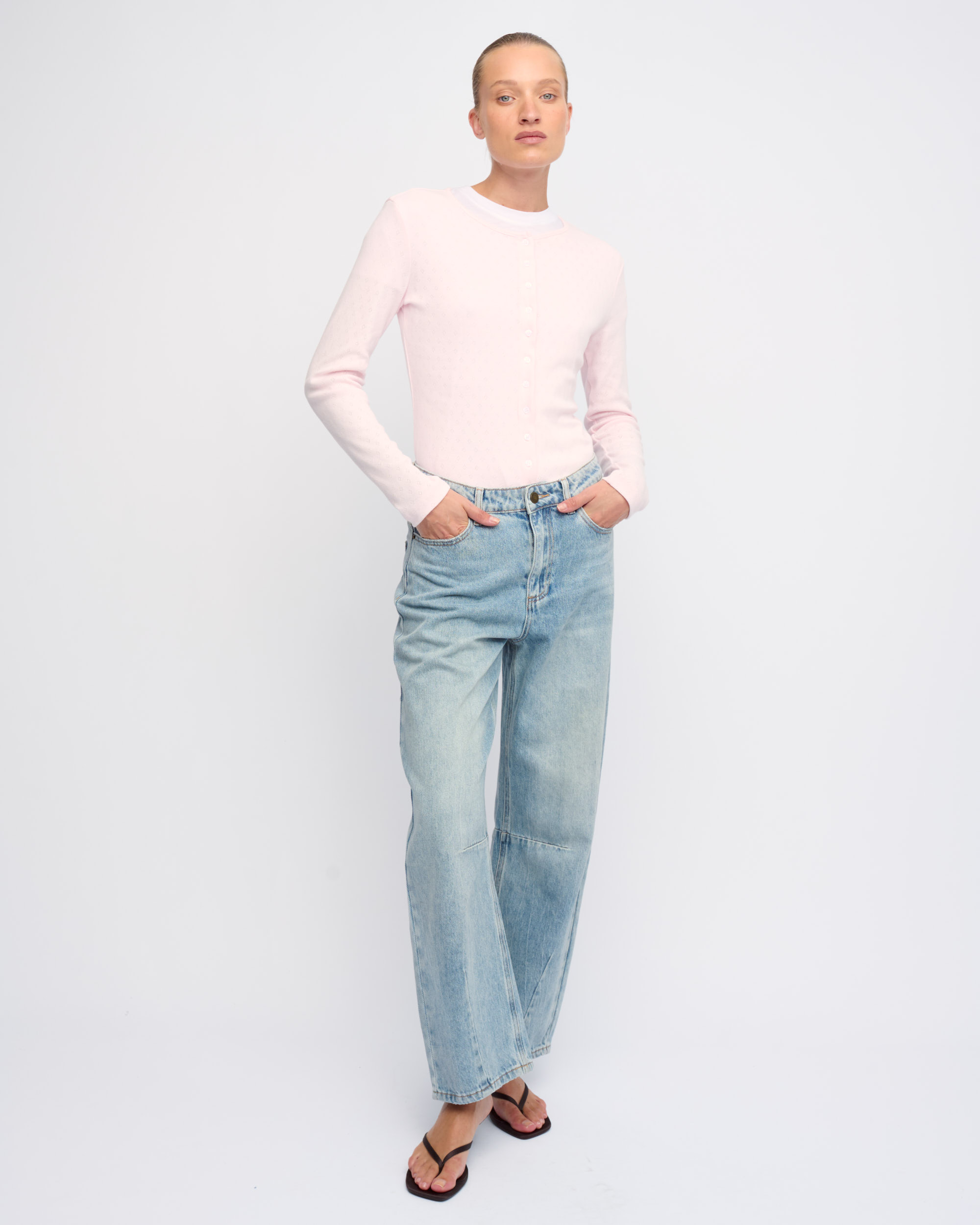 חולצה מכותנה בסריגת פוינטל, צללית צמודה. מחשוף עגול, סגירת כפתורים בחזית.