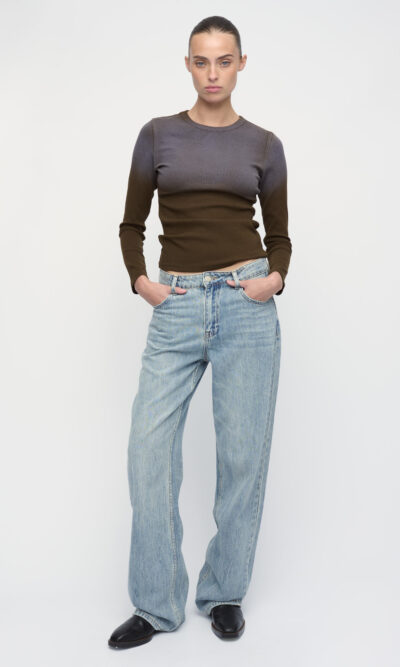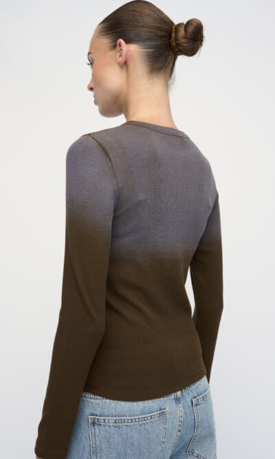 חולצת טי מסריג ריב בשטיפת וינטג’. שרוול ארוך, מחשוף מעוגל.