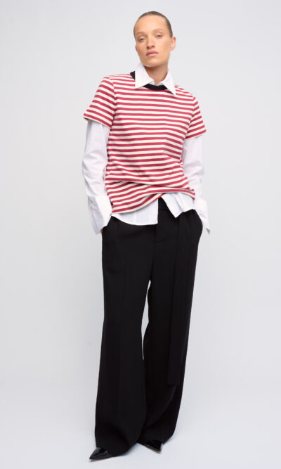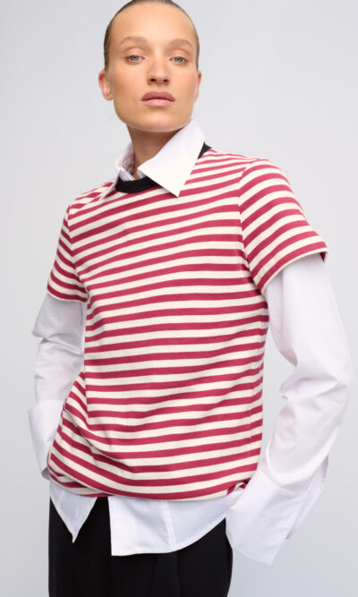 חולצת טי מכותנה פסים, צללית קרובה לגוף, מחשוף עגול עם גימור קונטרסטי.