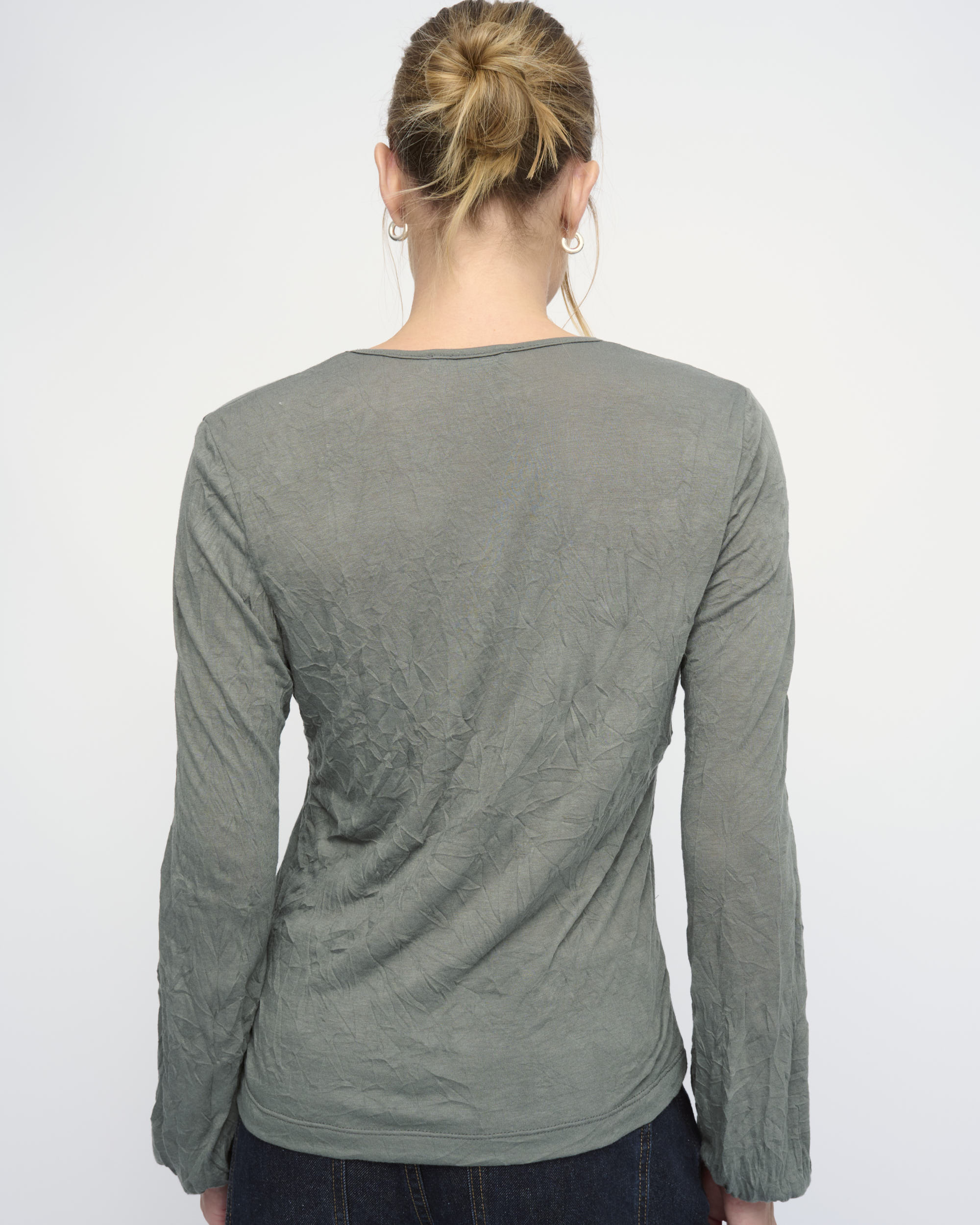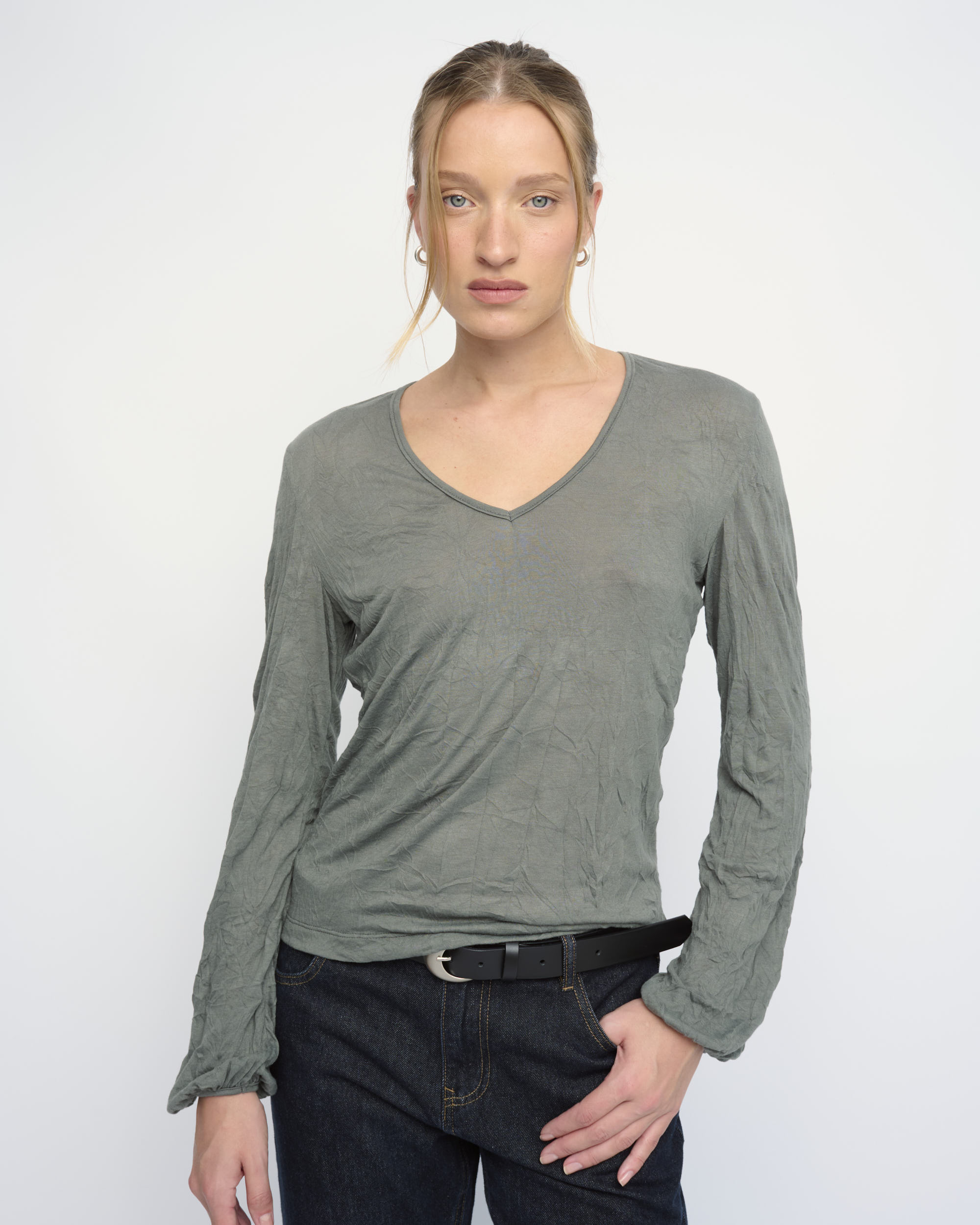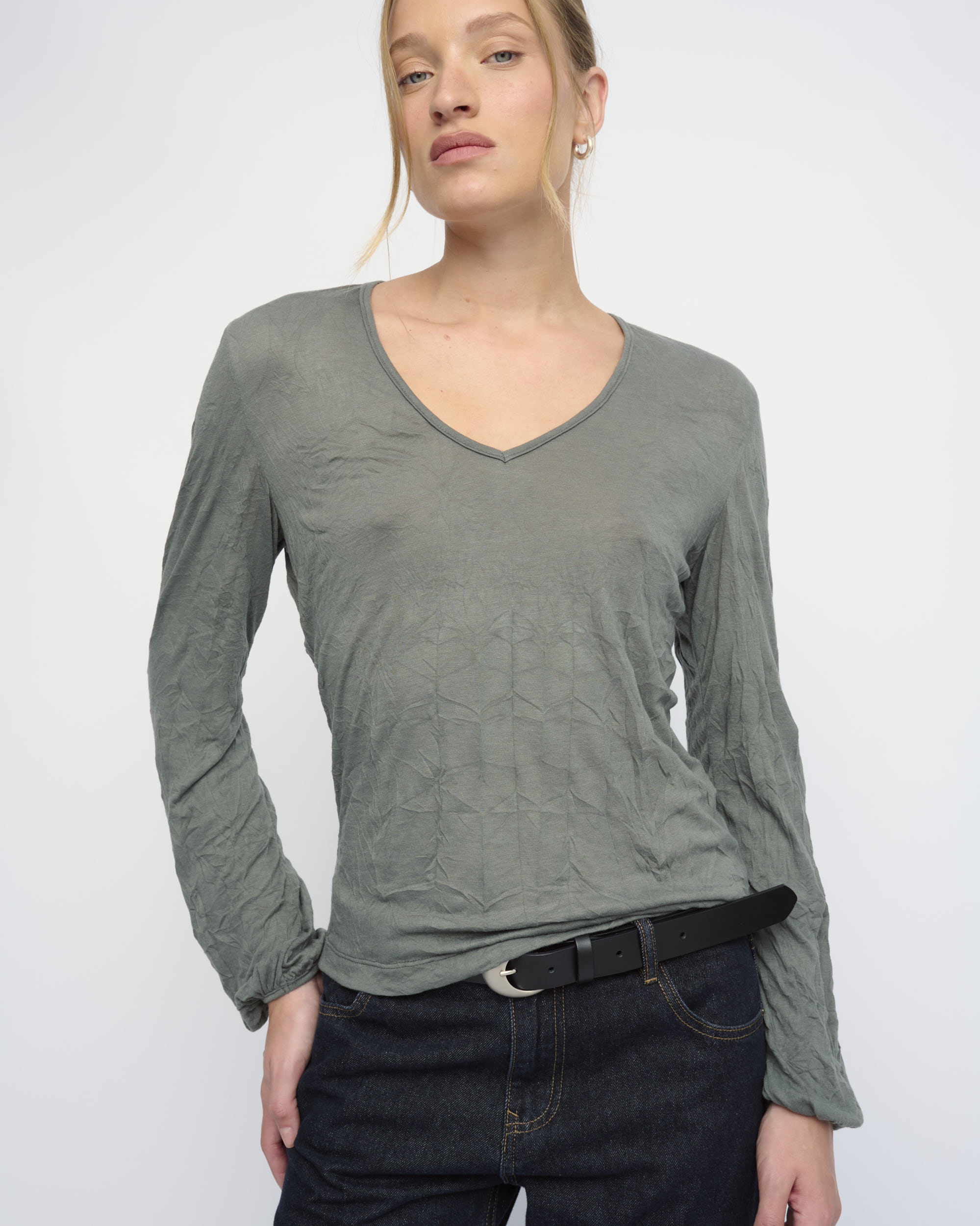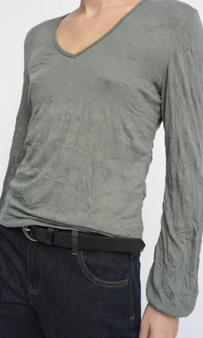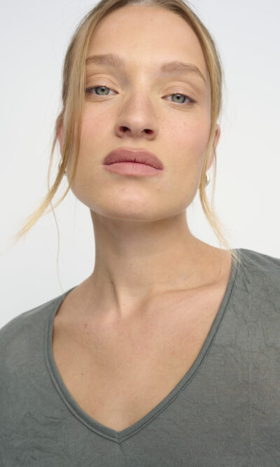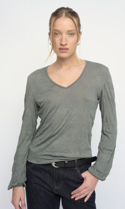 חולצה מסריג ויסקוזה באפקט קימוט. צללית קרובה לגוף. מחשוף וי, שרוולים עם כיווץ עדין במכפלת.