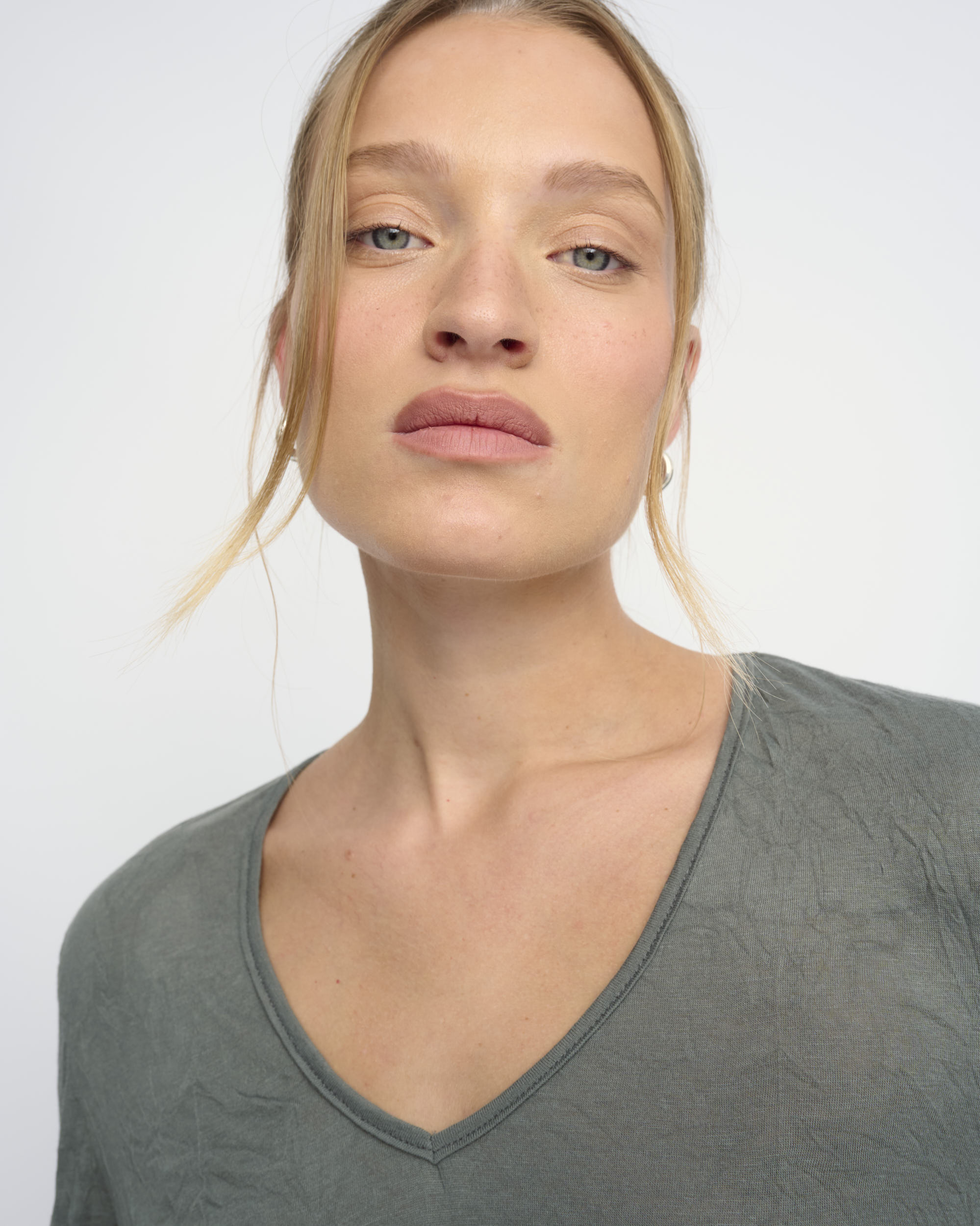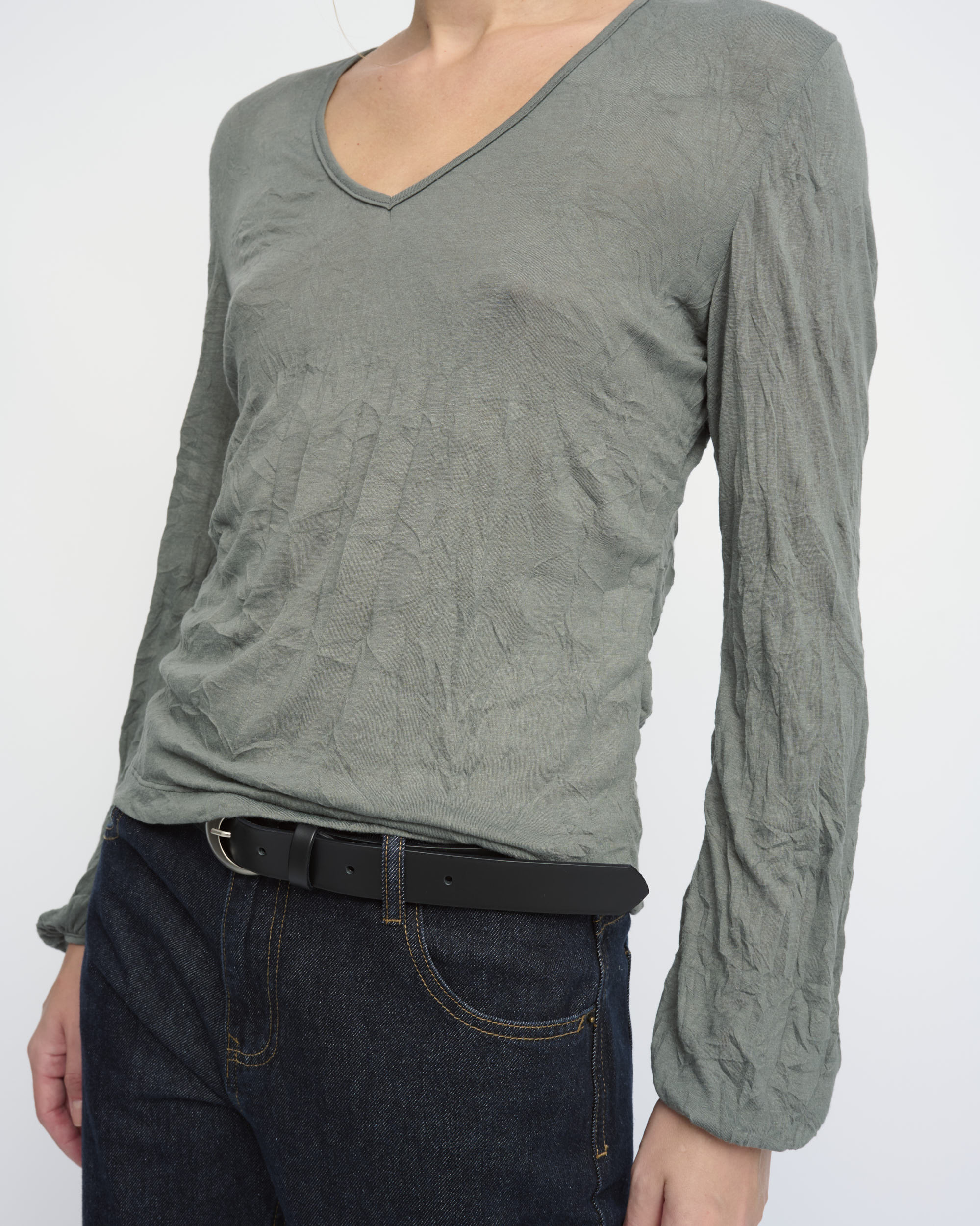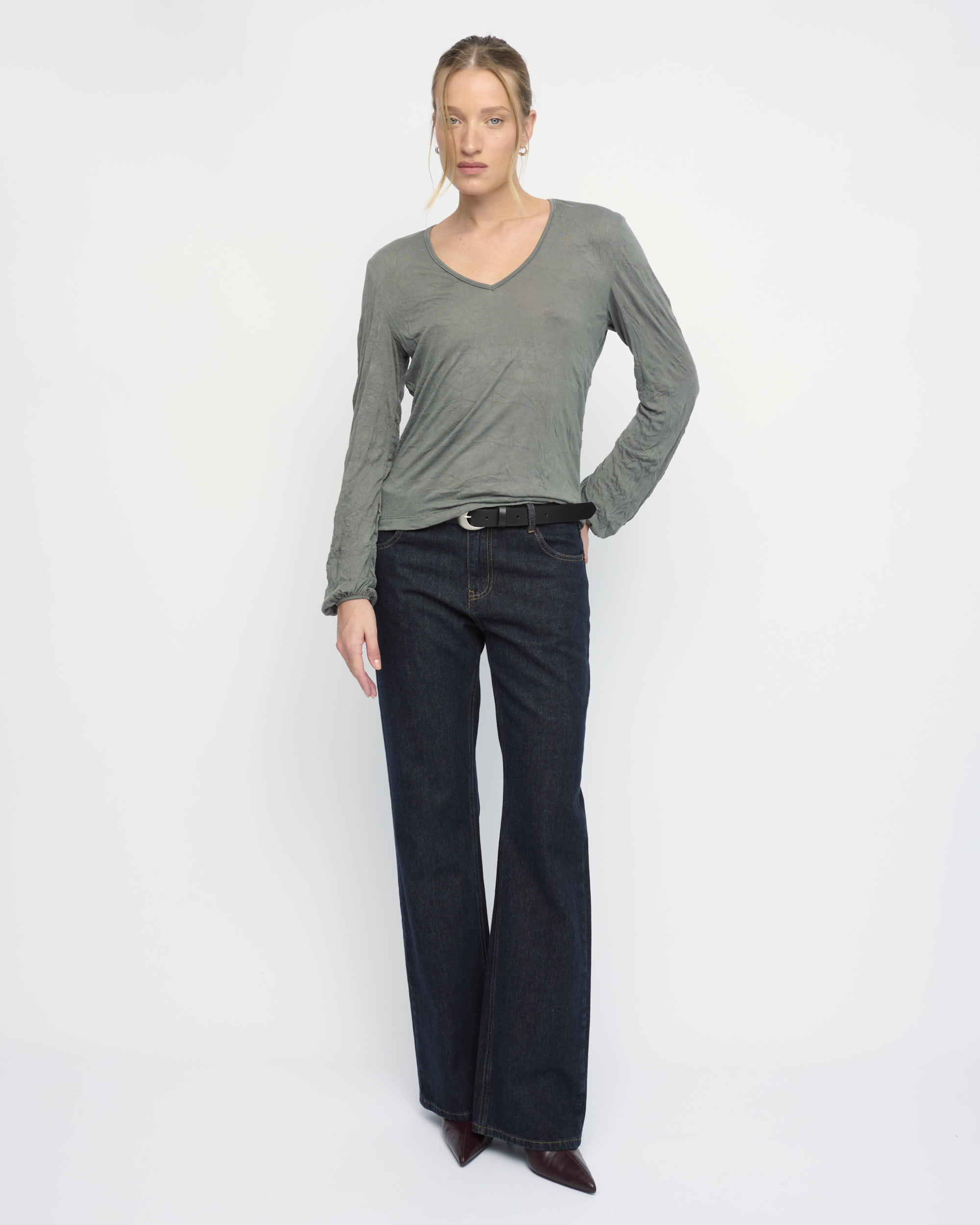 חולצה מסריג ויסקוזה באפקט קימוט. צללית קרובה לגוף. מחשוף וי, שרוולים עם כיווץ עדין במכפלת.