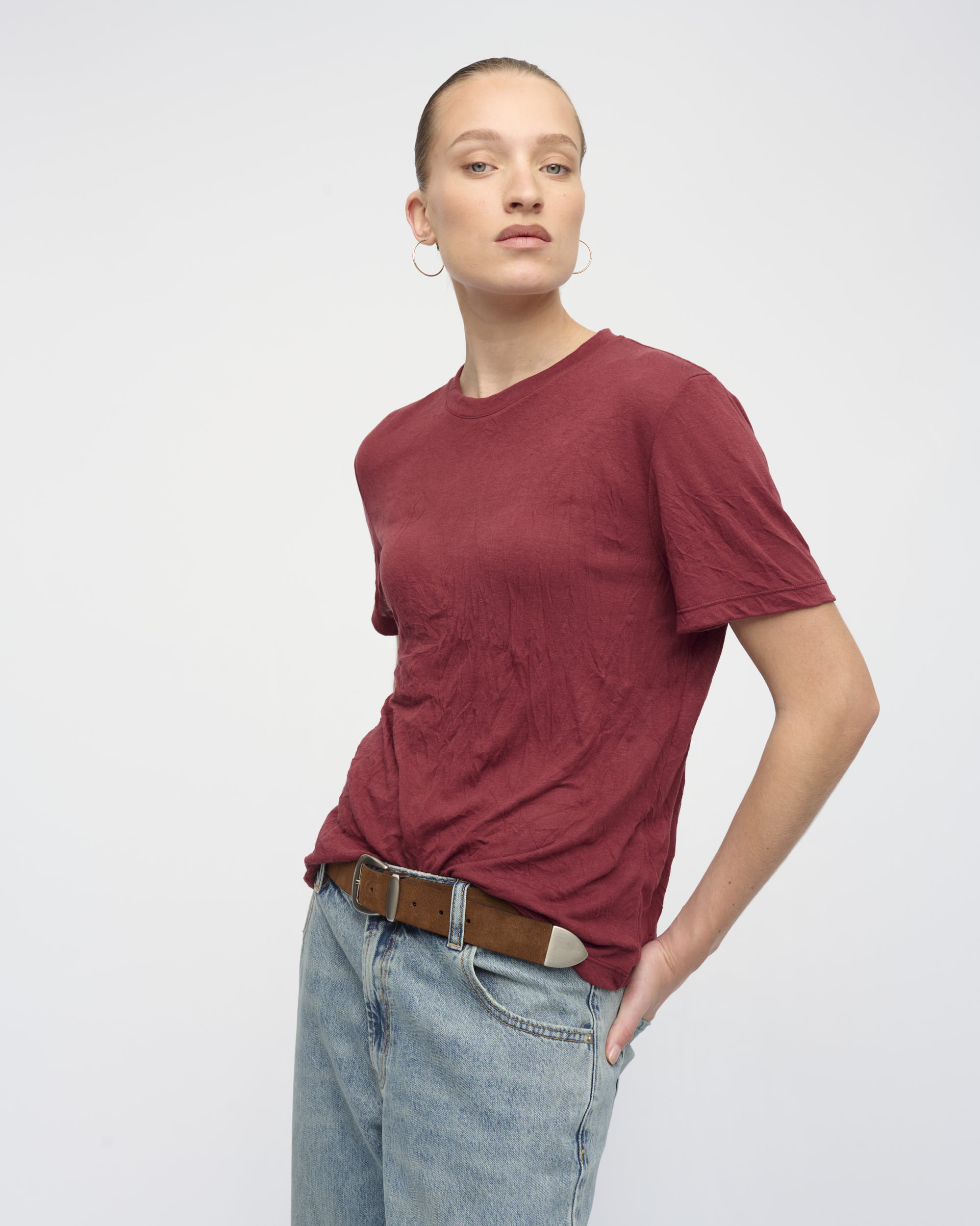 טי שירט מסריג כותנה בטקסטורת קימוט, צללית קלאסית קרובה לגוף. מחשוף עגול.