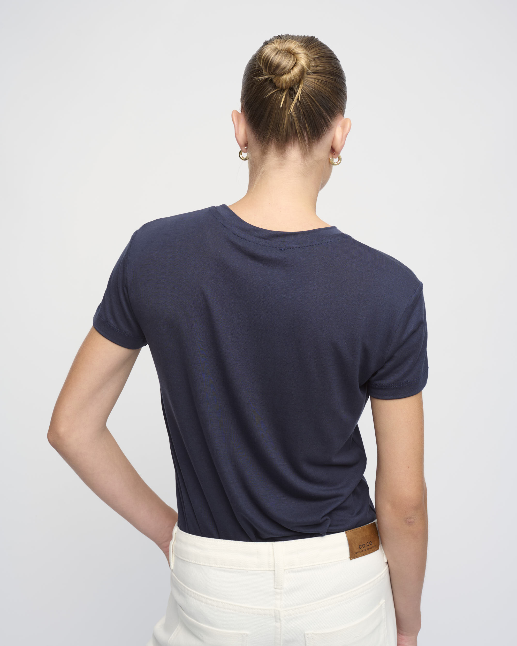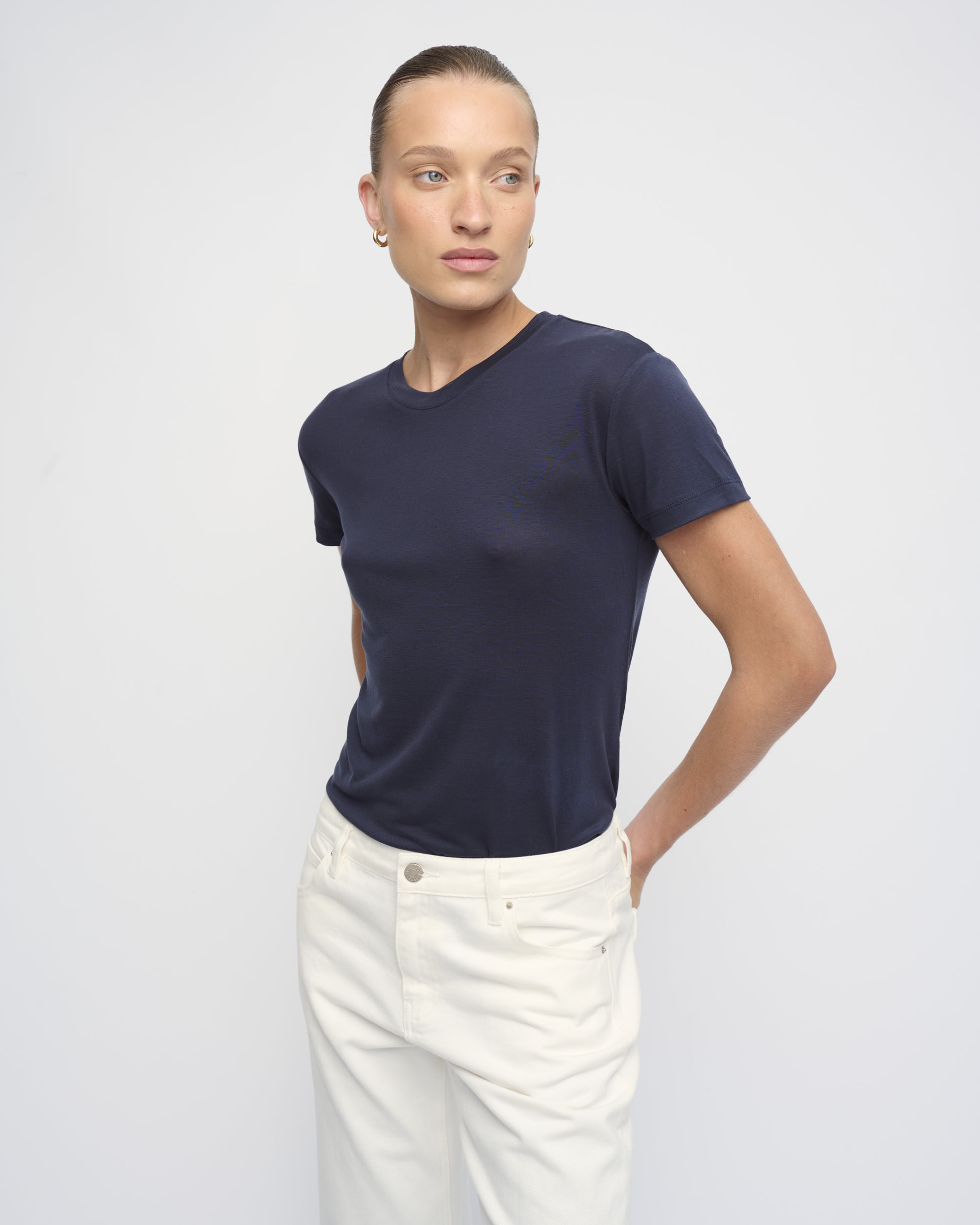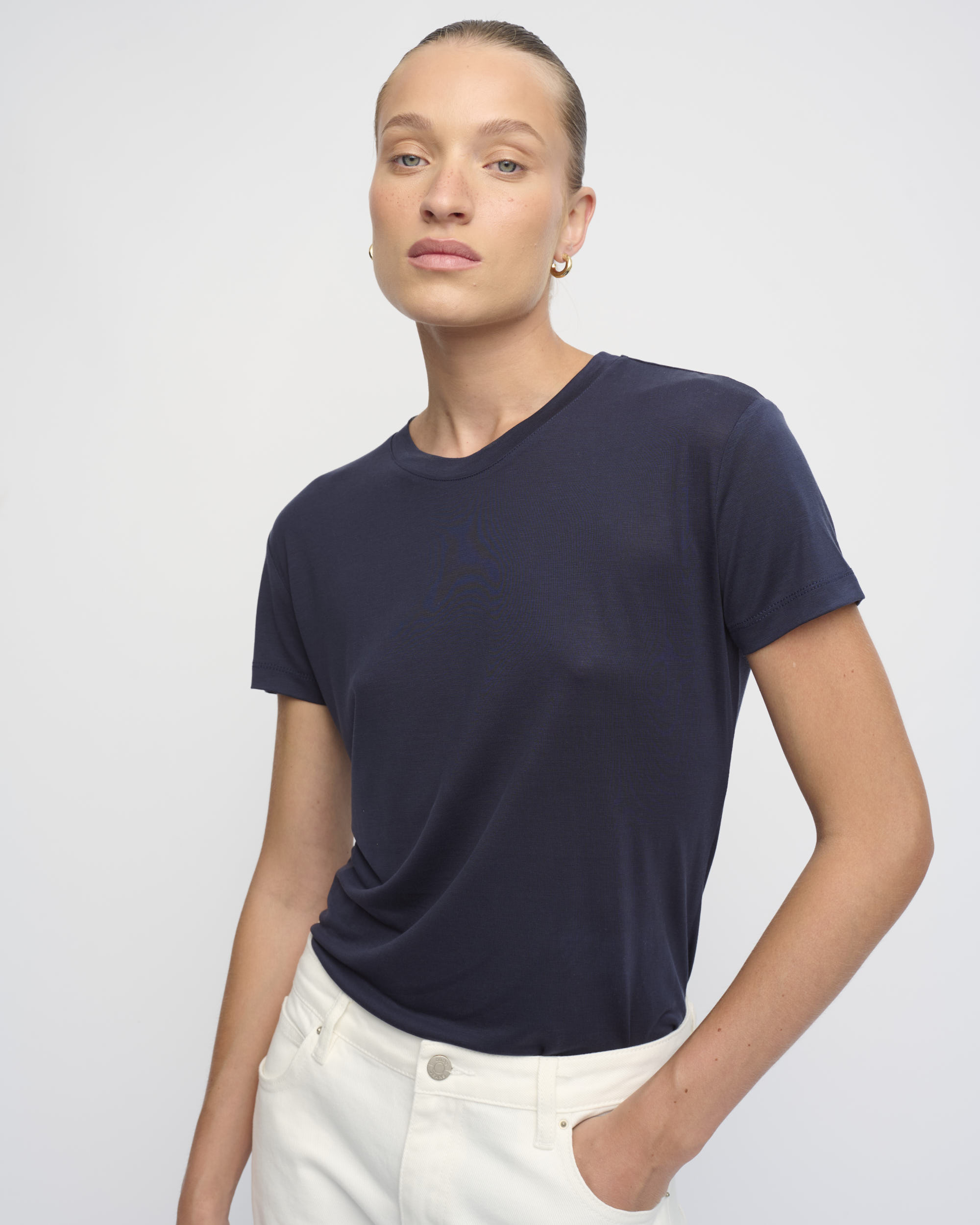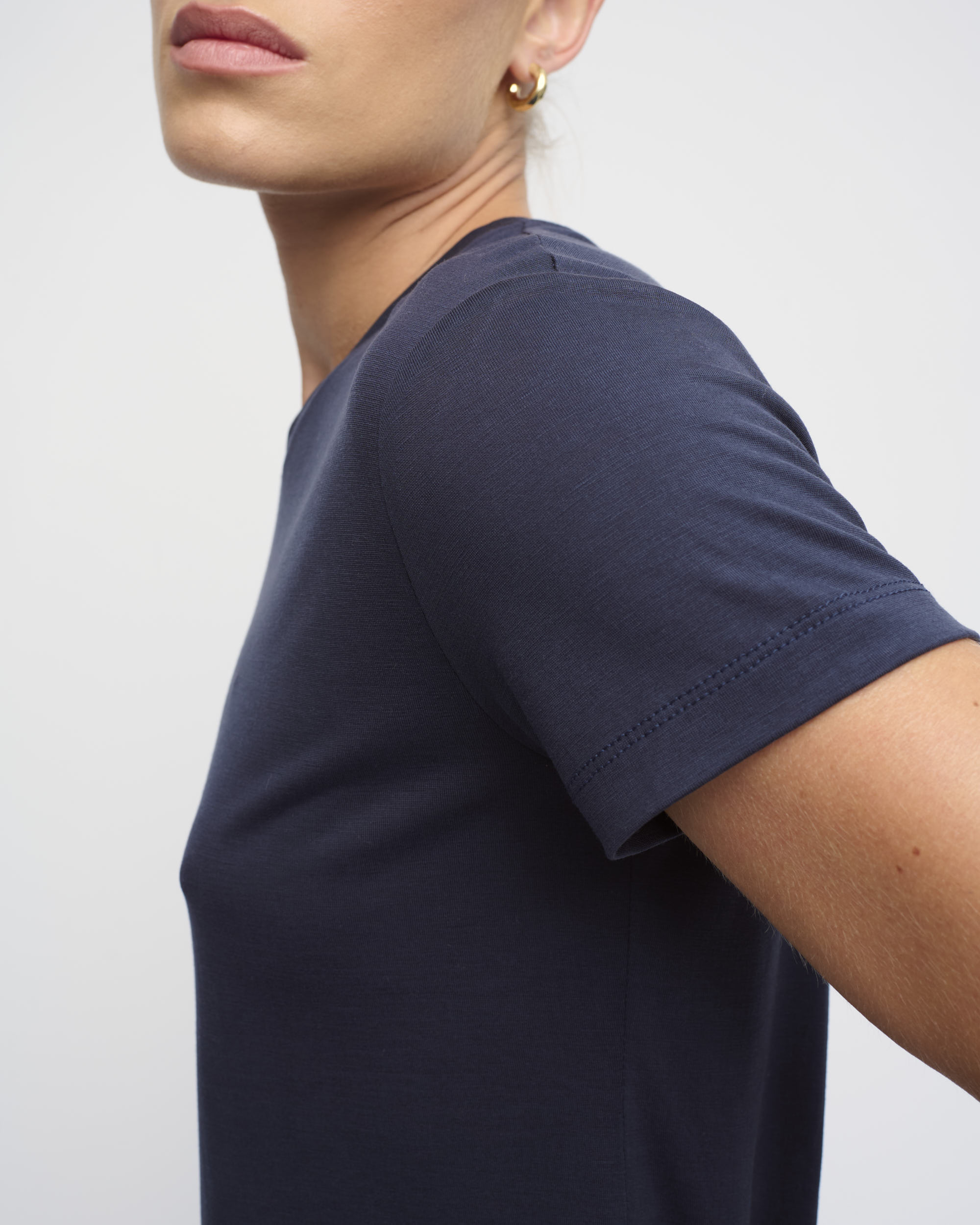 חולצת טי מסריג טנסל דק. צללית נינוחה. שרוול קצר, מחשוף עגול.