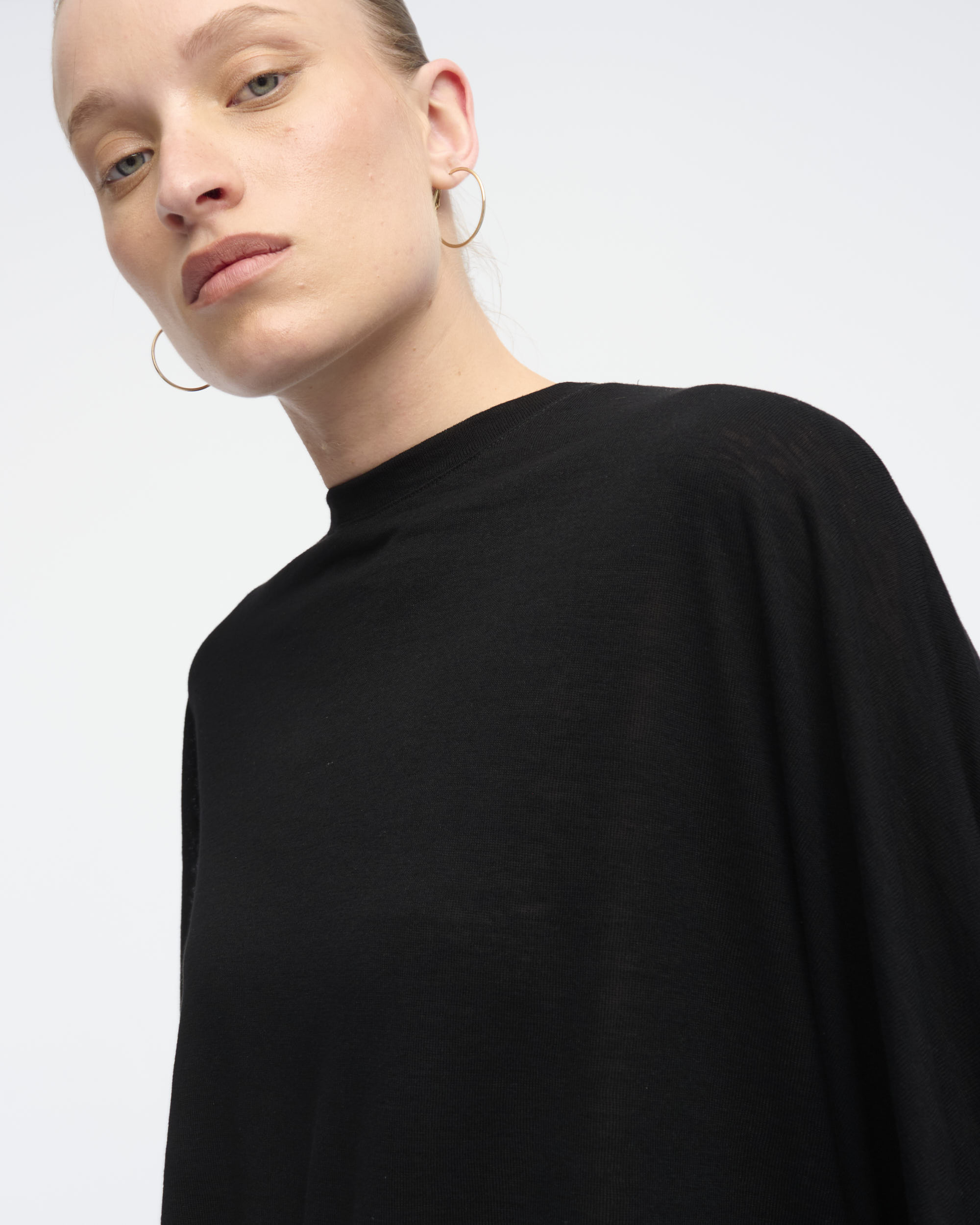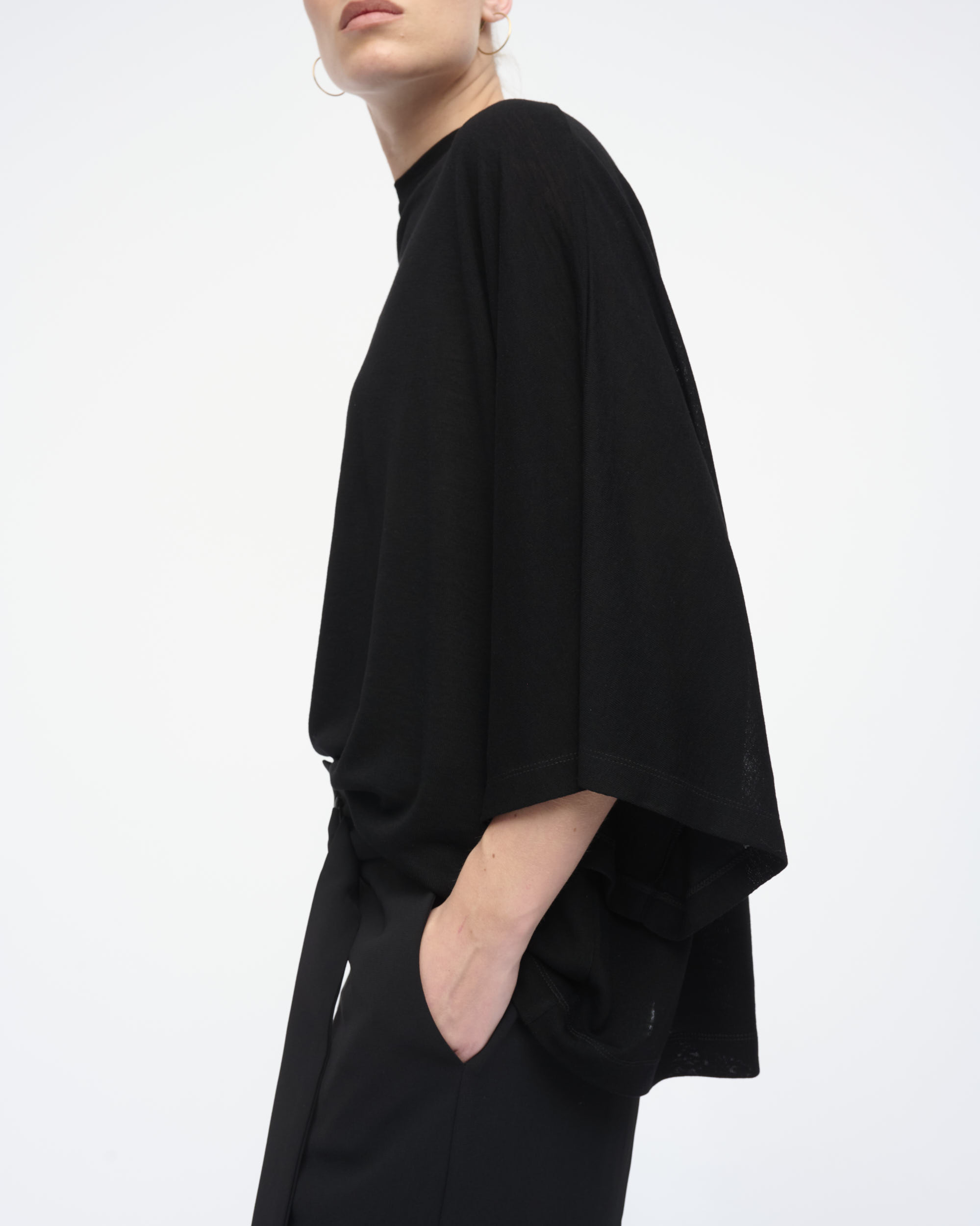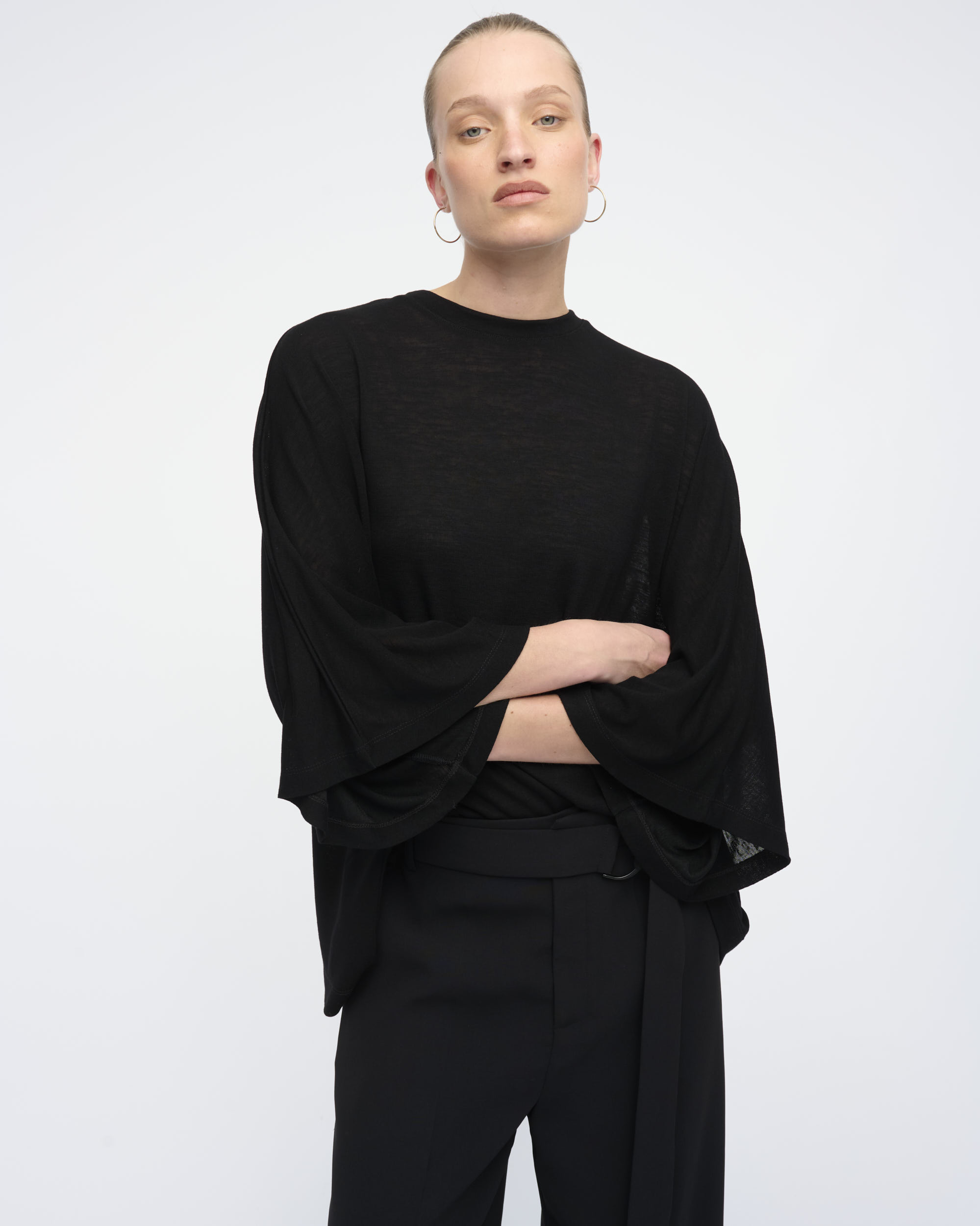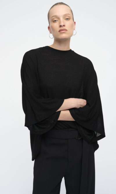 טופ מסריג ויסקוזה. צללית אוברסייז, שרוול קימונו רחב. מחשוף עגול.