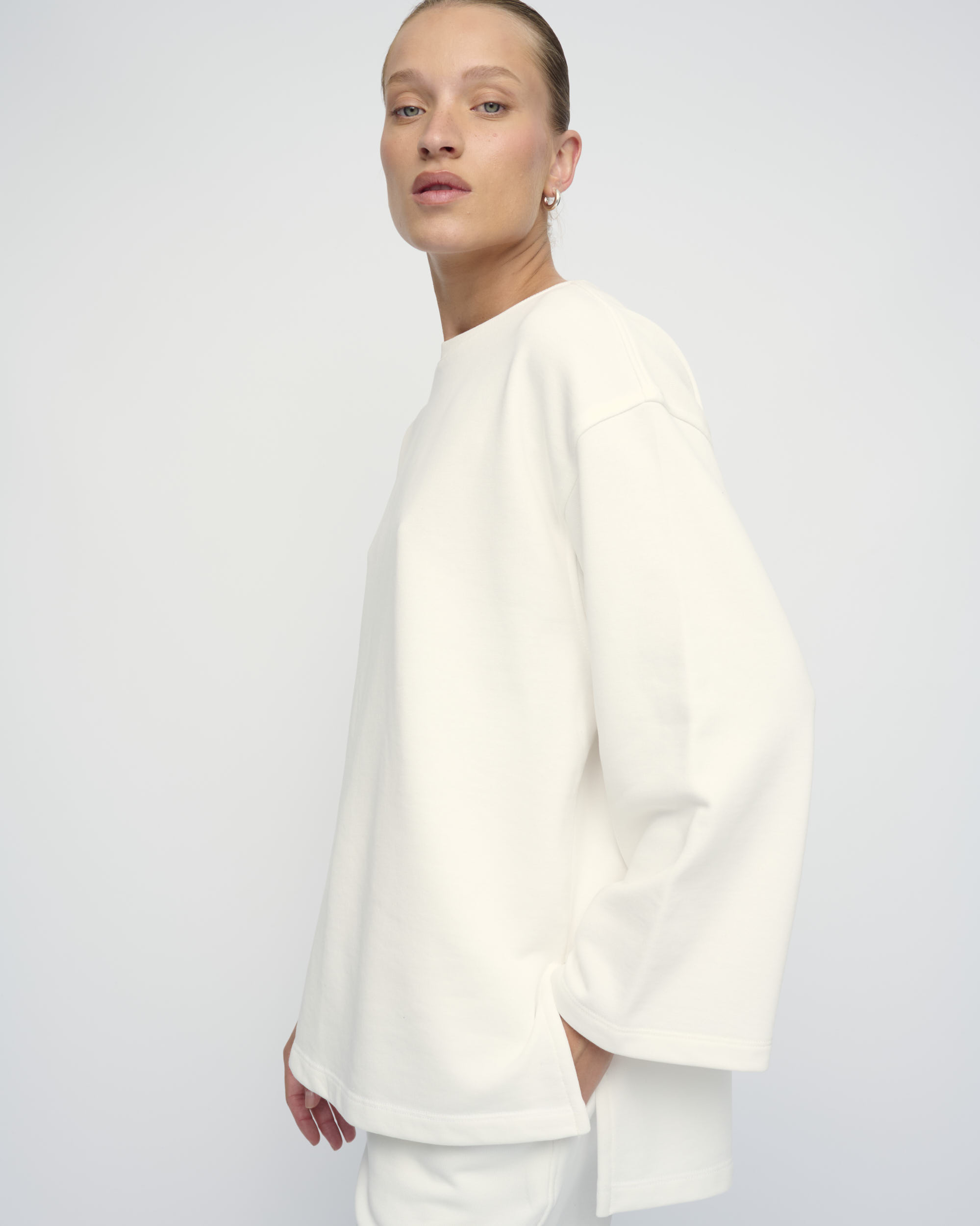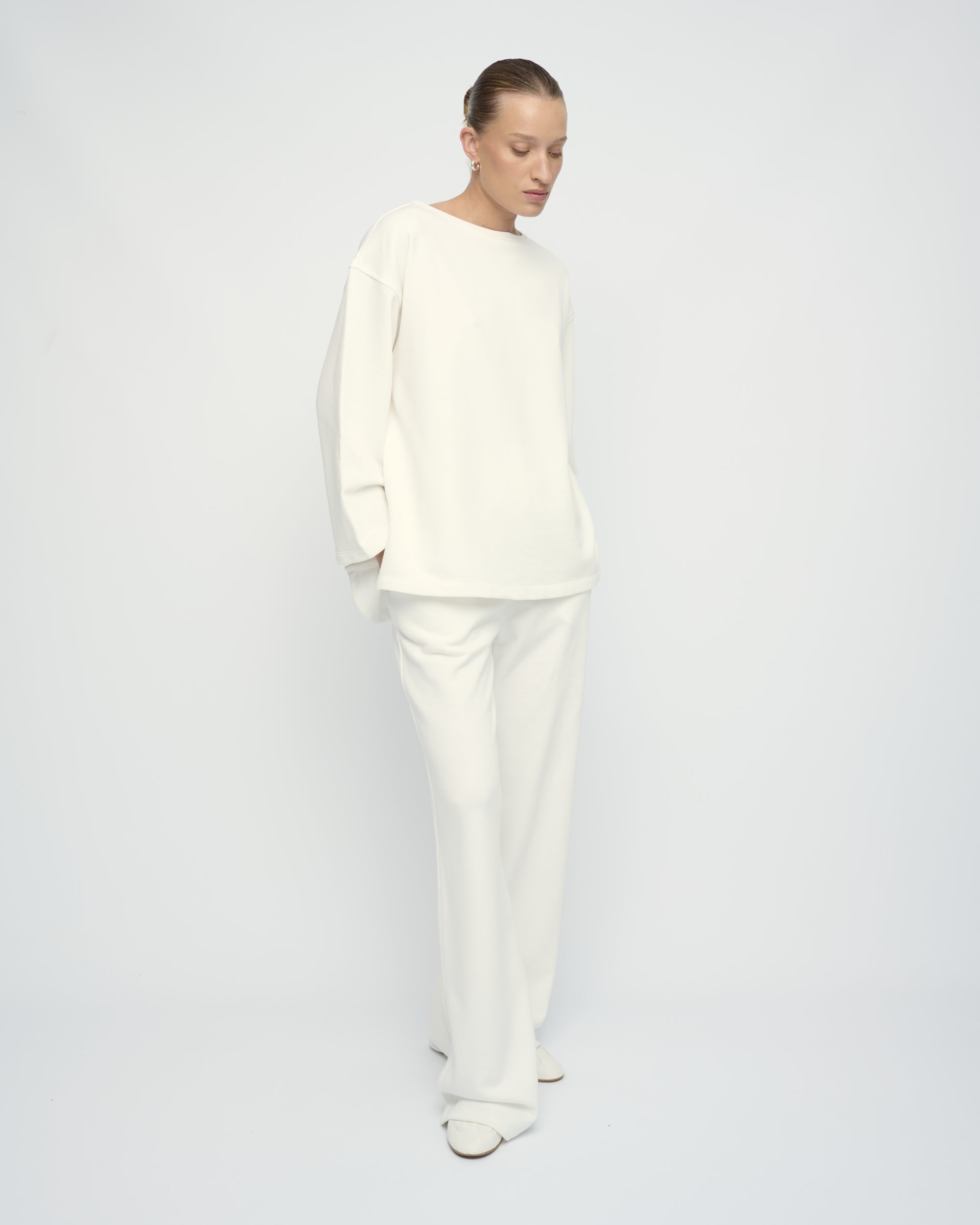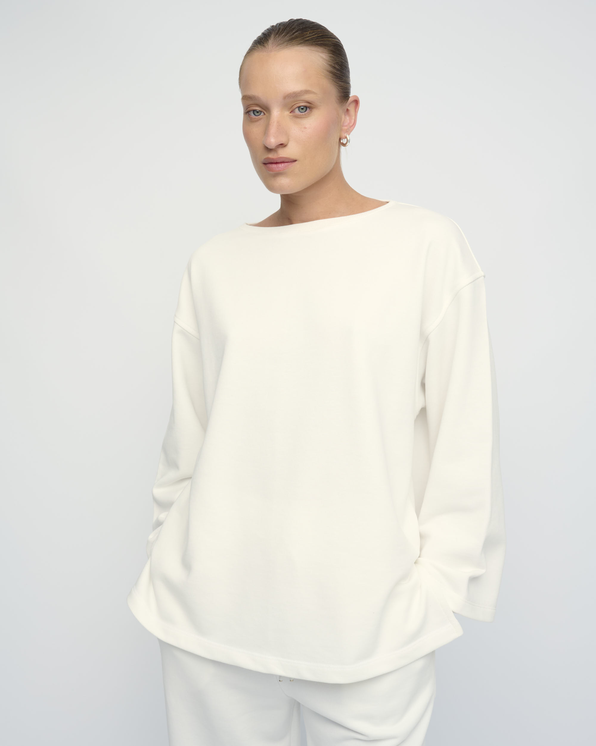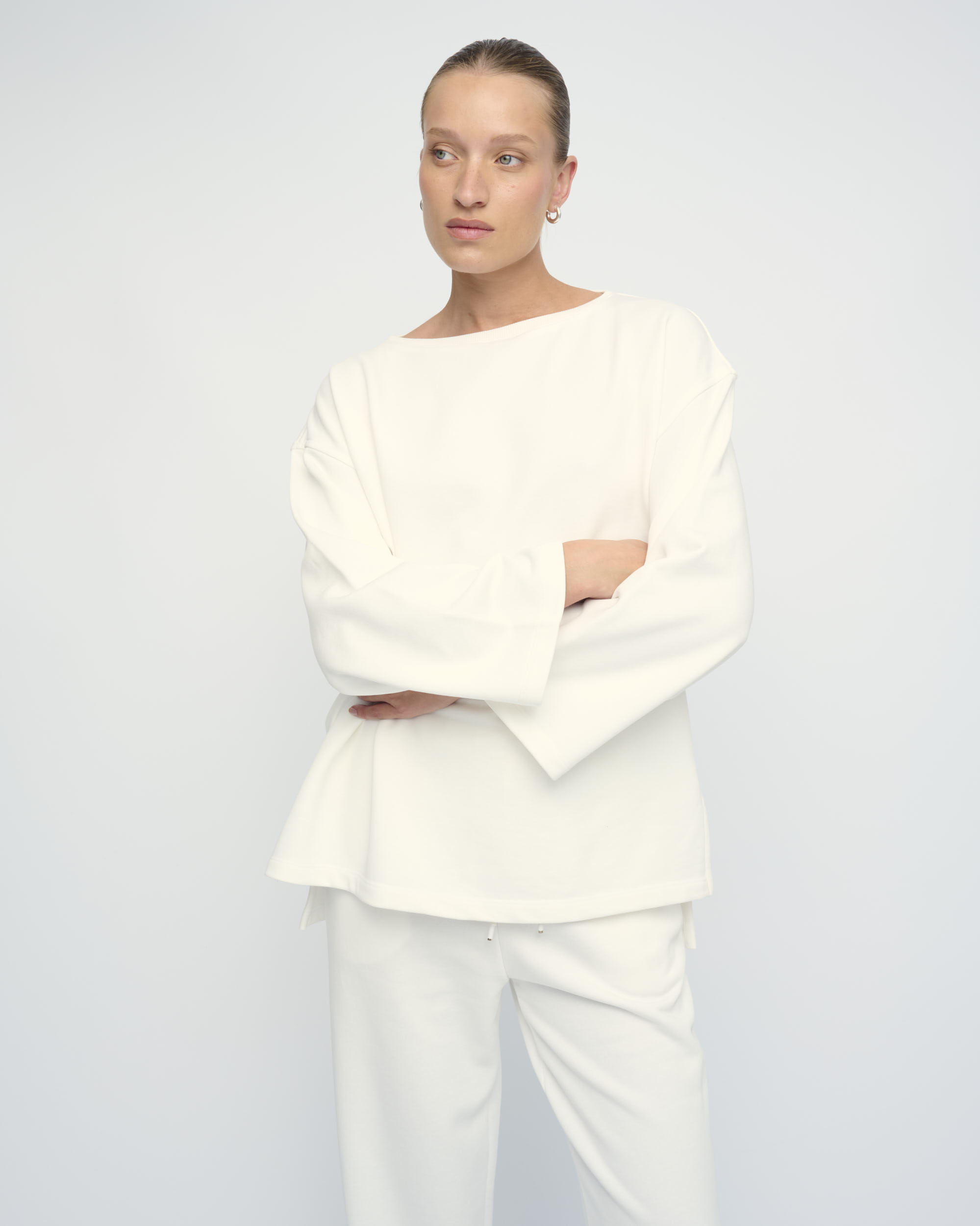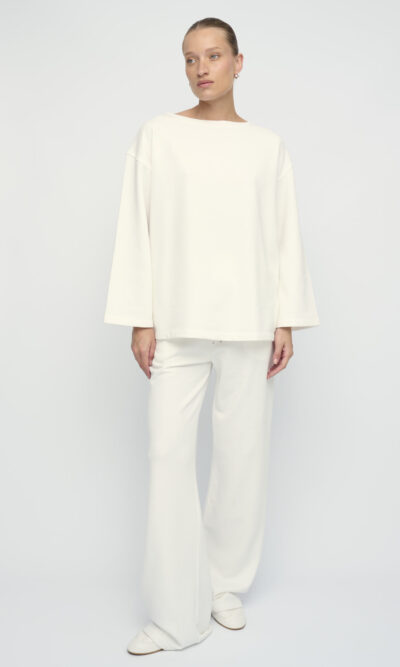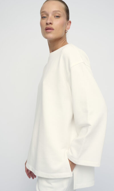 טופ מסריג פרנץ’ טרי כותנה. צללית רחוקה מהגוף, שרוול רחב, מחשוף סירה.