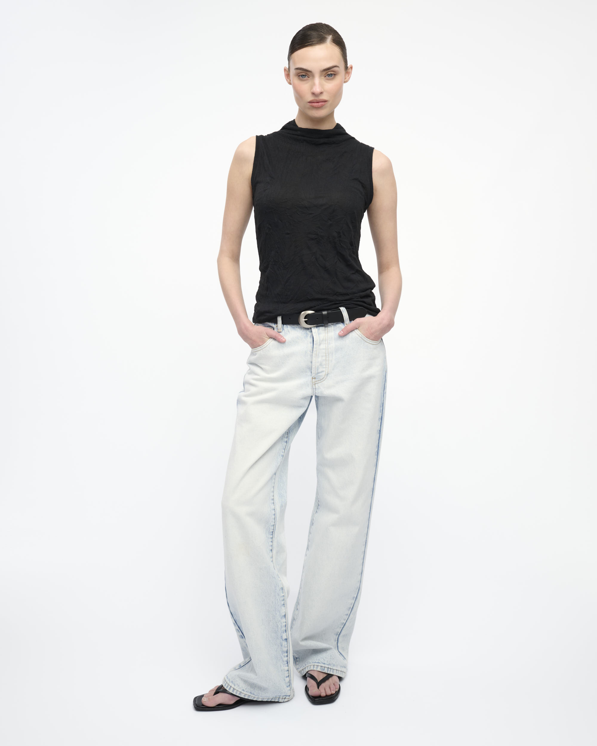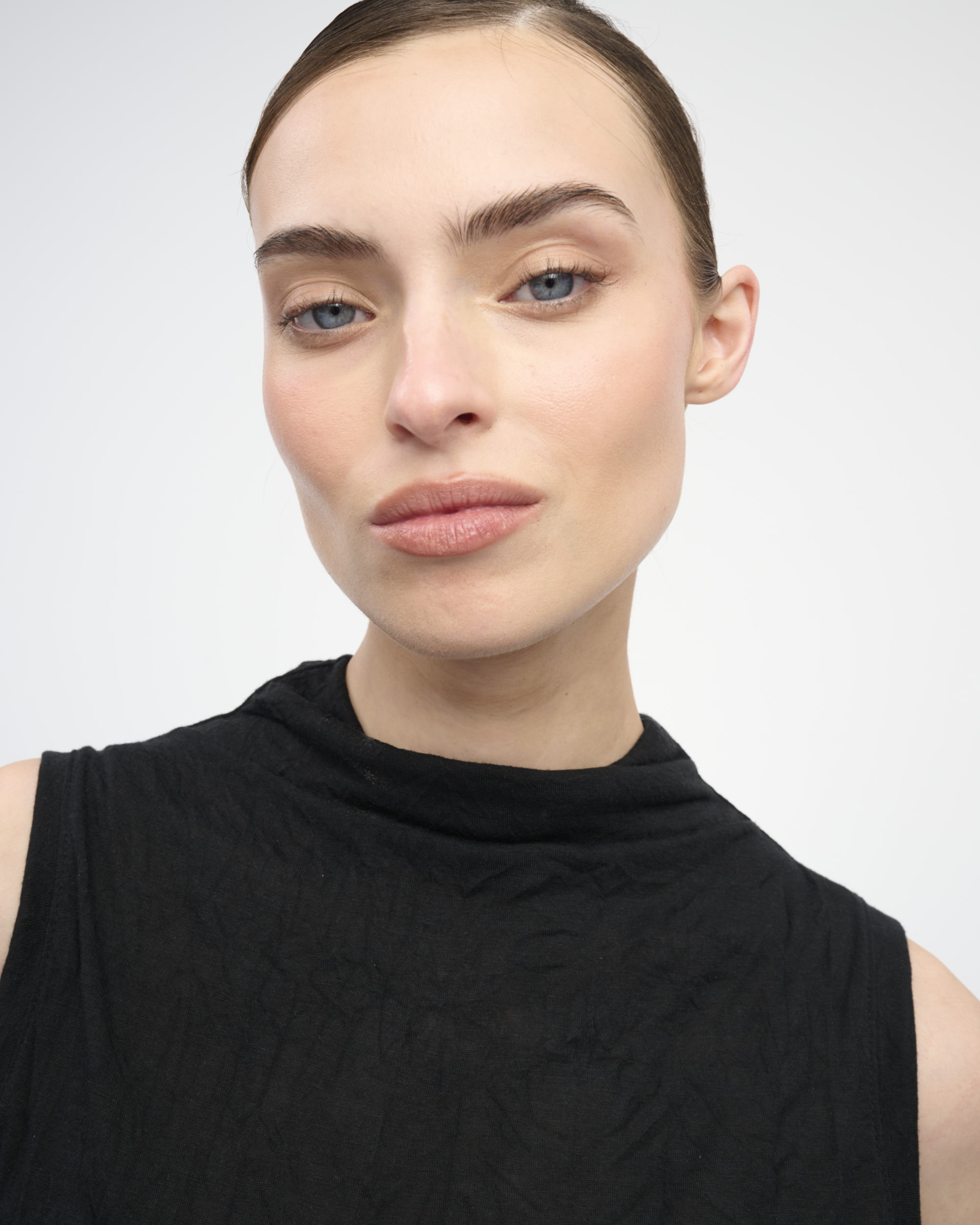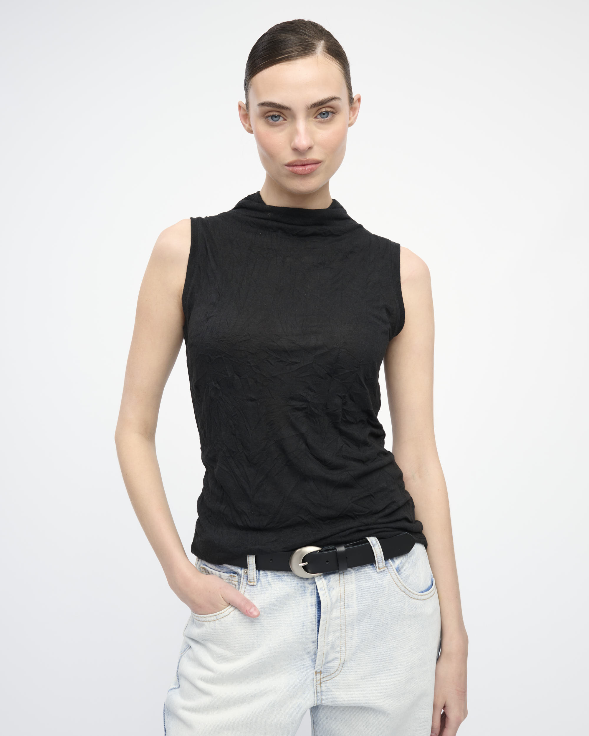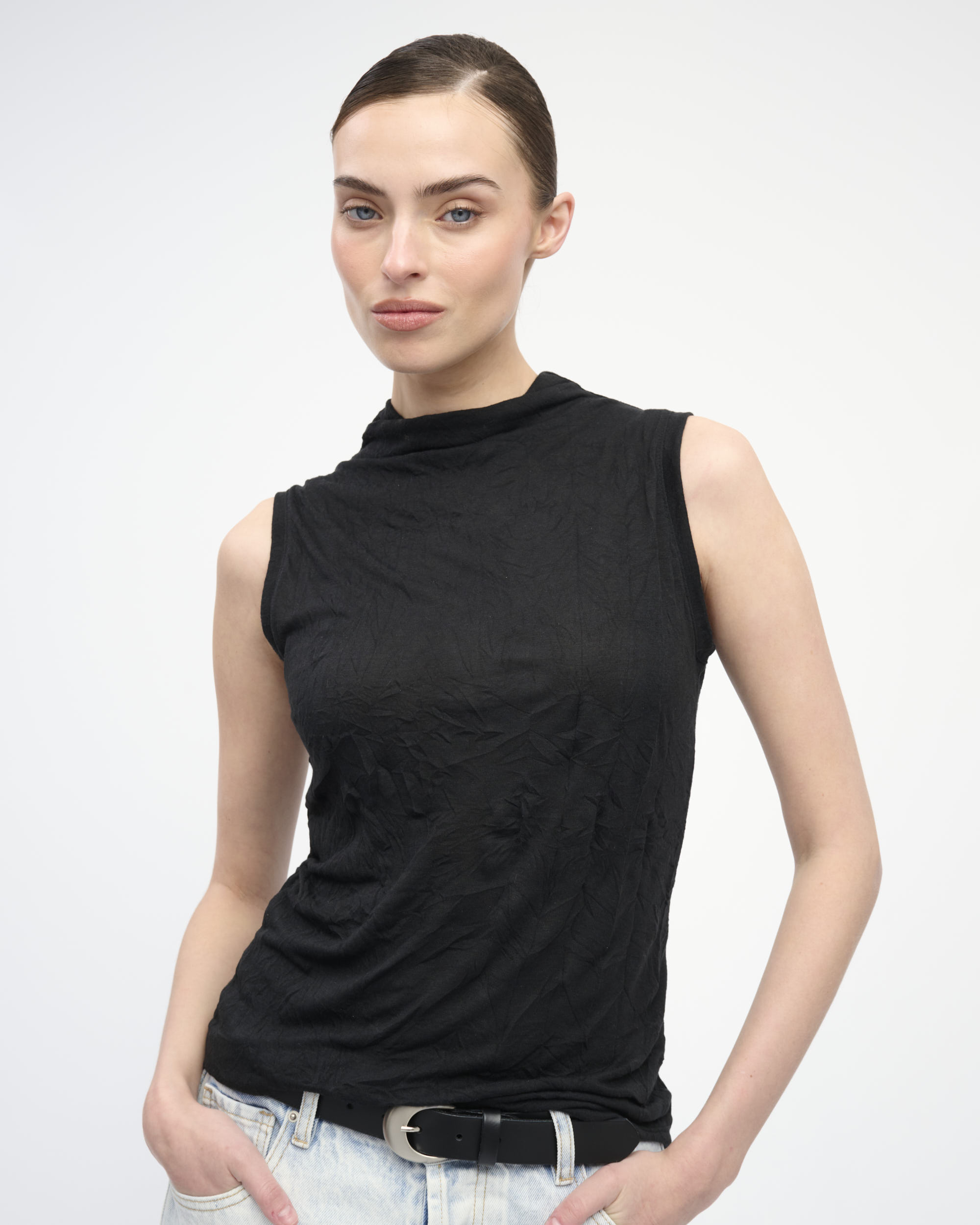 טופ מסריג בטקסטורת קימוט. ללא שרוולים, עם צוארון גבוה.