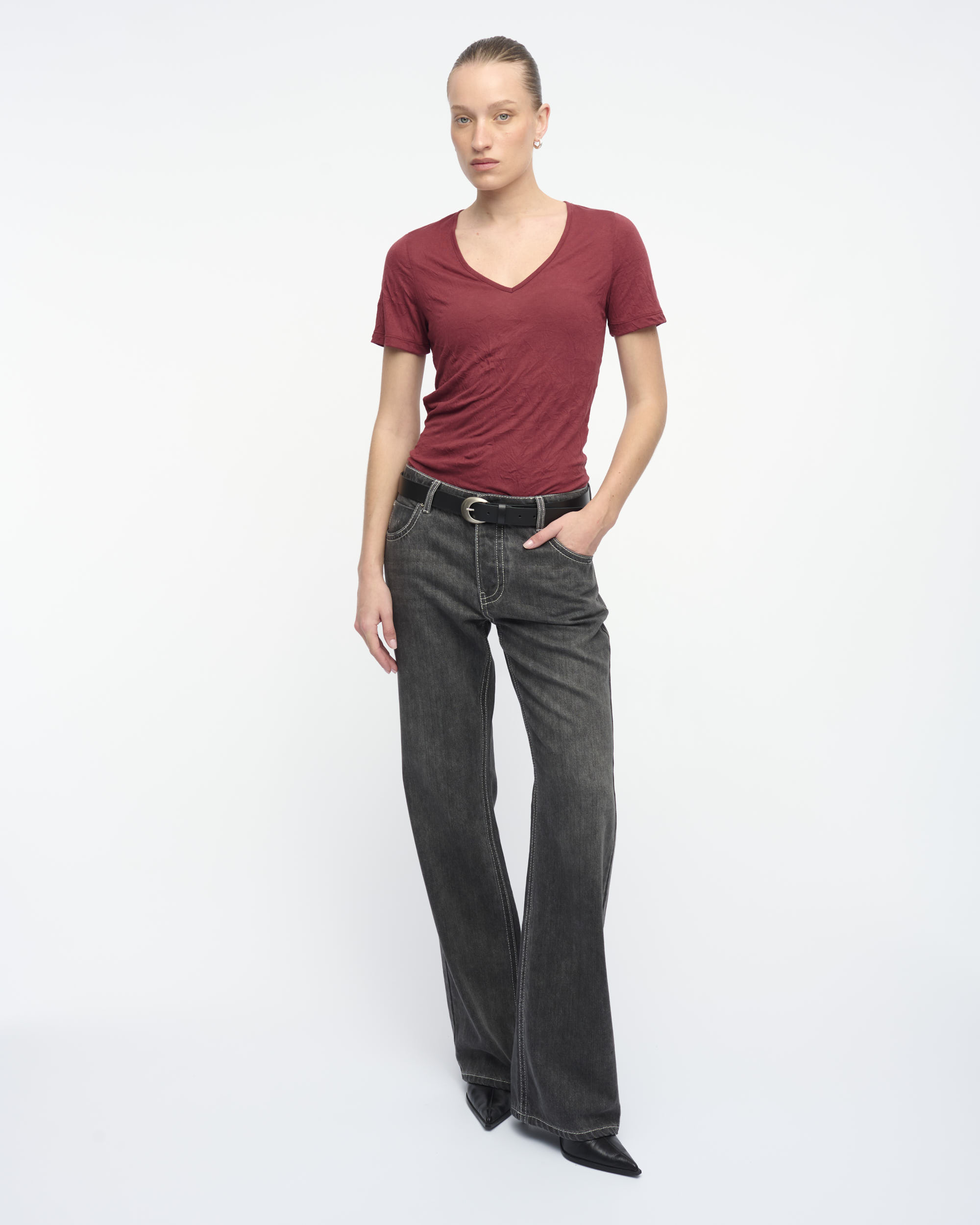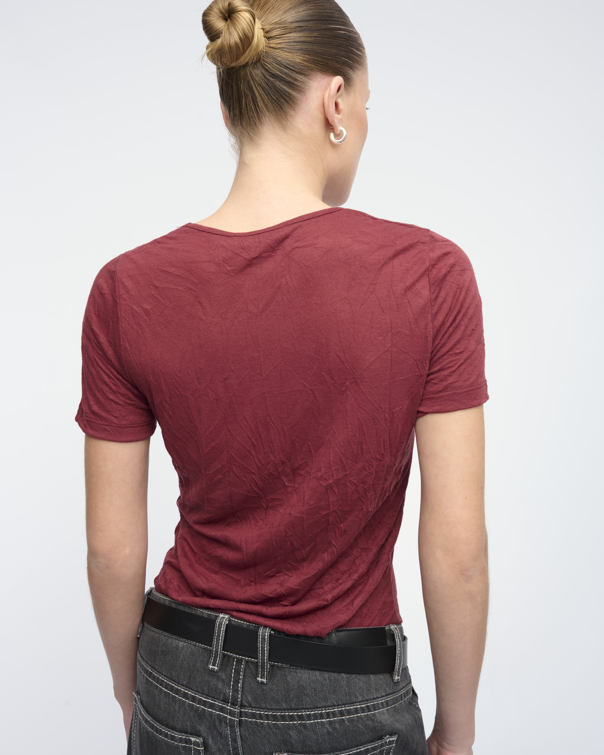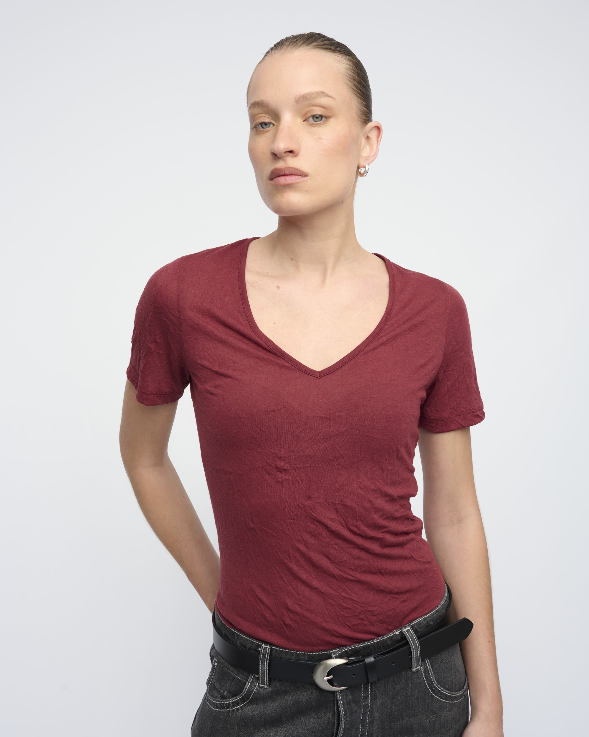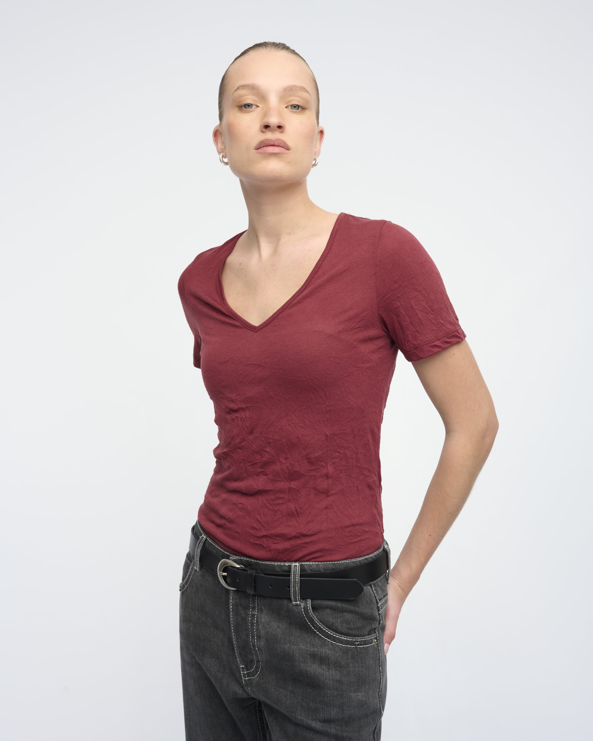 טי שירט מסריג כותנה בטקסטורת קימוט, צללית קלאסית קרובה לגוף. מחשוף וי.